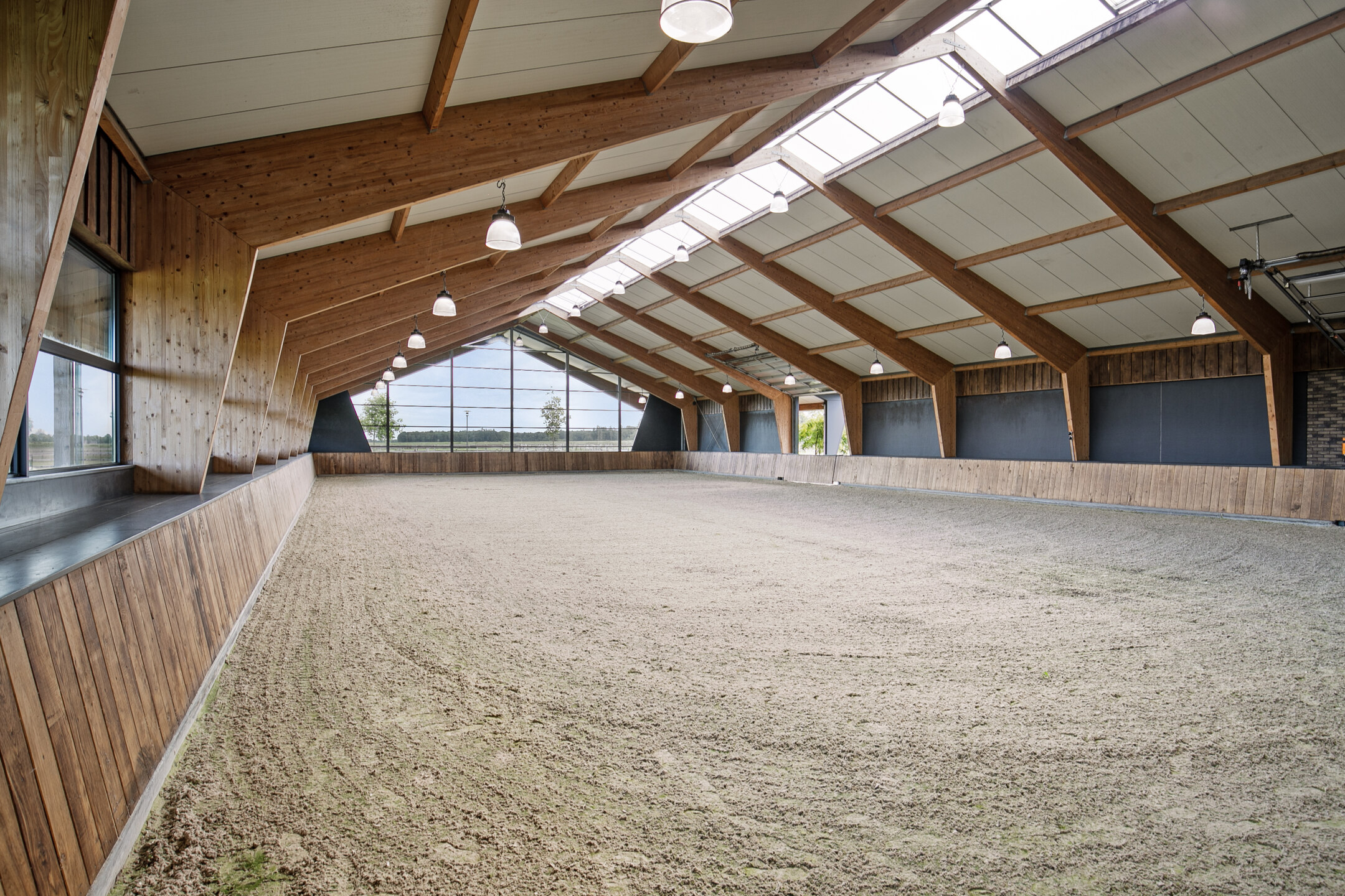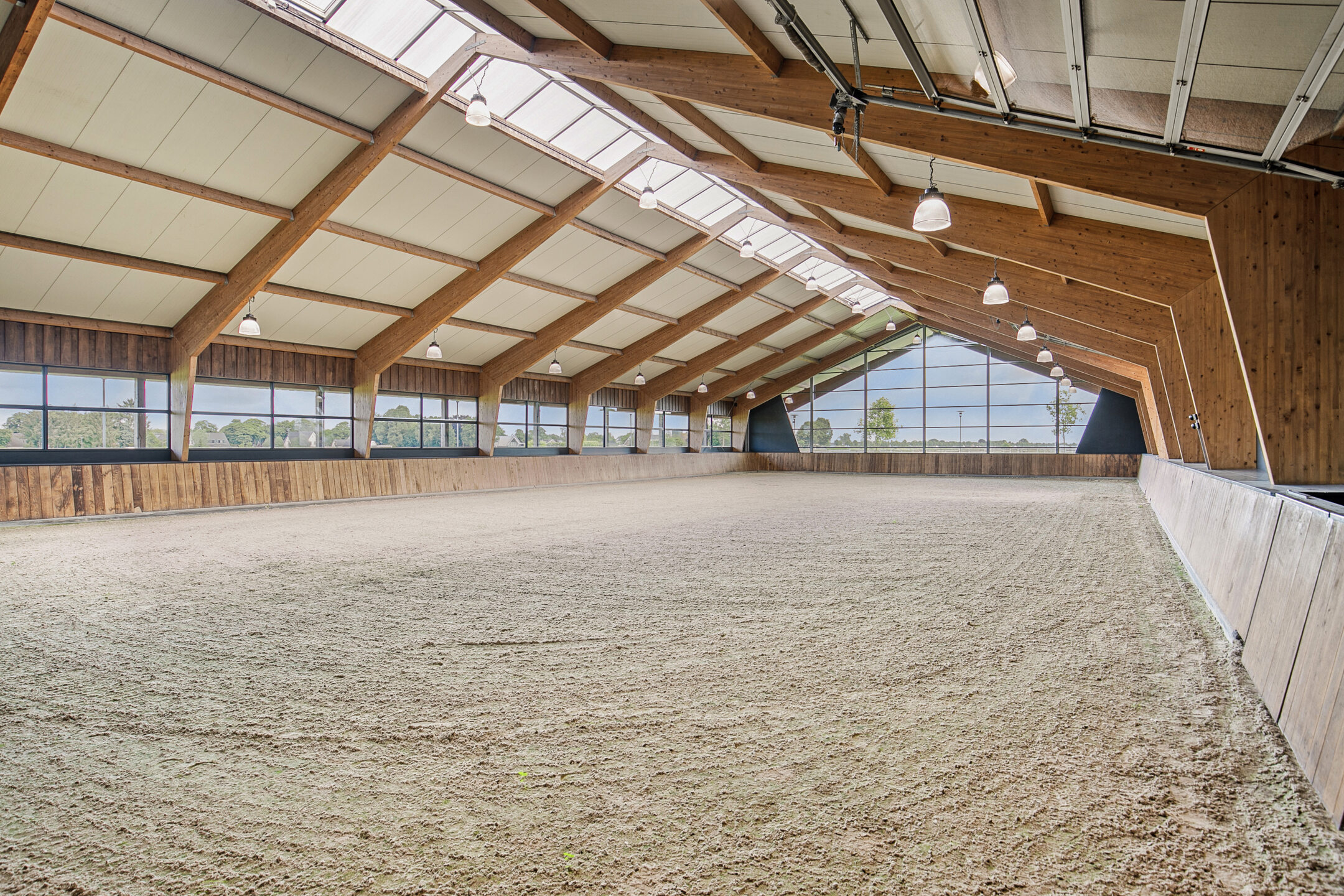 The luxurious reception area offers a beautiful view over the indoor arena through large windows, as well as over the outdoor area with the outdoor arena, lunging circle, horse walker and paddocks. A complete overview! The reception area is accessible from the outdoor arena from the elevated terrace and equipped with a tiled floor with underfloor heating and furnished with a complete bar and a gas fireplace. The bar is equipped with a sink, a dishwasher, coffee machine, combination oven/microwave and a wine fridge. The large exterior windows have electrically operated screens and the acoustic ceiling has recessed lighting. From the reception area, there is direct access to the riding hall with indoor arena. The arena measures approx. 20x40 metres and is fitted with fine wooden rafters and a hardwood arena surround. This arena edge fence can be opened automatically from the stable area, giving direct access to the arena. There is an Equisport ebb and flow floor. The entire end wall consists of imposing windows and the side wall also has plenty of windows. The insulated roof is also equipped with a wide skylight in the ridge. A portal connects the indoor arena and reception area with a toilet room and the multi-purpose room on the 1st floor. The porch has a tiled floor, stucco walls and a stucco ceiling. There is a fixed sink with a cabinet and a storage cupboard offers plenty of storage space. The fully tiled toilet room is equipped with a floating toilet and urinal. The multi-purpose room on the first floor is finished with a PVC floor, stucco walls and a ceiling of insulation panels. Here, too, room-high windows in the rear façade offer a nice view of the outdoor arena, paddocks and other facilities. Next to the indoor arena is a spacious technical room. This is where the sprinkler system, the ebb and flow system, the central heating combi boilers, the unit for the solar panels and the floor heating, as well as the meter cupboard are located.The beautifully finished stable area exudes ambiance and warmth due to the frequent use of wood. The stable is equipped with 12 horse stalls, 2 washing rooms, a tack room, canteen, a laundry room and a toilet room. At the rear of the stable area is a large storage and stabling area, where there are also 2 rearing stalls and a fixed staircase provides access to the attic and mezzanine above the stalls. The horse boxes (approx. 3.50x3.50 m) are fitted with partly hardwood, partly stainless steel and partly powder-coated and lowered front walls with hinged doors. All stalls have an outside hatch. The washing areas are finished with a rubber floor and fully tiled walls. There is also a solarium.The stable area has a floor of baked bricks, wooden rafters and an insulated roof. A large skylight has been installed in the ridge of the roof. Large, translucent roller doors provide access to the surrounding yard. The tack room is furnished with custom-made cupboards, saddle supports and a sink. The room is finished with a tiled floor and panelled walls. The canteen has a tiled floor, wallpapered walls and a wooden beam ceiling. The canteen has kitchen equipment, which is equipped with a sink, fridge and dishwasher. The partly tiled toilet room is equipped with a floating toilet and a hand basin. The laundry room has connections for washing equipment and the installation of the solar panels. The room is finished with a tiled floor. The storage and stabling area is accessible from the stable area through sliding doors and also offers space for 2 rearing stables. A fixed staircase provides access to the attic space and mezzanine on the 1st floor. The rearing stables are equipped with partly hardwood, partly galvanised front and partition walls. The loft area is equipped with fixed cupboards with plenty of storage space and the flybuster system. The attic is finished with a wooden floor.