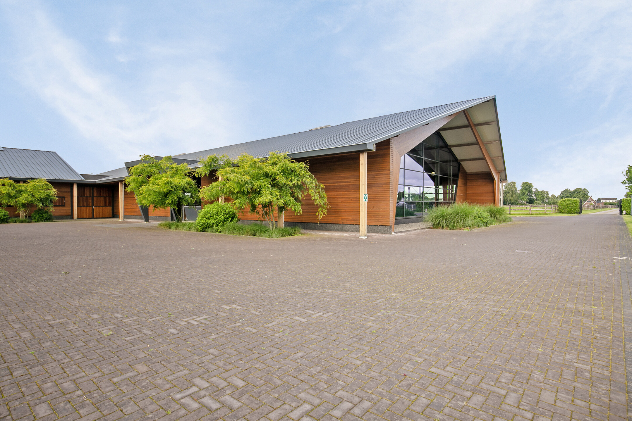 The outside grounds at the rear of the property are equipped with an outdoor arena, a horse walker, a lunging circle, manure pit and paddocks. The entire yard is paved with baked clinkers. The outdoor arena measures approx. 30x60 metres and has an Equisport ebb and flow riding surface. The arena is fenced off with a beech hedge. The horse walker is suitable for 4 horses and has a wooden fence. The sandy soil is mixed with flakes. The lunging circle is equipped with an ebb and flow riding surface and a wooden fence. There are 2 paddocks, which are equipped with a drained sandy soil and a wooden fence. Pastures are located around the accommodation and fenced with wood. Extension of pasture land is possible by buying or leasing neighbouring plots.