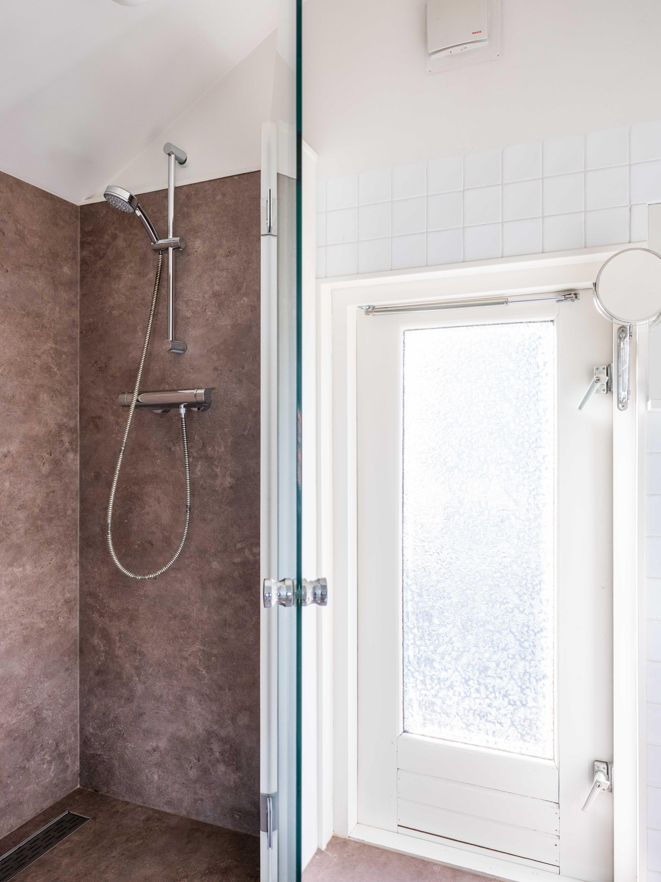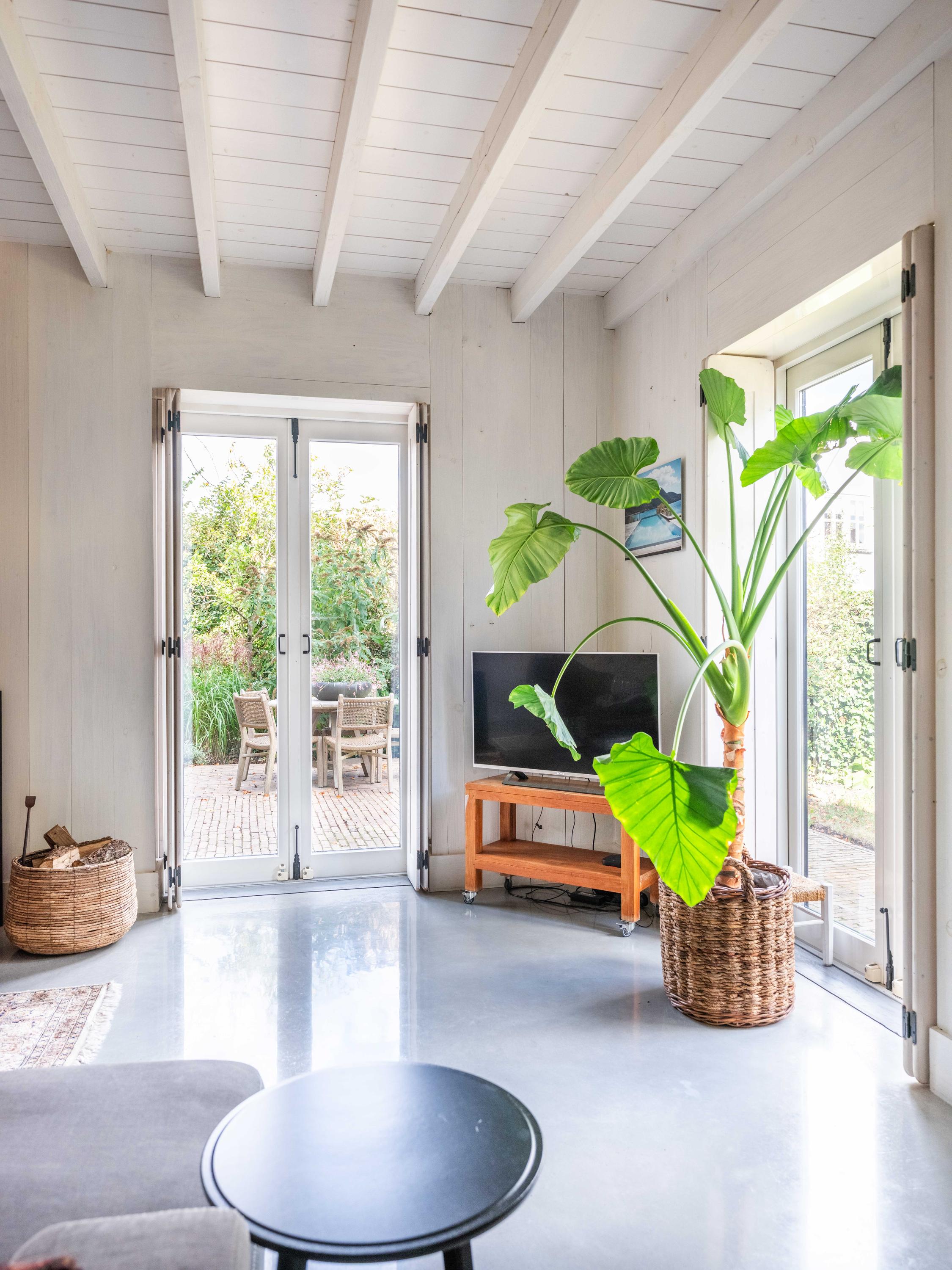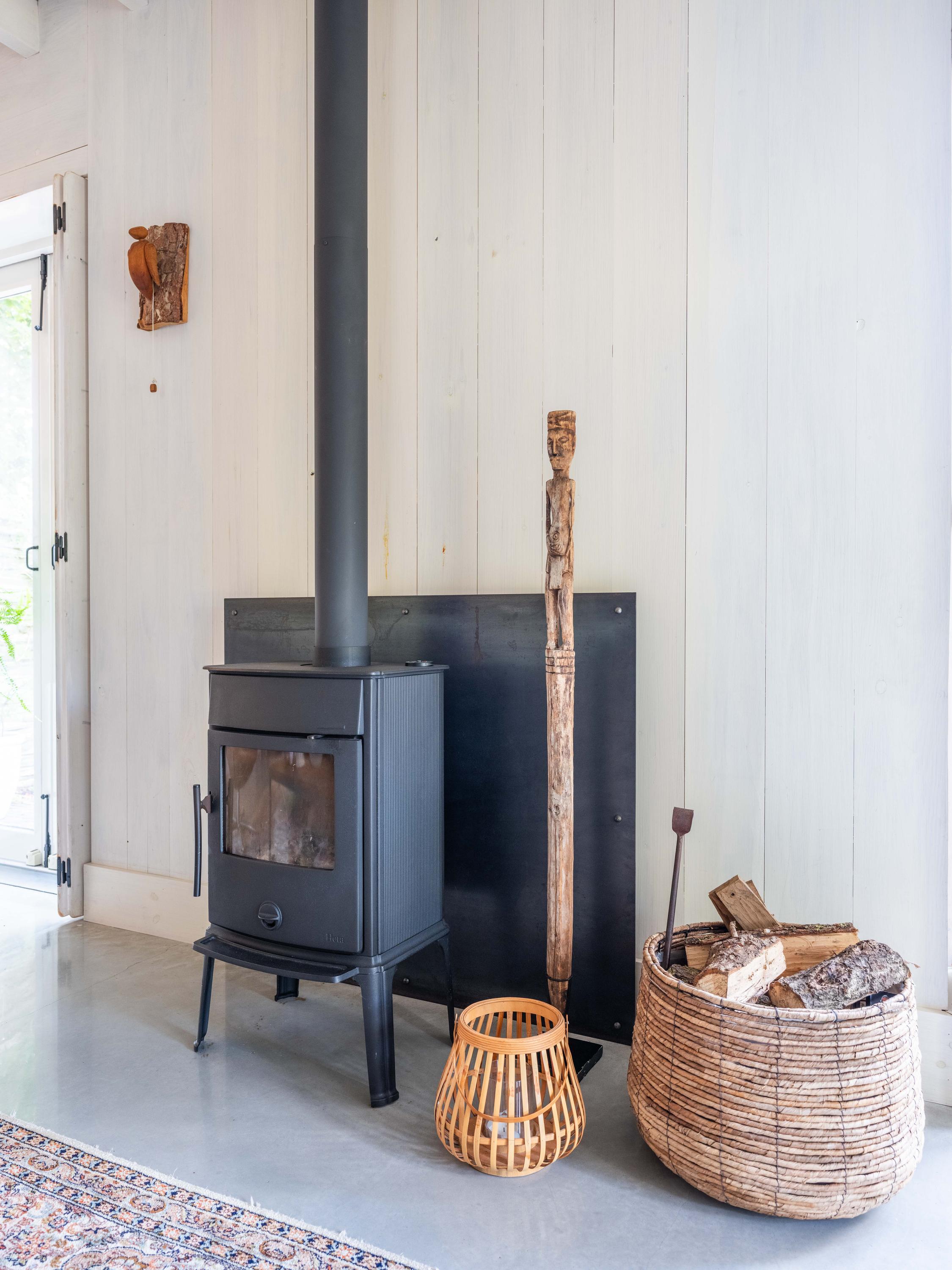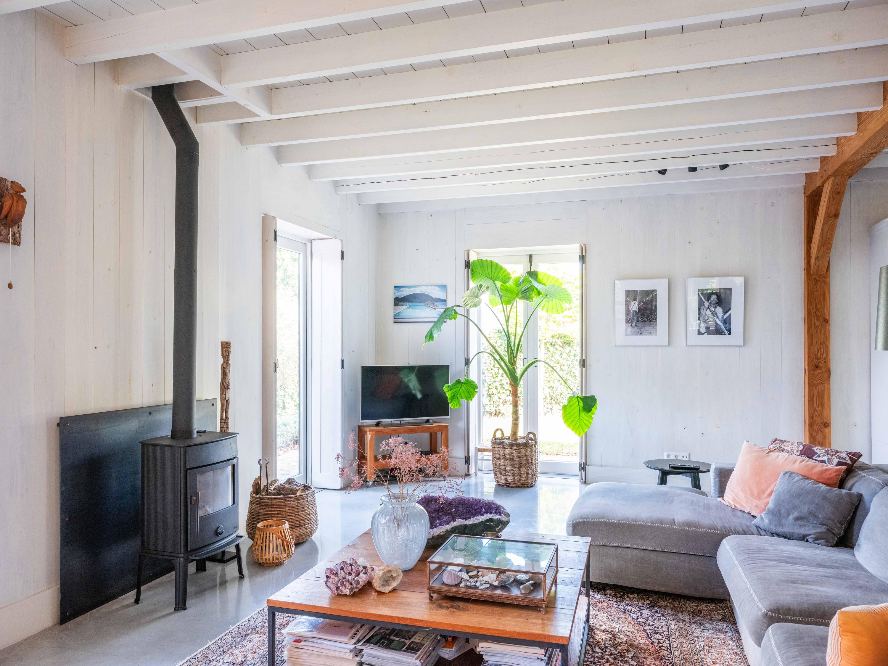 Adjacent to the kitchen is the cozy living room with a wood-burning stove, windows on all sides, and French doors leading to the garden. The wooden details and warm atmosphere make this an inviting place to relax—whether in winter by the fireplace or in summer with the doors open to the garden. A practical storage cupboard can be found under the stairs.