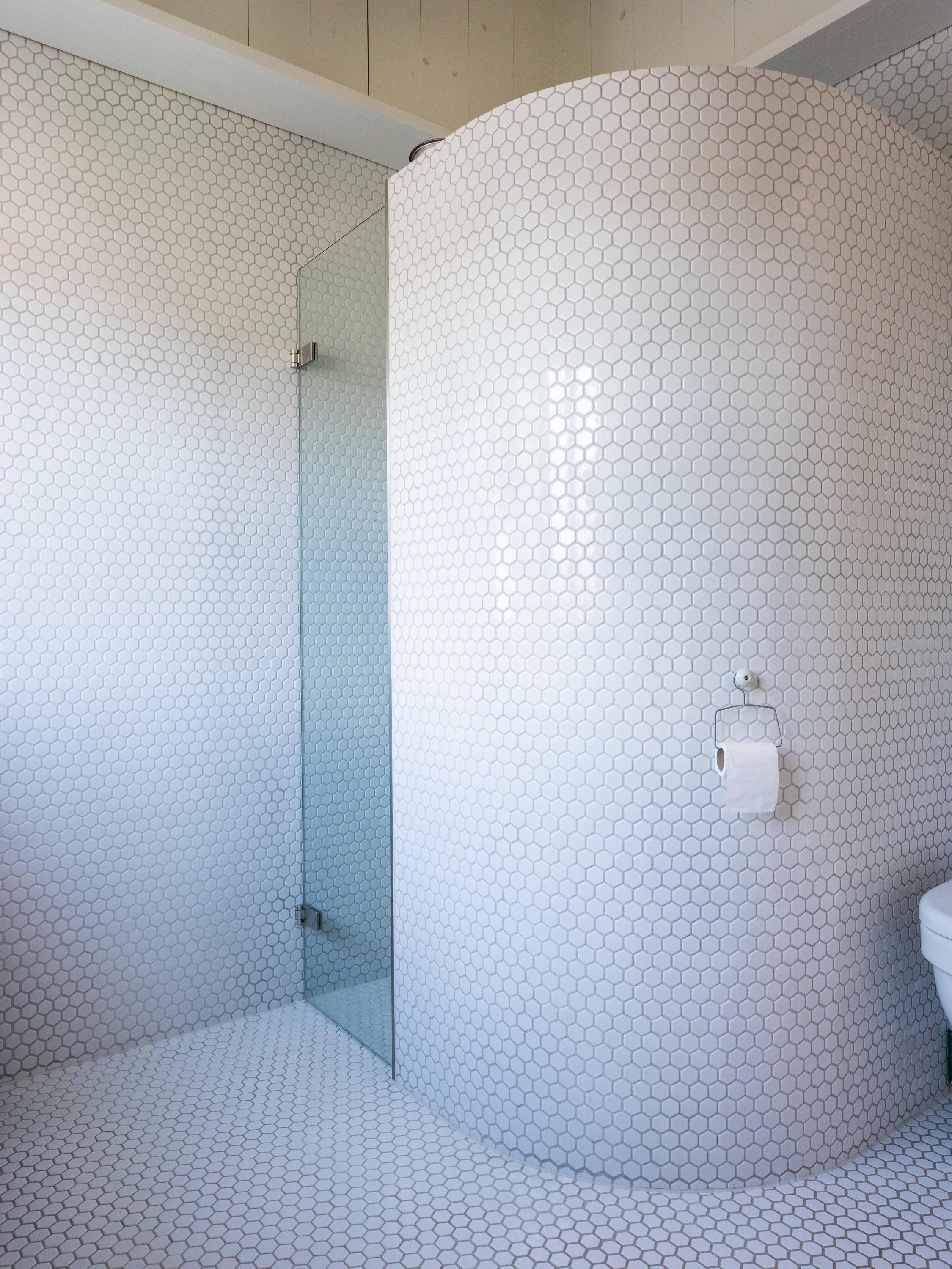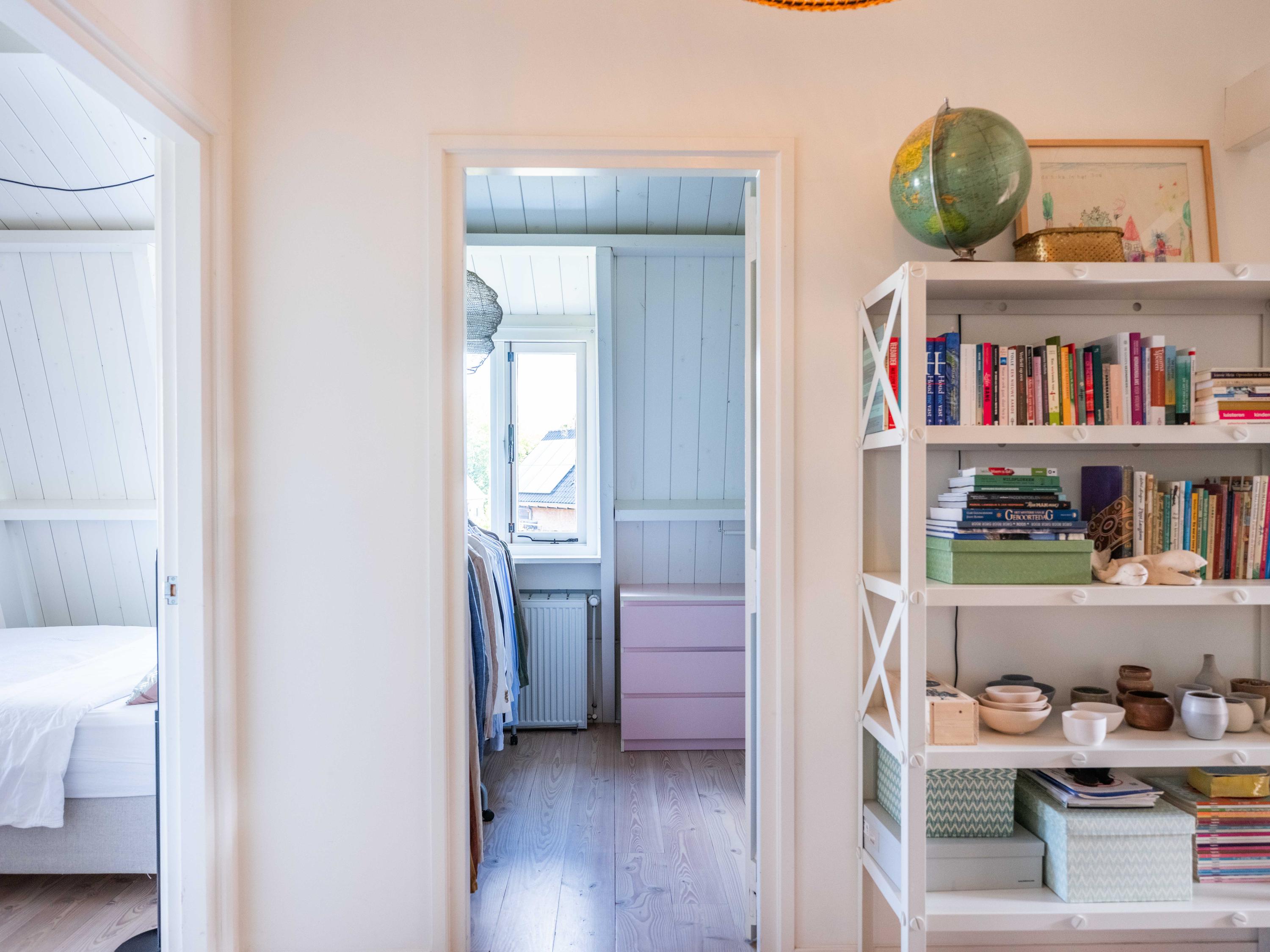 The upper floor offers a spacious landing with high ceilings and built-in eaves storage. The generous master bedroom features a small balcony, and the luxurious bathroom boasts double sinks, a walk-in shower, a toilet, a bathtub, and underfloor heating. In addition, there is a walk-in closet and two more bedrooms, divided by a sliding door, each with its own mezzanine.