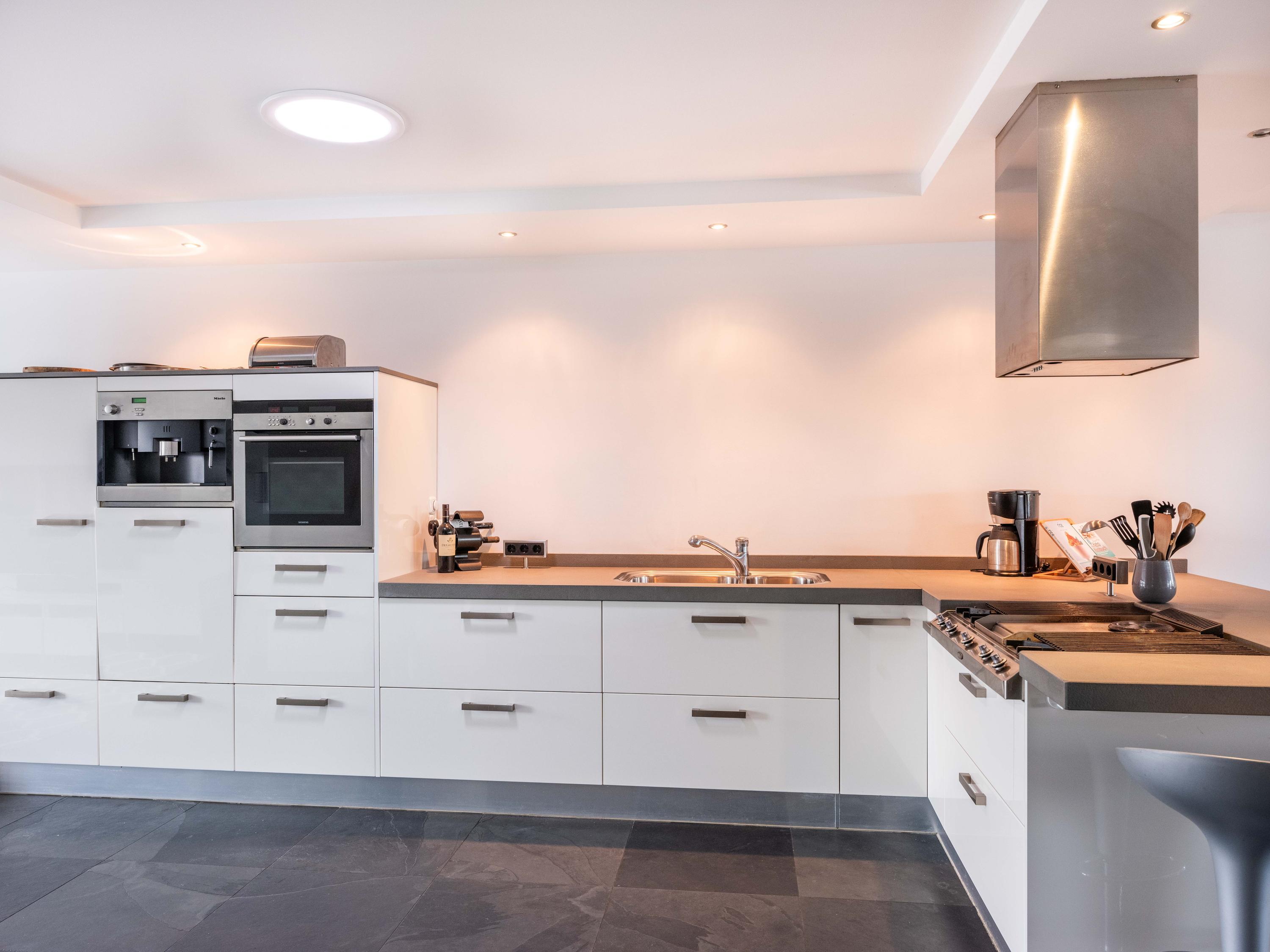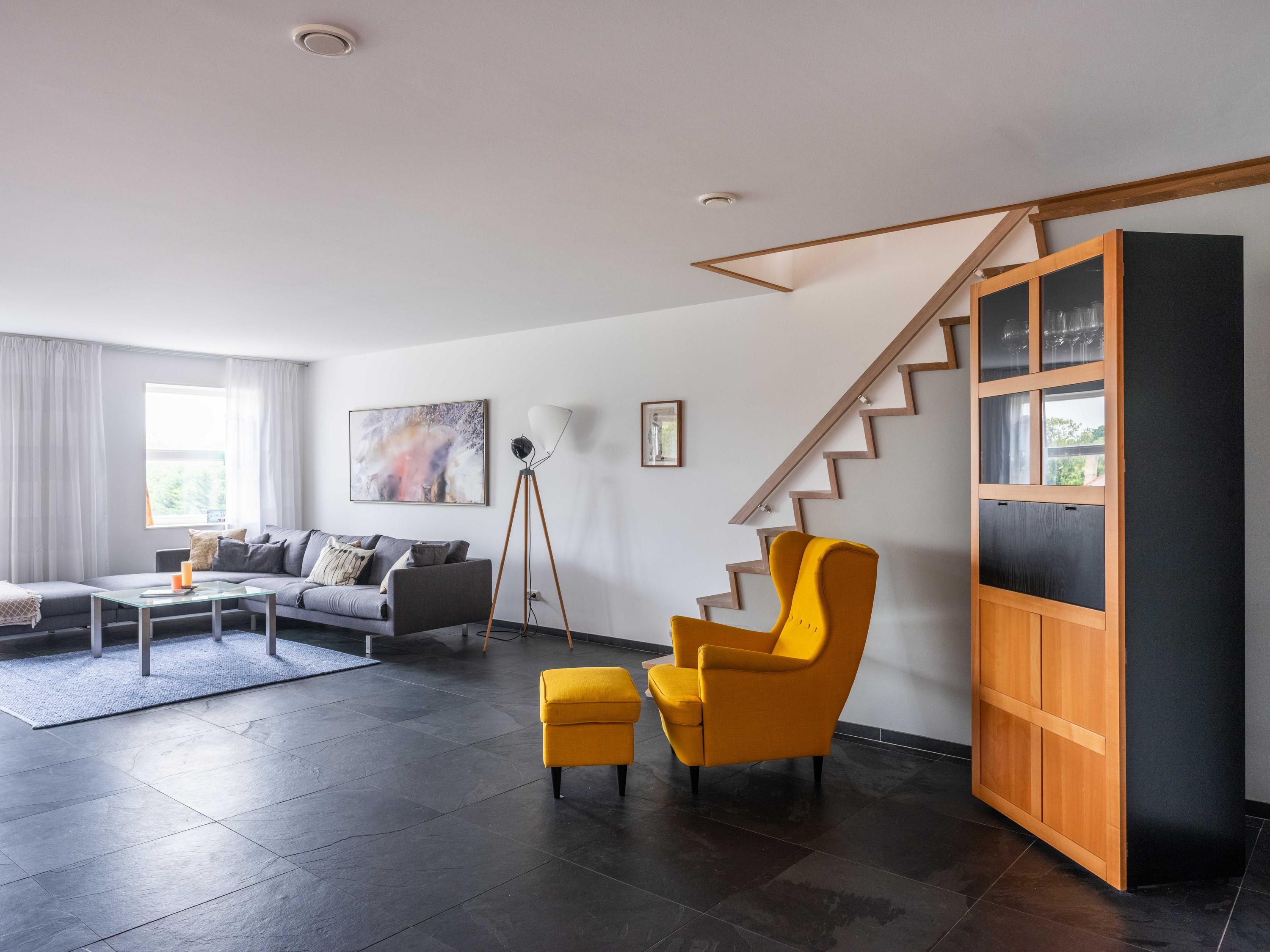 The living room also has two cosy seating areas. The room flows into the open kitchen, which is fully equipped with high-quality built-in appliances and plenty of storage space. On this floor there is also an office/bedroom and the first bathroom with shower, toilet and washbasin.