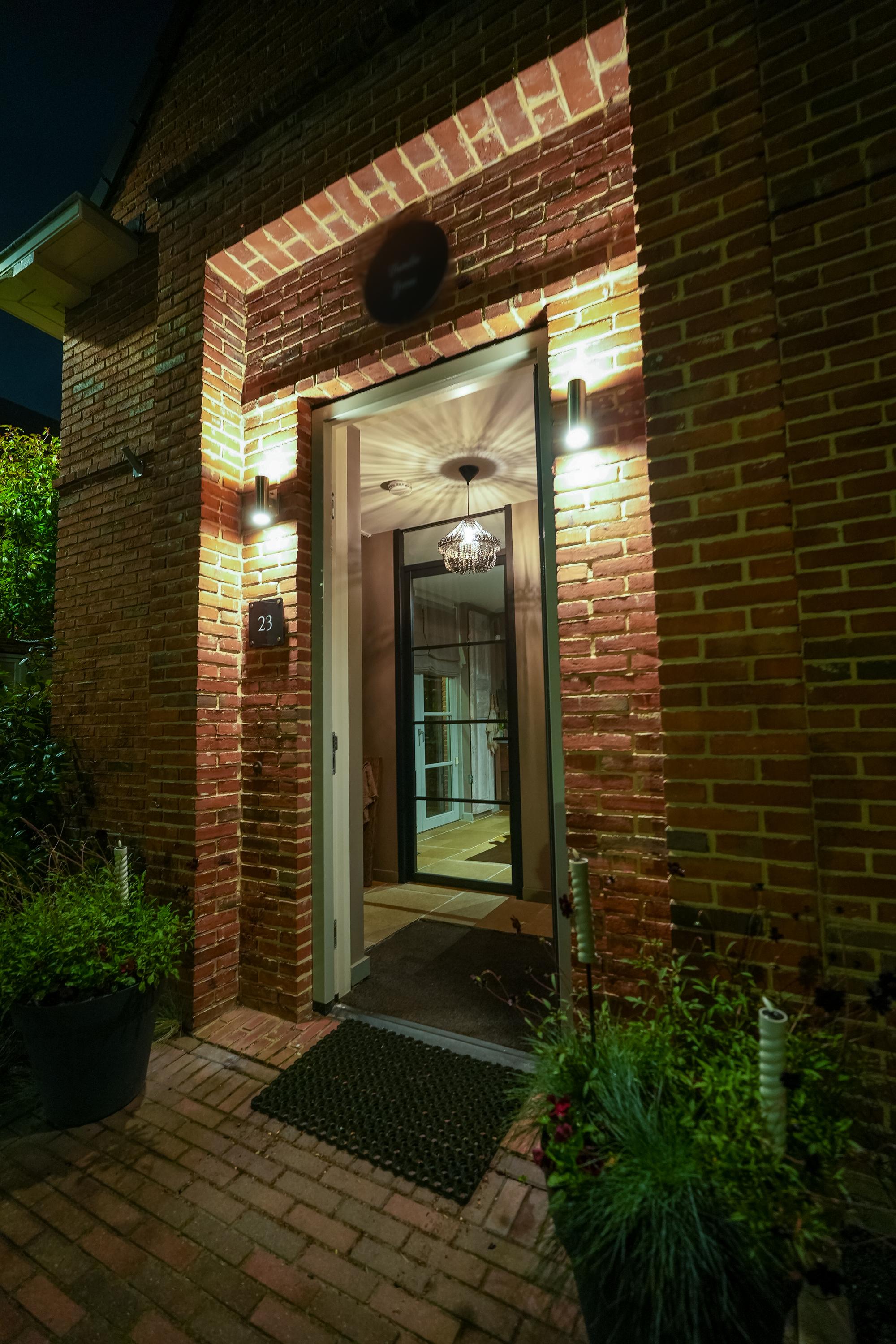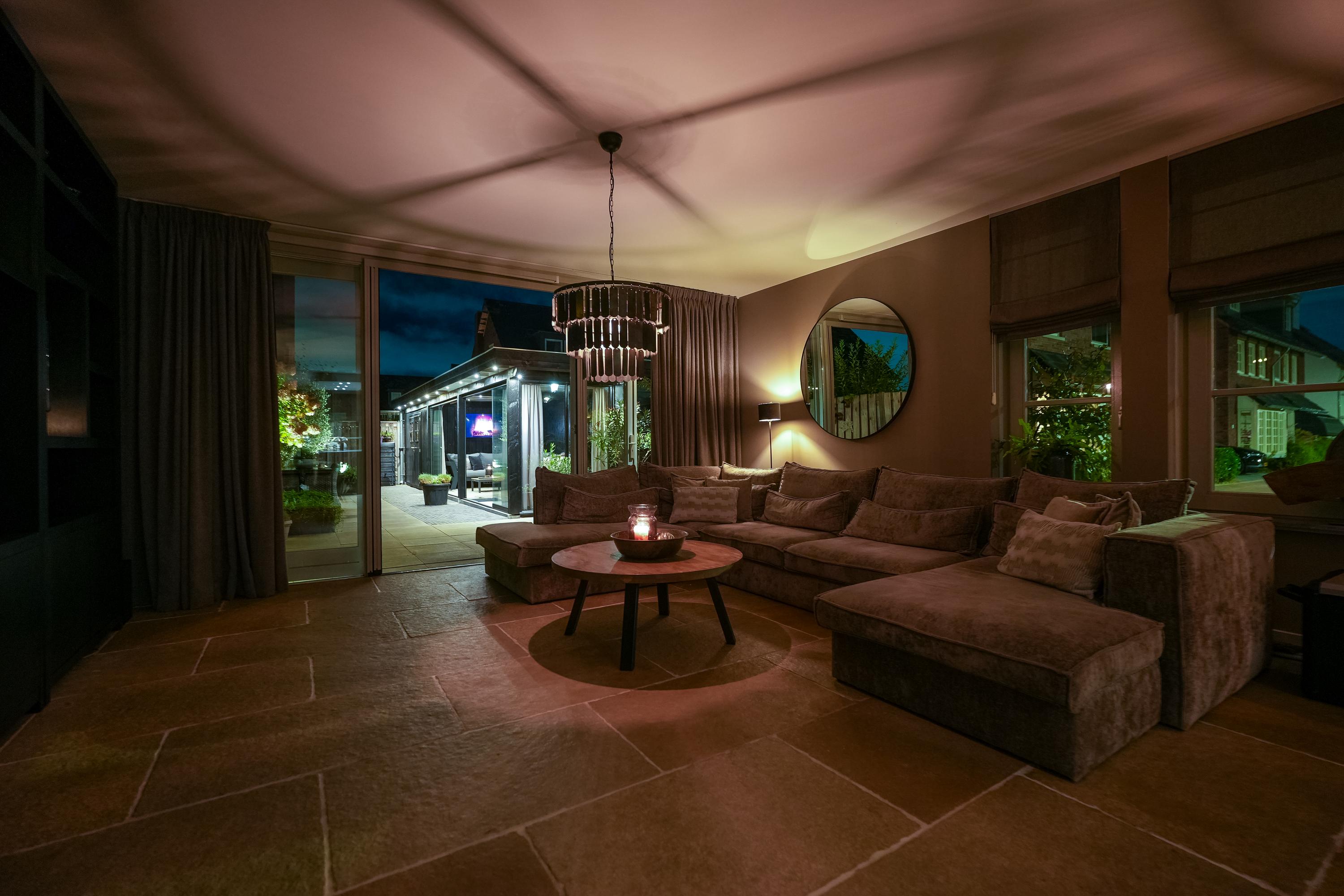A sunny garden with an attractive covered terrace with glass enclosure, fitted with electricity and internet. The space is fully insulated and equipped with skirting heating, making it comfortable throughout the year. In addition, four solar panels contribute to an energy-efficient and sustainable home.