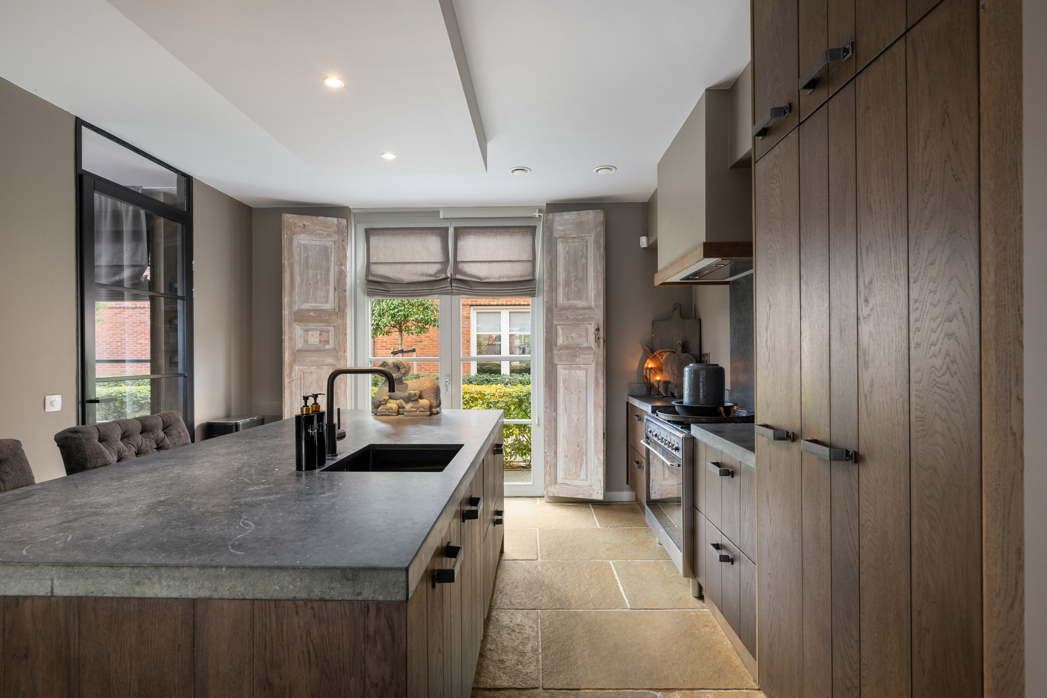 The garden-oriented living room offers a pleasant layout and flows naturally into the modern open kitchen with a large cooking- and sink-island — an ideal setting for cooking, dining and relaxing together. On the upper floors you’ll find four well-proportioned bedrooms, a luxury bathroom and two separate toilets.