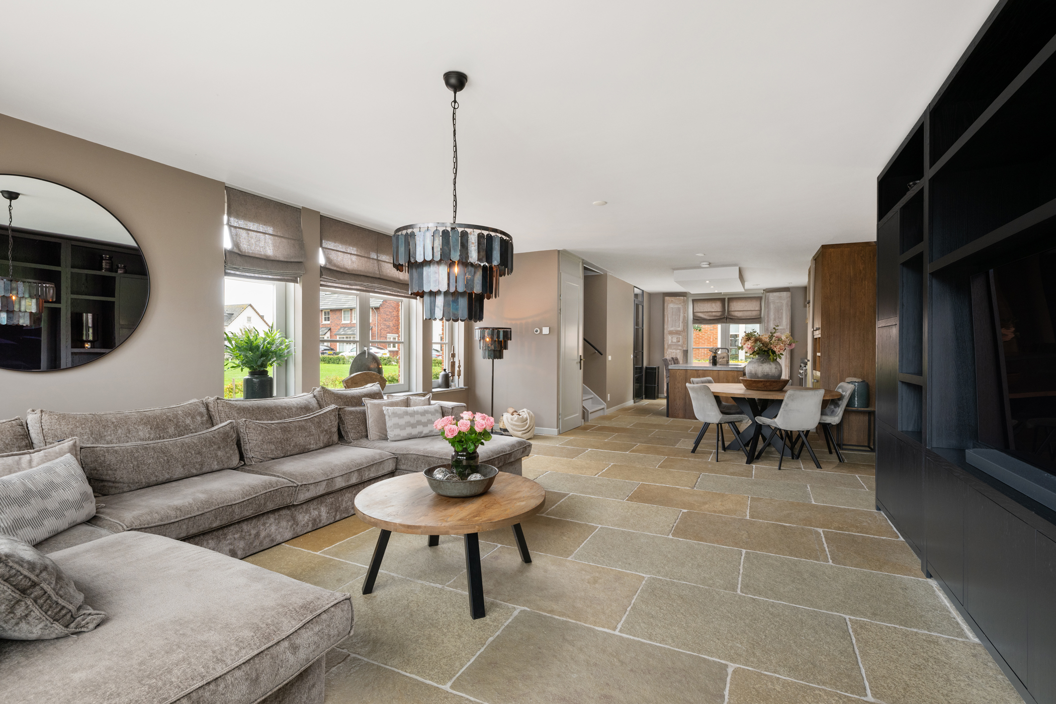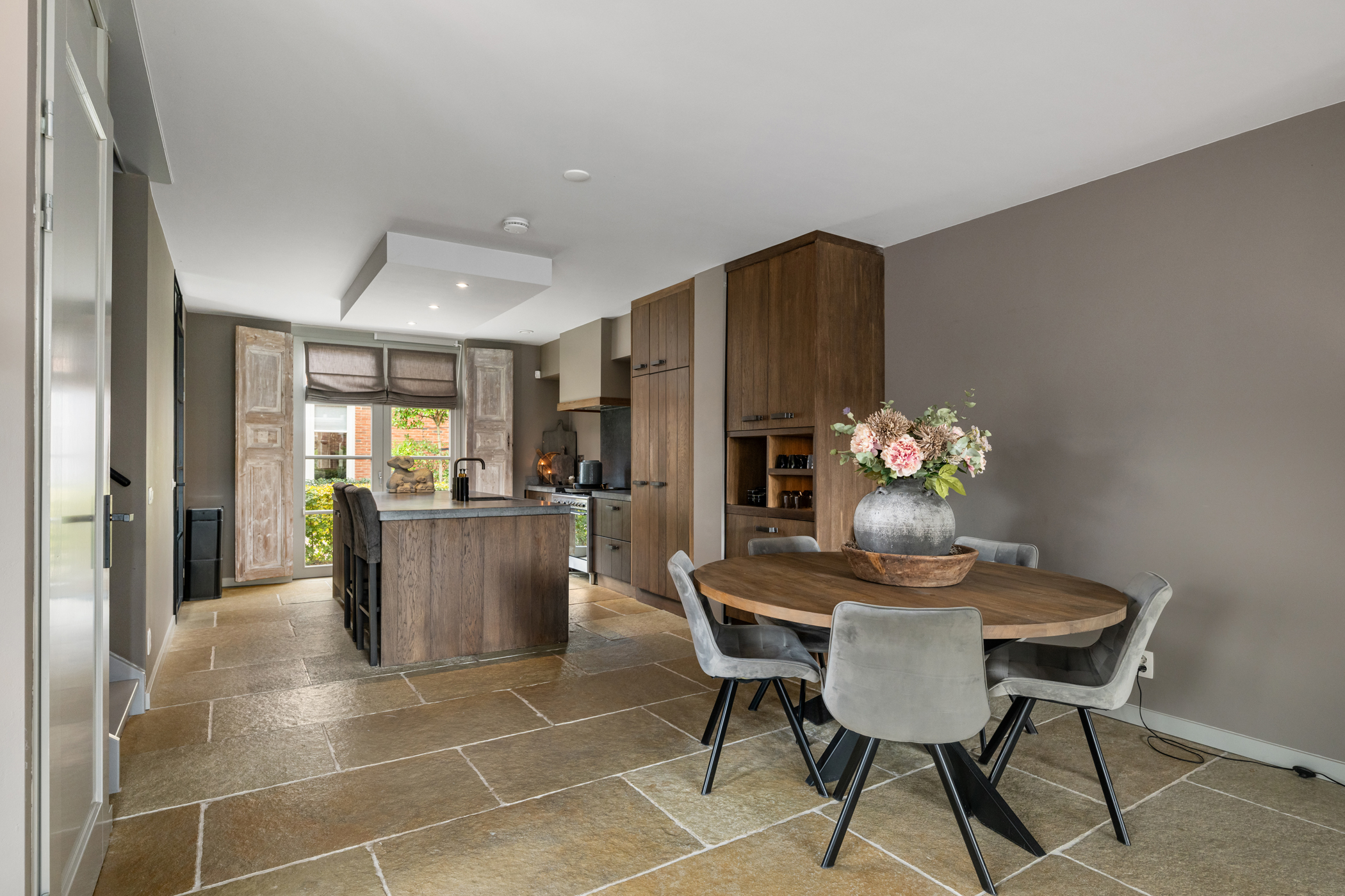 Set along a quiet green area at the front, the house features a well-kept front garden. Entry through the hall with wardrobe space, meter cupboard and a tiled toilet with wall-mounted toilet and basin. The living room is spacious and bright, finished with a Bourgondisch dallen natural stone floor with underfloor heating. The staircase to the first floor is located in the living room and the stair-cupboard is used as extra wardrobe space. Patio doors lead to the deep garden with covered terrace and detached wooden shed. At the front of the house is the modern kitchen with a large cooking- and sink-island and high-quality built-in appliances including a pantry pull-out, sink, gas hob, extractor hood, convection oven, refrigerator and dishwasher.