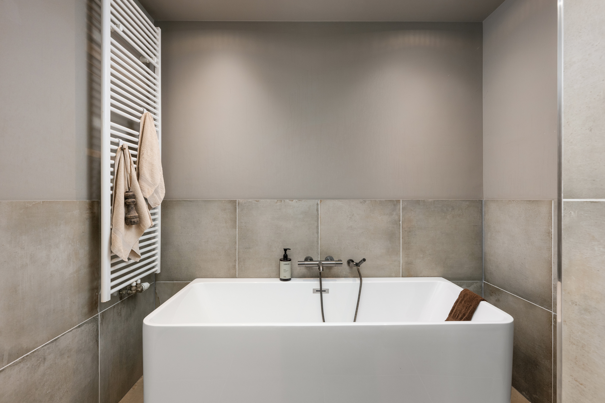 The landing with wooden flooring gives access to a separate toilet. At the rear there are two bedrooms; at the front one bedroom. The fully tiled bathroom is luxuriously finished with a walk-in shower, bathtub, vanity unit with double sinks, large mirror and towel radiator.