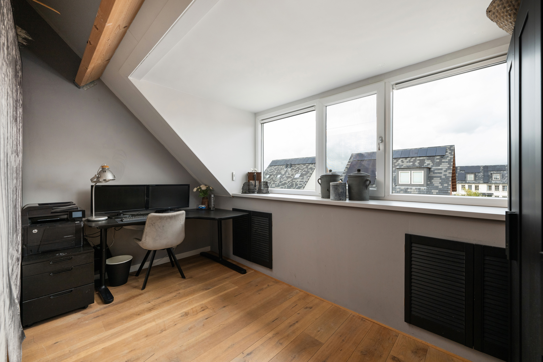 The spacious open attic level features a wooden floor, a dormer and knee-wall storage. There is a separate laundry area with the central heating system (Intergas 2019), mechanical ventilation unit, washing machine, dryer and inverter for the PV-solar panels. The open layout offers plenty of scope to convert into two additional bedrooms — ideal for extension or multifunctional use.