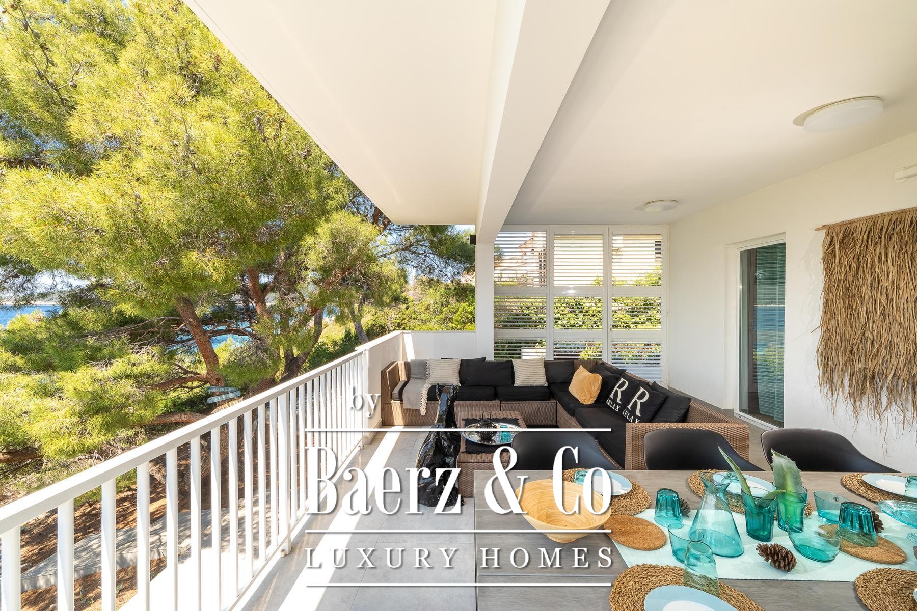 Korčula Island, Vela Luka, villa with a living area of 120 m2 by the sea.The property is located in a small village on the southern coast of the island of Korčula, on a plot of 400 m2, 5 km from the center of Vela Luka. The plot is regular in shape, south-facing and is located on the seashore. An asphalt road leads to the plot and the house is connected to the water and electricity networks.The villa consists of a total of three independent residential units, two of which can function separately because they have separate entrances or as a single unit because they are additionally connected by an internal staircase.On the high ground floor there is the main part of the house, which consists of a combined living area consisting of a kitchen, dining room and living room, which is connected by sliding panoramic doors to a spacious covered terrace with a panoramic view of the sea and nearby islands. The rest of the apartment has two bedrooms, a large bathroom and a storage room.On the first floor there are two more apartments and each apartment has a separate entrance from the parking lot in front of the house. One-bedroom apartment consisting of a central
