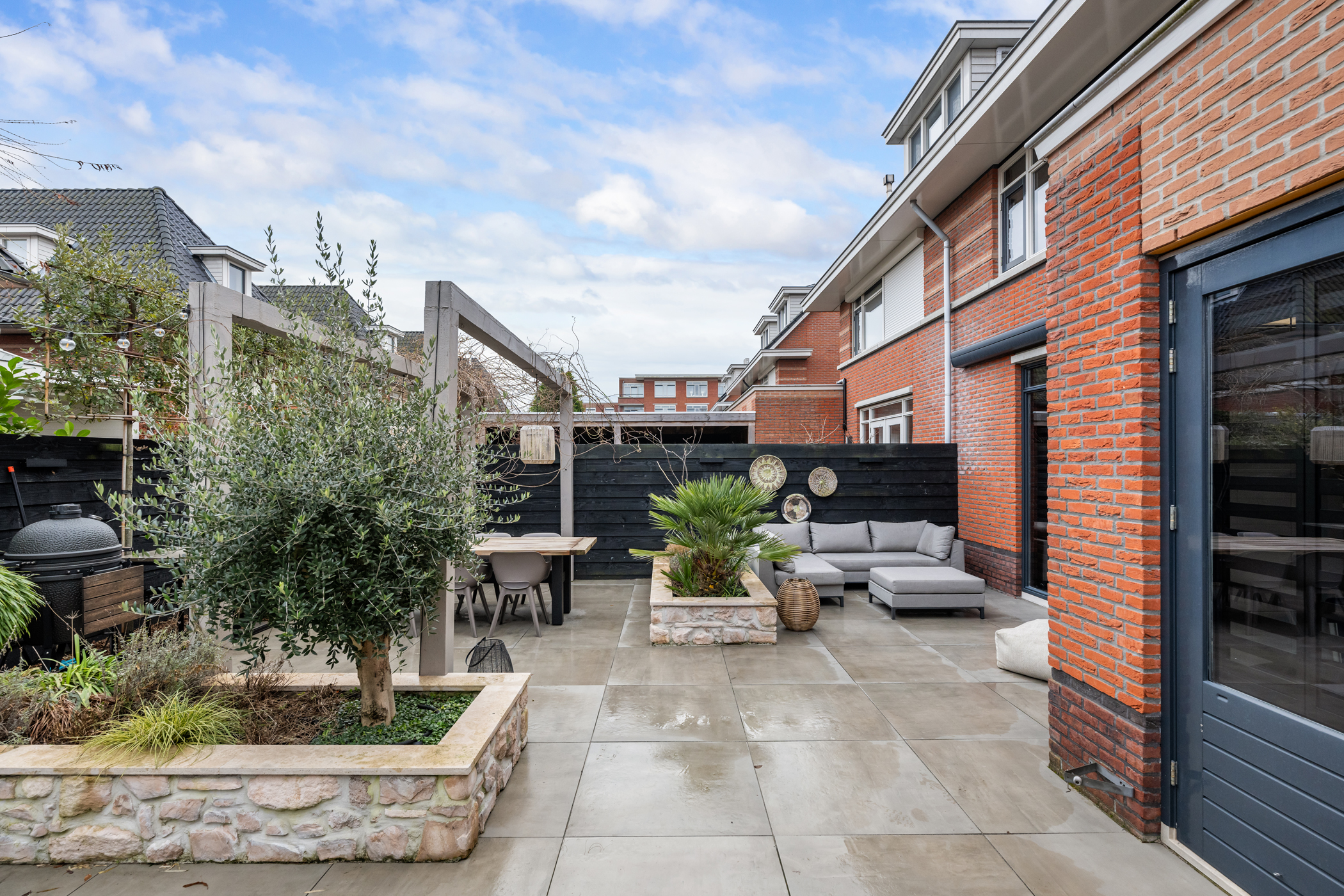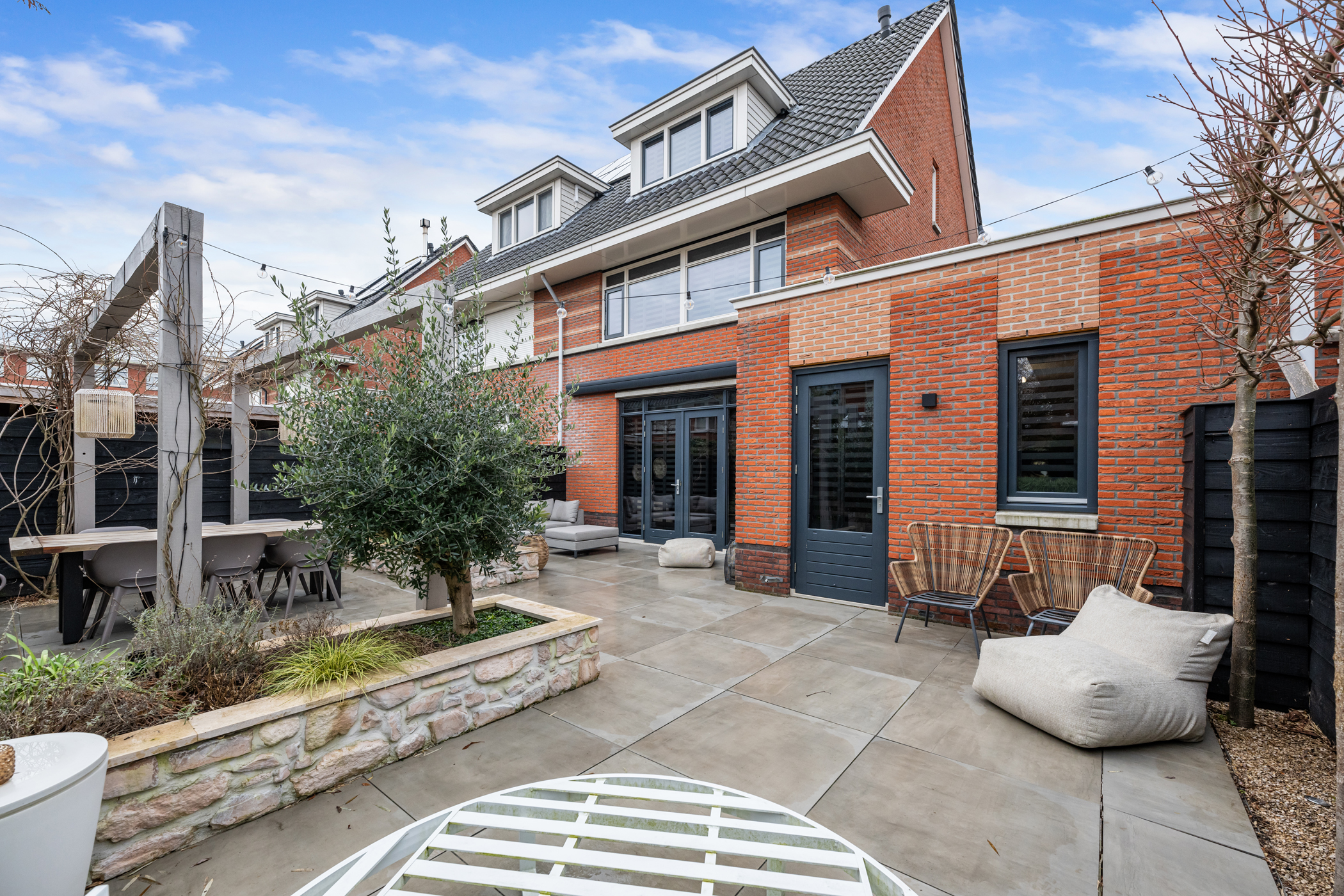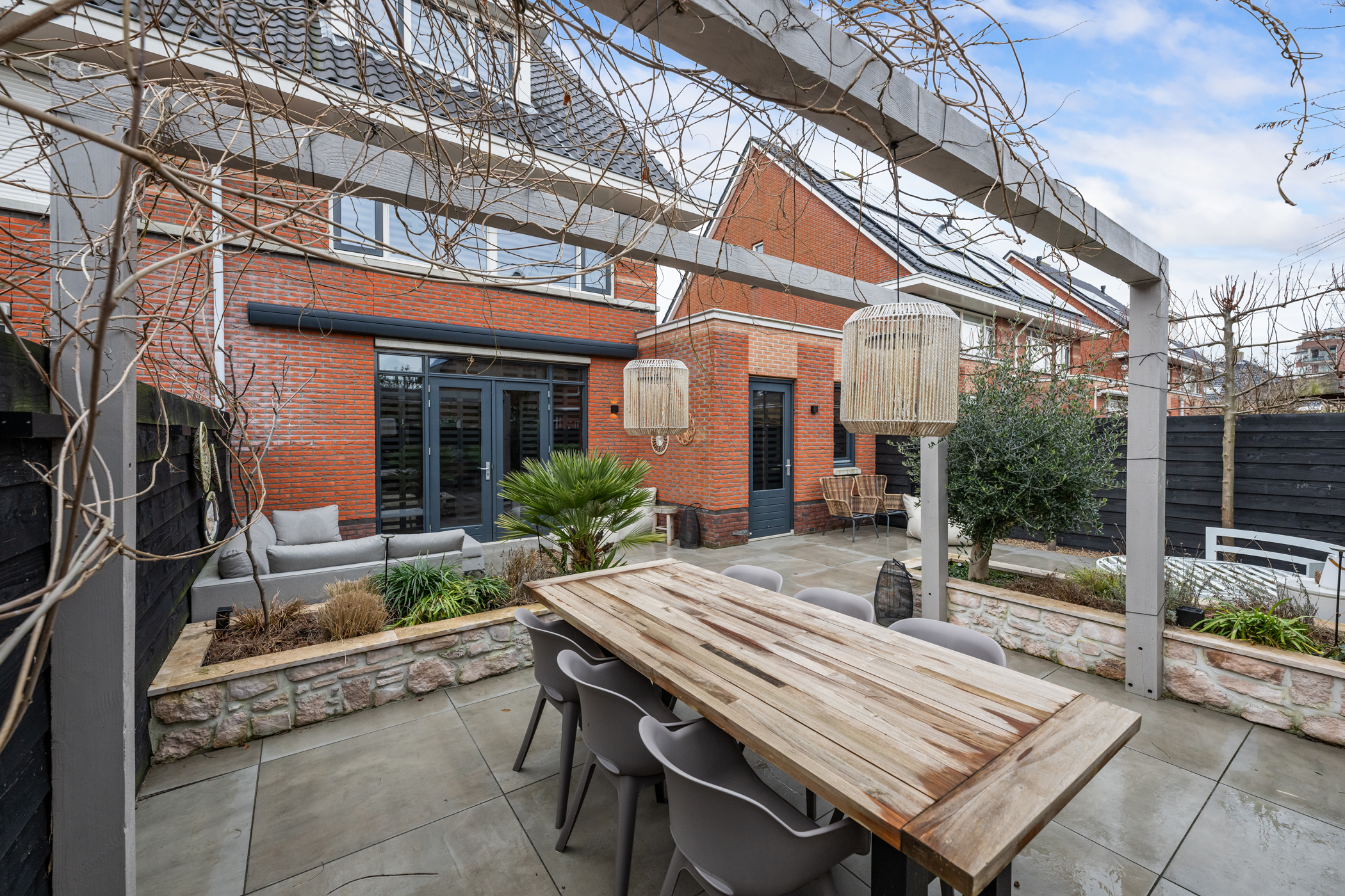 With multiple terraces, inviting seating areas and carefully designed planting, there is always a perfect spot to enjoy the sun or shade. The electric awning provides extra comfort on warm days, and thanks to the irrigation system the garden remains beautifully maintained all year round.