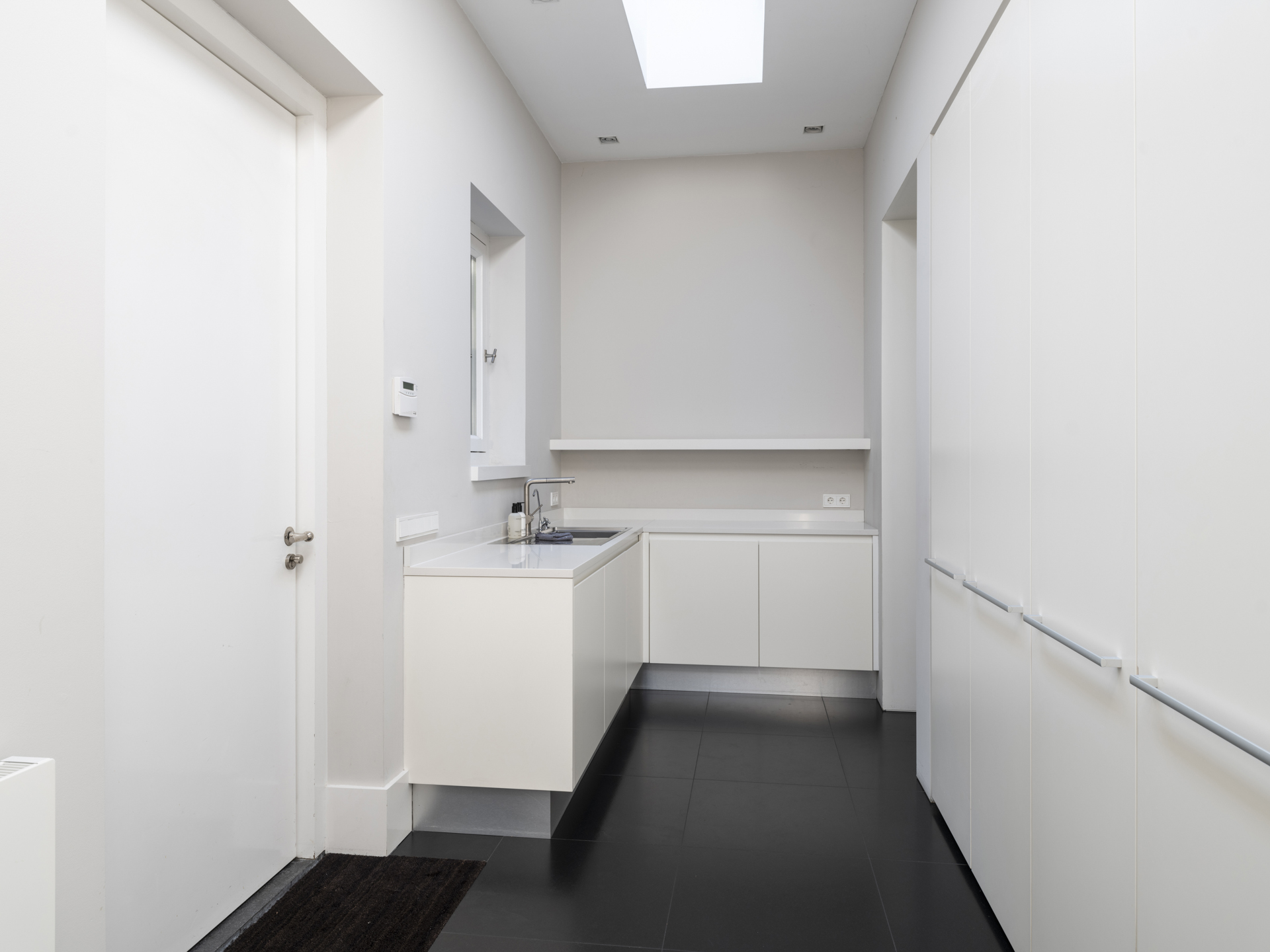 From the classic entrance, you can access the practical mudroom with a side entrance and the living and dining room. This bright and open living space connects two side wings and features beautiful light and a lovely view of the entire garden. Activity and warmth are centered around the kitchen (with an adjacent spacious and practical utility room) and the covered terrace. At the front, adjacent to the living area, you will find a separate TV/work room overlooking the courtyard.