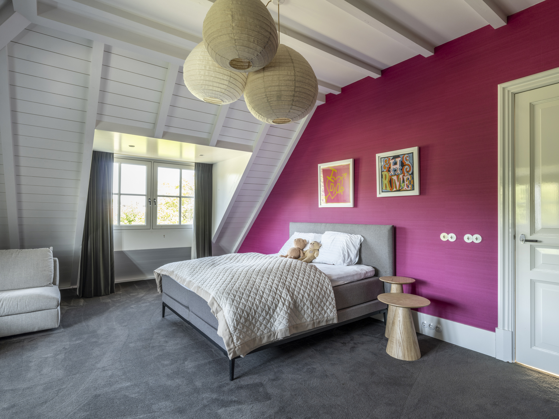 Via a wide staircase and spacious landing, you can reach the master bedroom (with balcony and view of the garden). The adjacent dressing room is openly connected to the master bathroom.