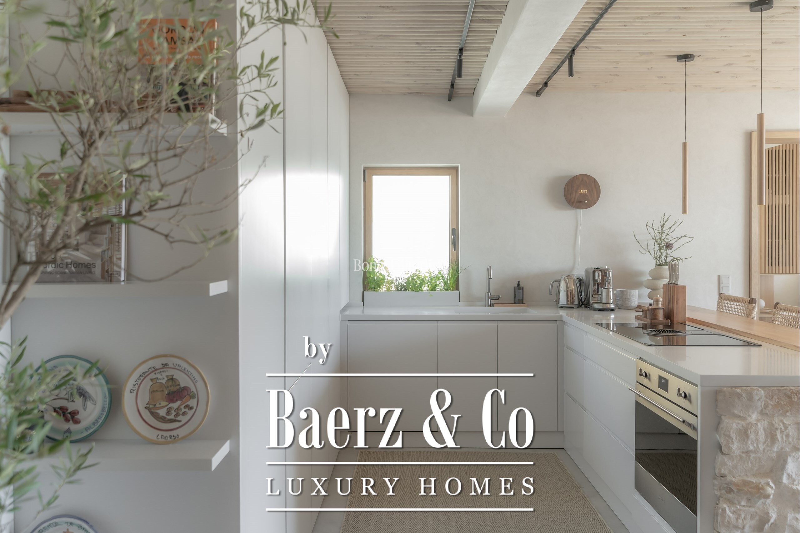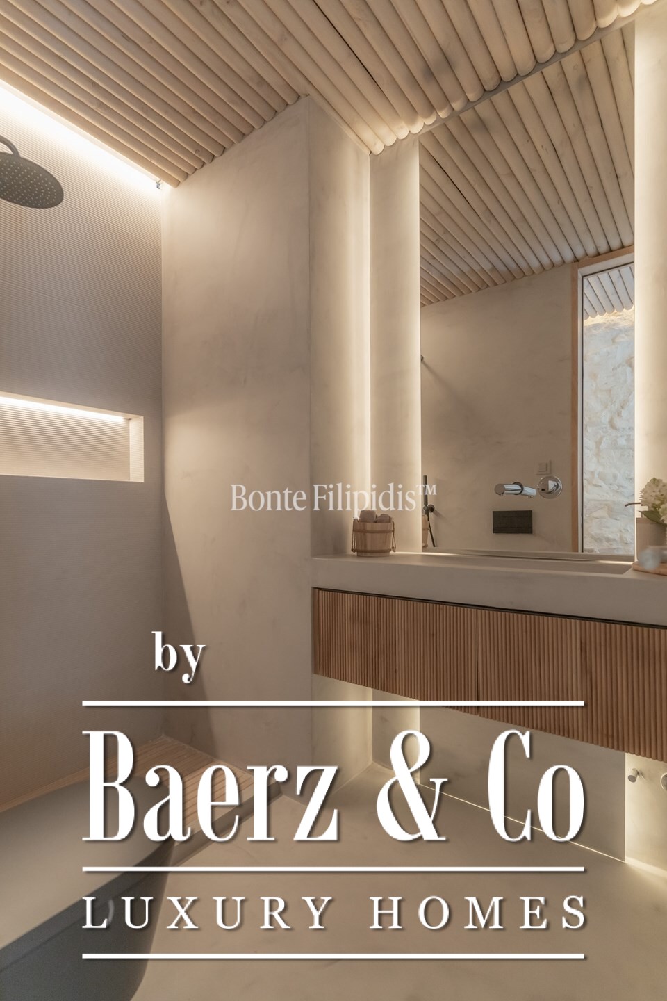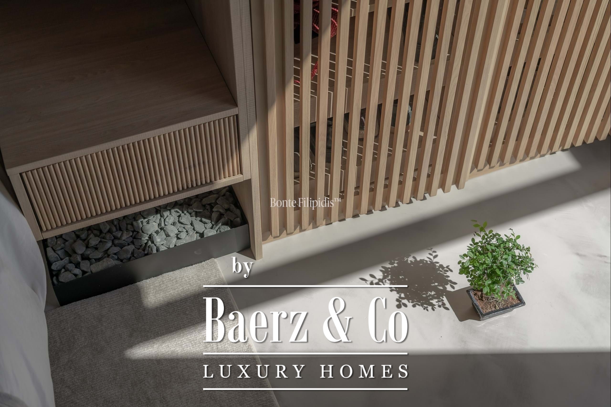 The 88 m² layout offers a seamless flow between the open-plan living room, dining area, and kitchen, all with high-quality finishes and fully integrated appliances. The living room leads to a 19 m² terrace featuring a bar as well as an outdoor shower for cooling off under the sky, offering a calm vantage over the bay. In the private area, the en-suite bedroom ensures privacy, while the second bedroom features sea views, its own balcony, and an independent, full bathroom.