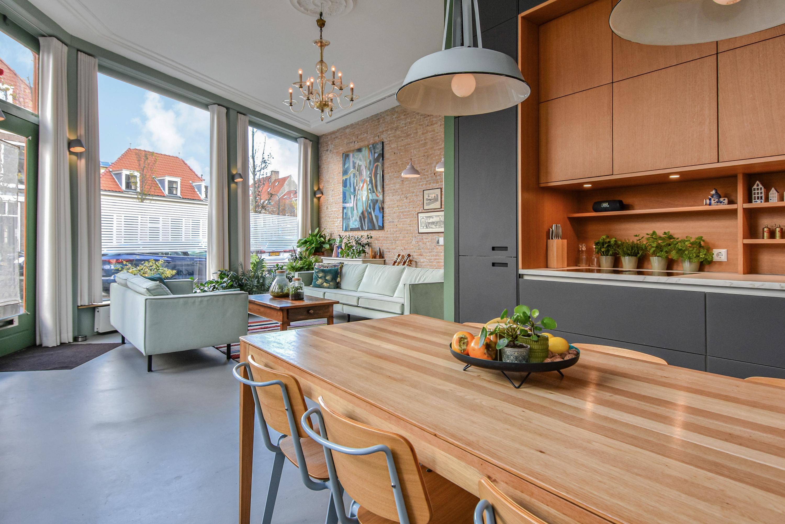 Upon entering, you are immediately impressed by the beautiful living kitchen with its strikingly high glass façades and an impressive ceiling height of no less than 3.55 meters. The original stucco decorative moulding has been preserved. The space is filled with light and offers ample room for a large dining table. The stylishly finished kitchen forms the heart of the home—a wonderful space equipped with luxury built-in appliances, perfect for cooking and entertaining guests.