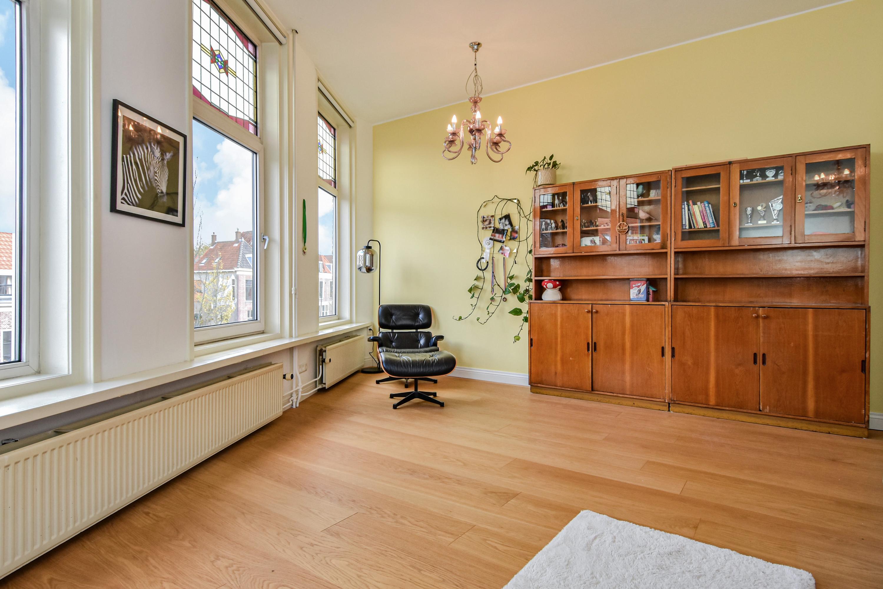 On either side of the kitchen are two inviting living areas: on one side a sitting room, and on the other a cozy living room with a comfortable seating area. Adjacent is an integrated studio, also featuring a high ceiling and French doors opening to the street. This room is arranged as a bedroom with its own bathroom, including a walk-in shower, double washbasin, and toilet—ideal as a guest suite, annex apartment, office, or practice space at home. At the rear, there is a large, practical bicycle storage room with attic space, accessible via Broerhuisstraat. From the living room, a straight staircase leads to the first floor.