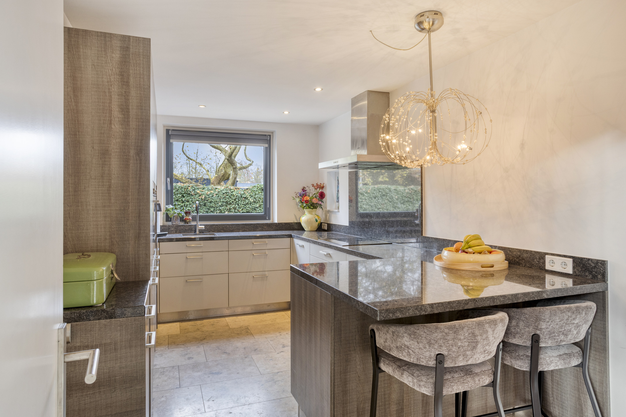 Via de hal kom je in de eetkamer, een lichte en uitnodigende ruimte dankzij de grote schuifpui. De eetkamer is voorzien van een houtkachel. Hier bevindt zich ook de trapopgang naar de eerste verdieping. Vanuit de eetkamer loop je door naar de woonkamer en de keuken. De woonkamer is ook voorzien van een sfeervolle houtkachel. De dichte keuken heeft een speels effect dank zij de bar aan het keukenblad. De keuken is uitgerust met diverse inbouwapparatuur, waaronder een 4-pits inductiekookplaat met afzuigkap, oven, koelkast, vaatwasser, stoomoven, warmhoudlade en een keukenboiler.