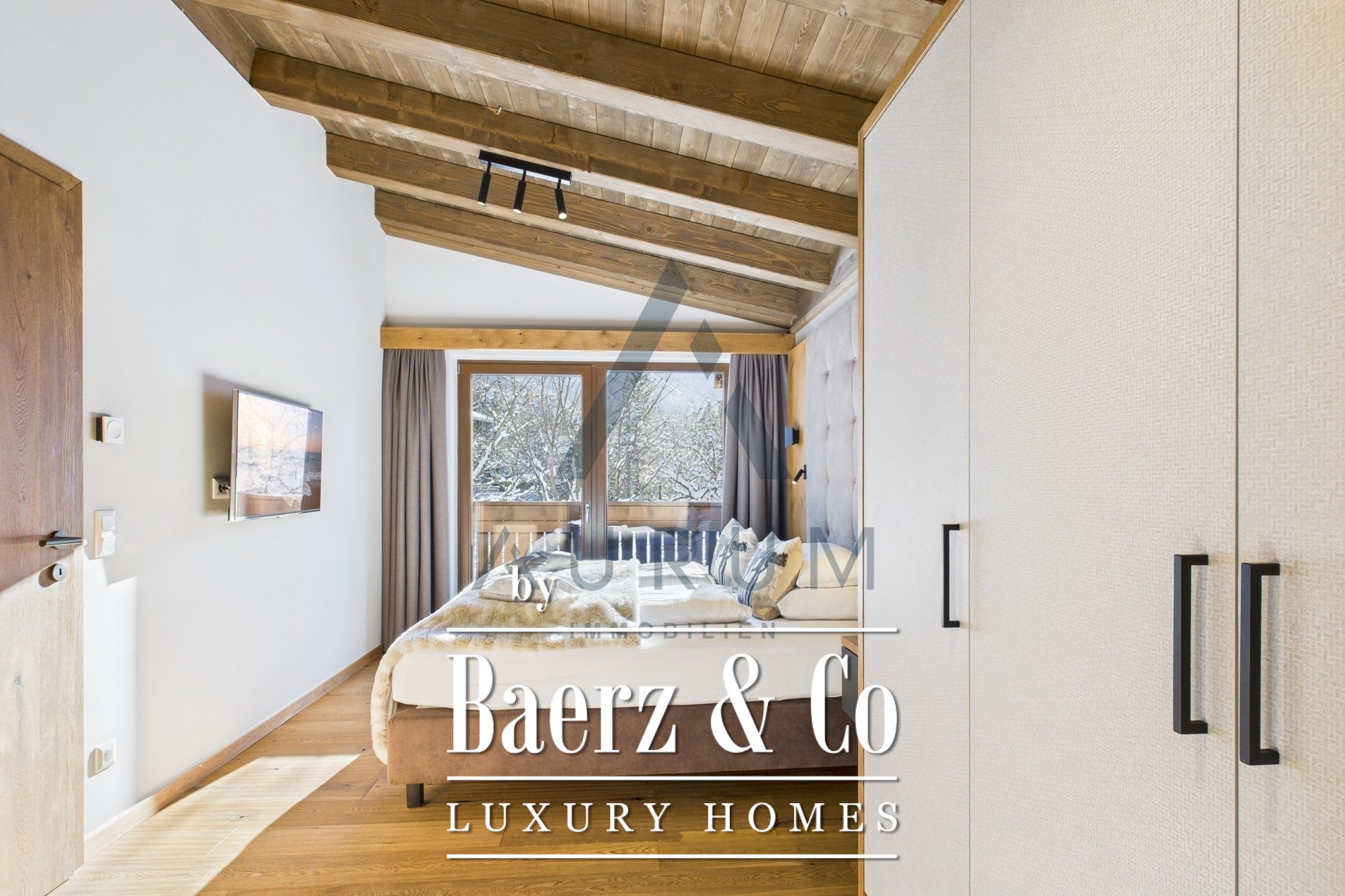 Upstairs, three further bedrooms and two balconies invite calm, with two rooms offering en-suite facilities. Finishes are purposeful, with oak parquet flooring and fine stoneware tiles reinforcing the alpine aesthetic. The chalet is sold fully furnished and equipped for immediate use or rental.