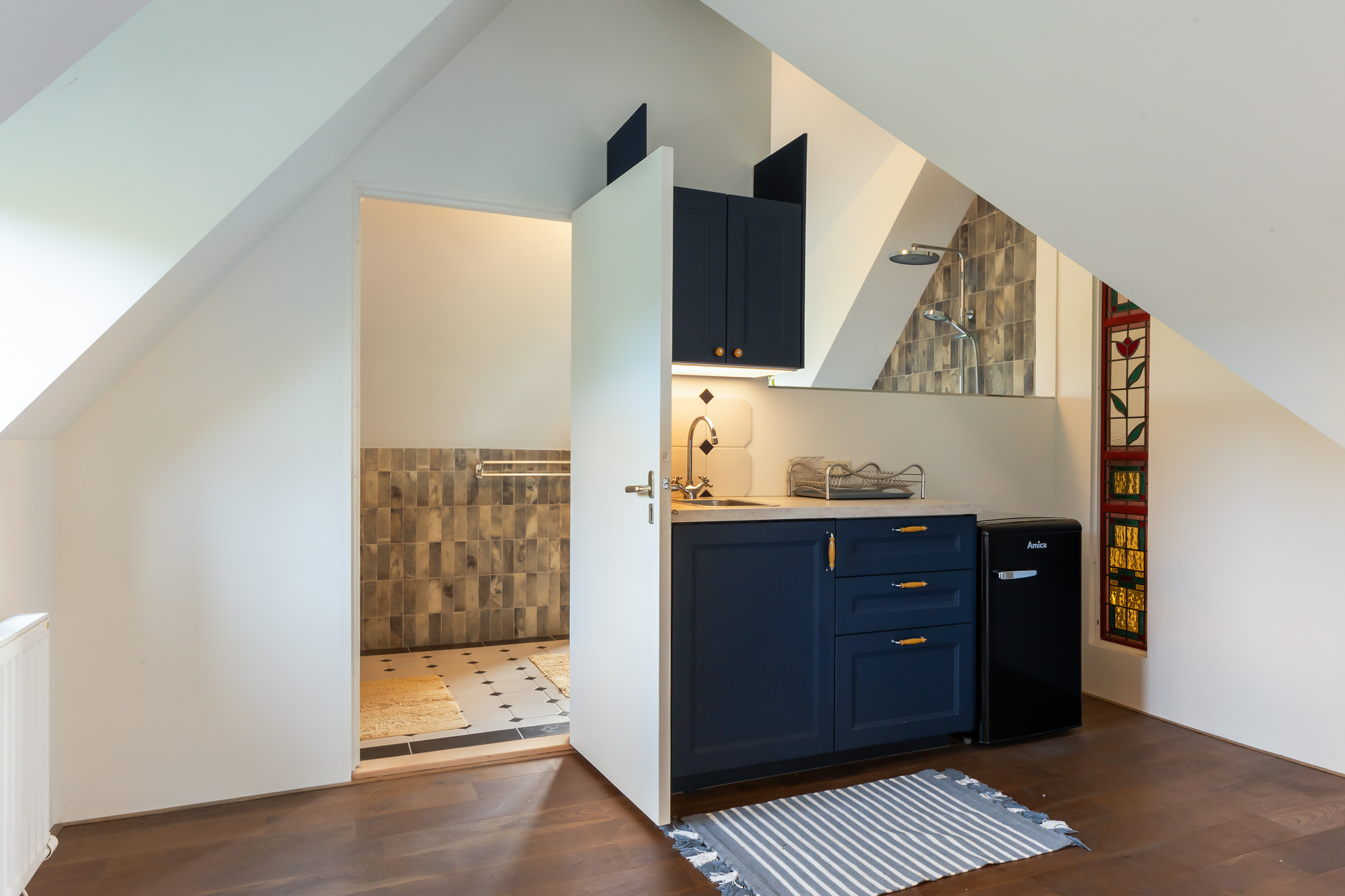 The adjoining 445 m² commercial building offers countless possibilities: an atelier, gallery, showroom, office or workshop. Its soaring ridge height with black timber trusses, generous proportions and large windows create a striking atmosphere of craftsmanship and character. The building includes its own entrance, office, pantry and WC. The mezzanine floor offers further space for guest accommodation, an atelier or workspace.