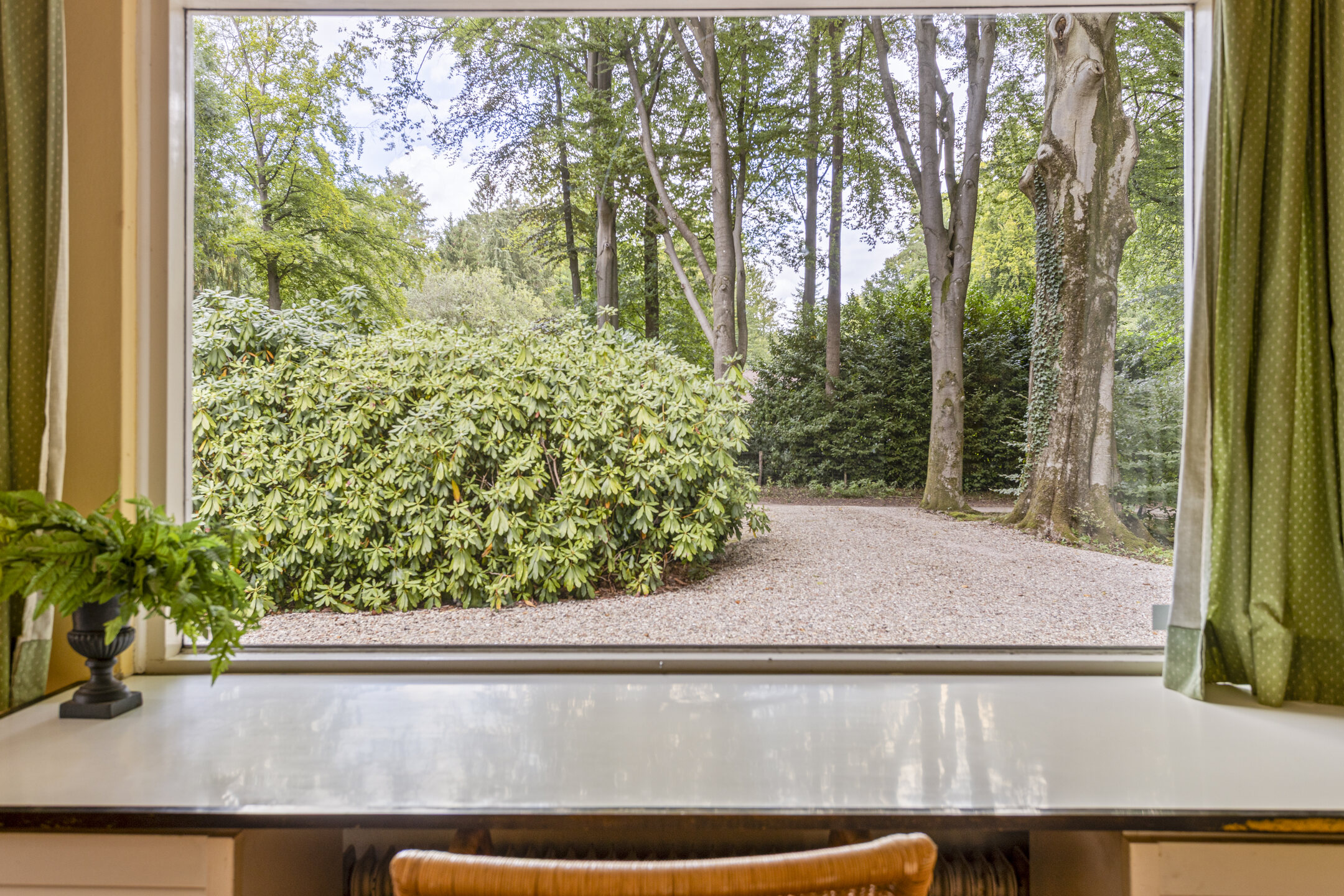 Het huis ligt iets verhoogd ten opzichte van haar omgeving en wordt omgeven door een diepe, landschappelijk aangelegde parktuin, met rododendrons en oude beuken, eiken en Douglas-sparren, die als wachters rondom staan. Op de veranda groeit een grote blauwe druif die zich met haar bladerdak en dikke druiventrossen als een natuurlijke parasol uitstrekt boven het terras. Deze perfect onderhouden tuin, gaat moeiteloos op in de bosrand, die de percelen als een groene ketting met elkaar verbindt.