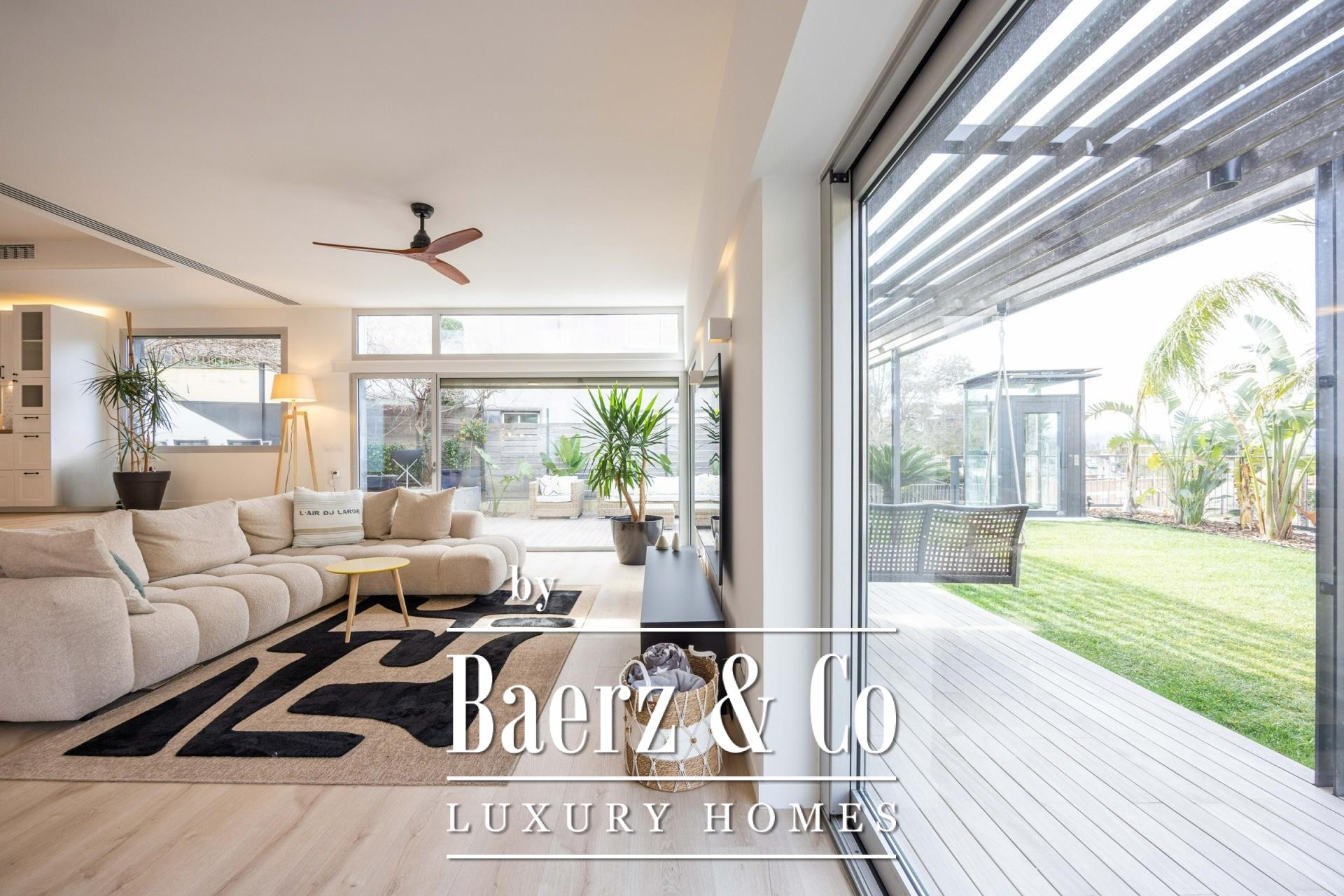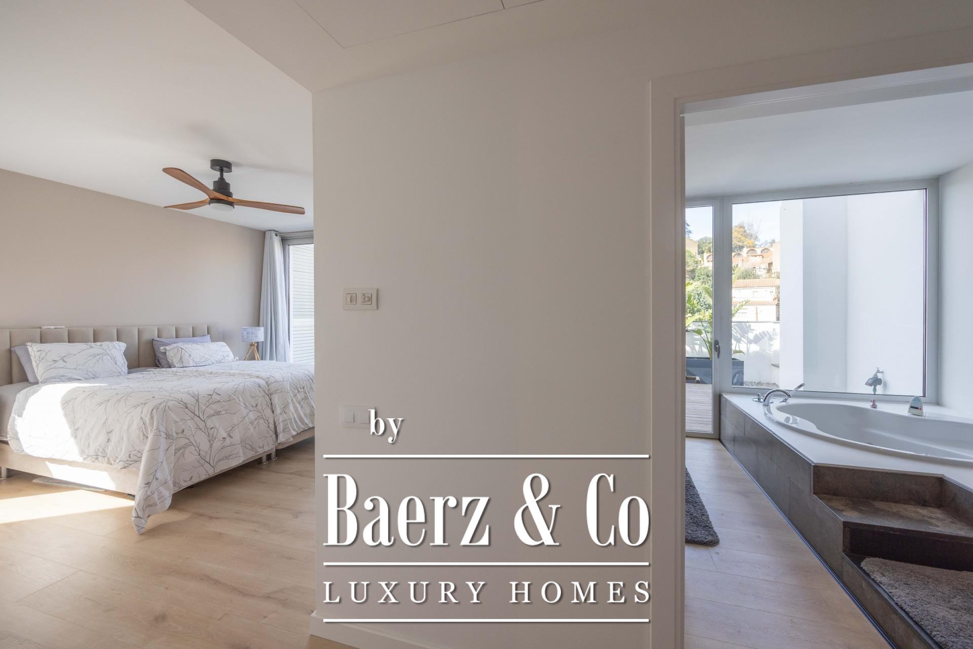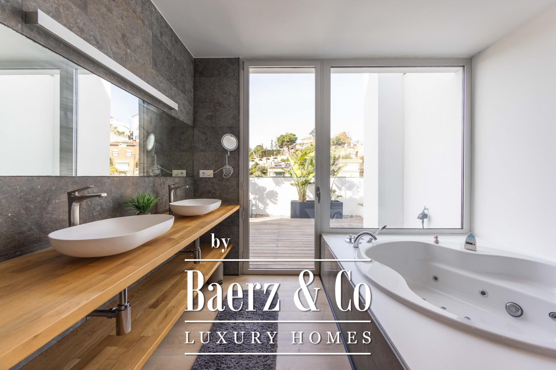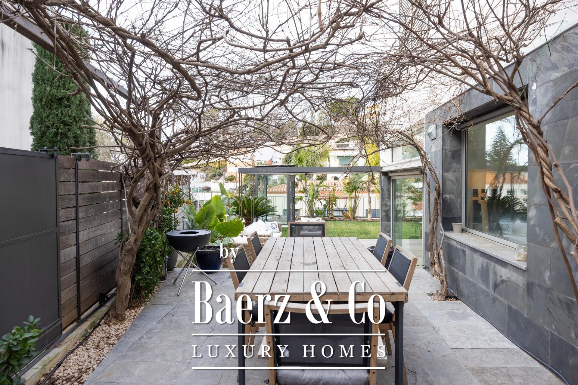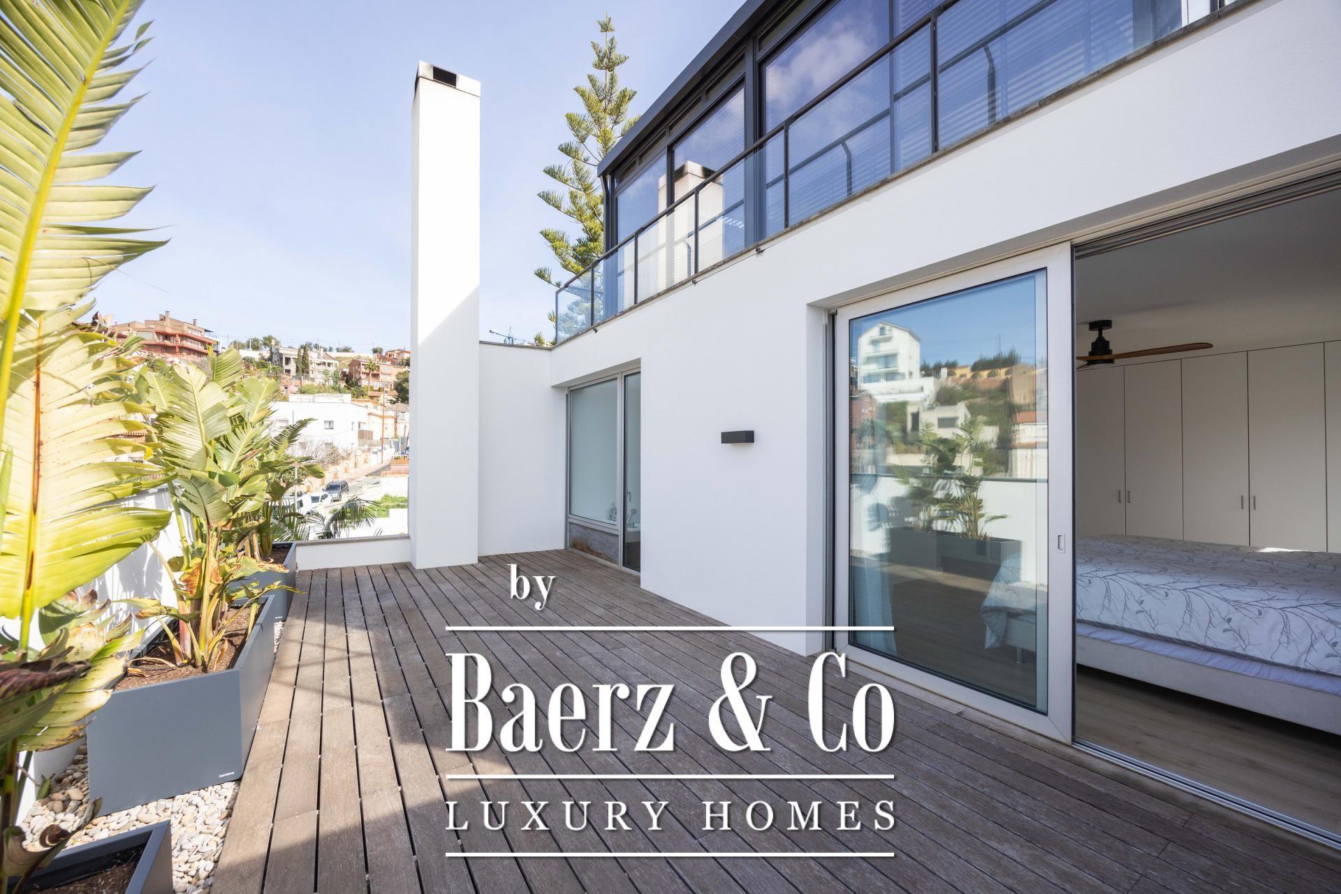 Four landscaped terraces extend the experience outdoors, surrounded by palm and banana trees, curated lawn, a shaded pergola, and a summer kitchen. The 7x5 m swimming pool and wooden sun deck invite moments of relaxation and privacy. The master suite is defined by its walk-in wardrobe, private terrace, and hydromassage bath, while two further bedrooms access a secluded outdoor retreat. An elevator connects the levels, providing comfort and effortless movement throughout the home. The villa’s refined setting in Esplugues de Llobregat ensures both discretion and immediate access to the heart of Barcelona.