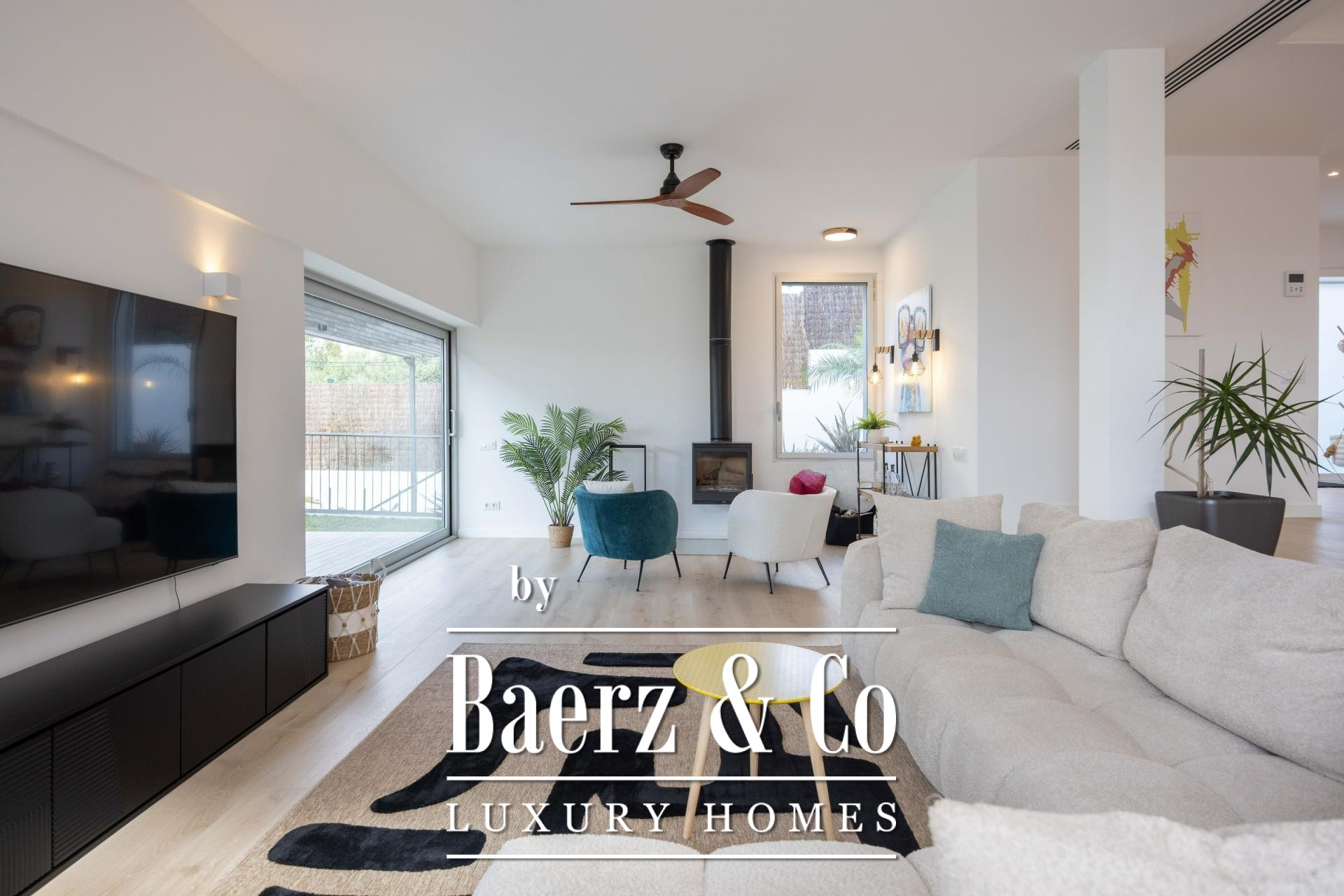 A seamless flow between the living room and a bespoke open-plan kitchen, equipped with Bosch appliances and an American-style refrigerator, enables both private family life and sophisticated entertaining. An elegant wood-burning fireplace anchors the main living area, while the interiors reflect understated luxury and functional design.