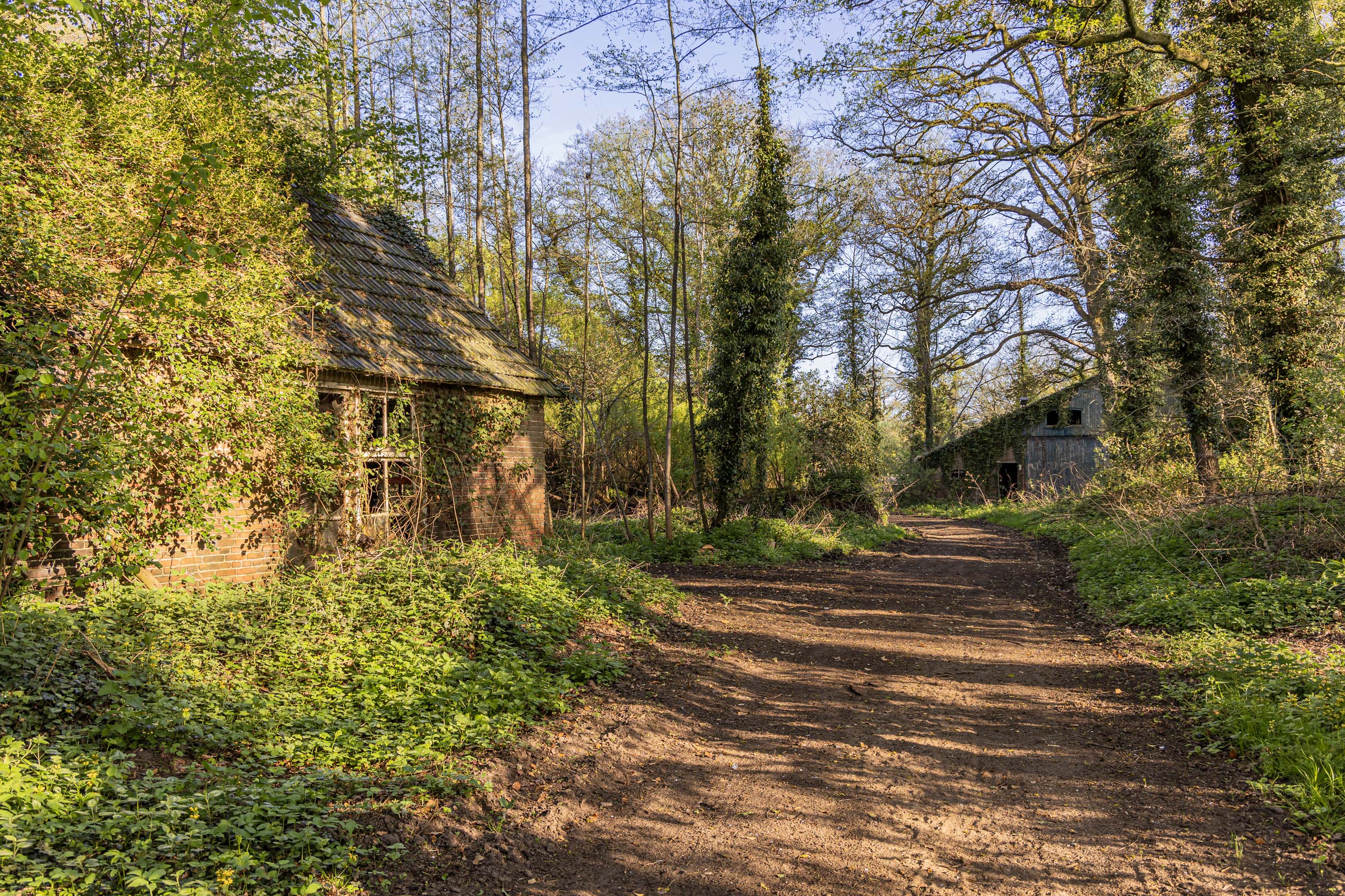 The farmstead has been abandoned for quite some time. From the original farmhouse, parts of the rear façade and foundation remnants are still present. Other structures include a small shed (approximately 30 m²) and a large barn of around 225 m², both in moderate condition. The property is generously mapped as a residential area on the zoning plan, covering about 5,300 m², allowing for the construction of a new country house.