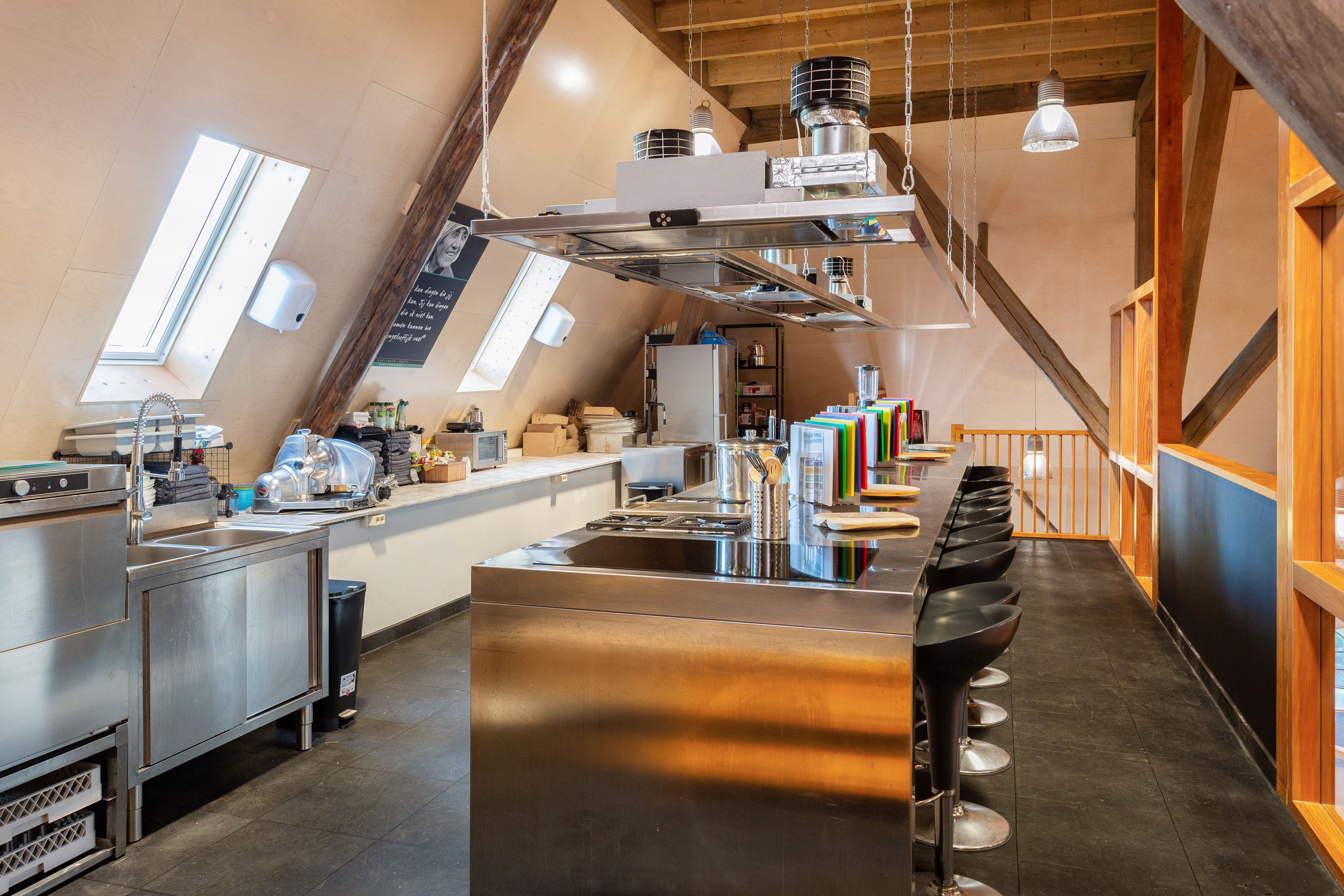 Via two staircases you can reach the 1st floor of the barn where you will also notice the beautiful old wooden trusses and the modern and attractively panelled ridge. This floor has 3 large multifunctional rooms, a large entertainment room with loft, a cozy bar and a professional cooking studio.