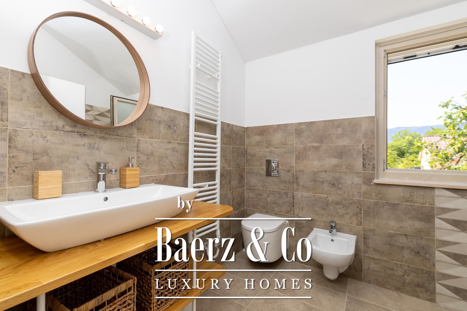 A seamless flow is evident from the entry hall into a contemporary kitchen and an additional summer kitchen, complemented by a spacious terrace of 24 m² and a terrace with a swimming pool, together creating an environment well-suited for private gatherings or quiet contemplation. The first floor arranges three bedrooms, each with an en suite bathroom, a dressing room, and a flexible studio space, all extending to generous terraces.