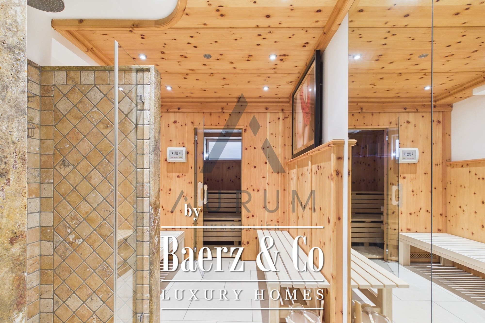 The layout balances privacy and openness. The master suite, with a walk-in closet and a travertine-adorned bathroom, forms a private retreat. Two additional bedrooms, each with access to a terrace or garden, share a further bathroom on the floor below. Wellness is intrinsic here, with a ground-level sauna, separate shower, and relaxation area.