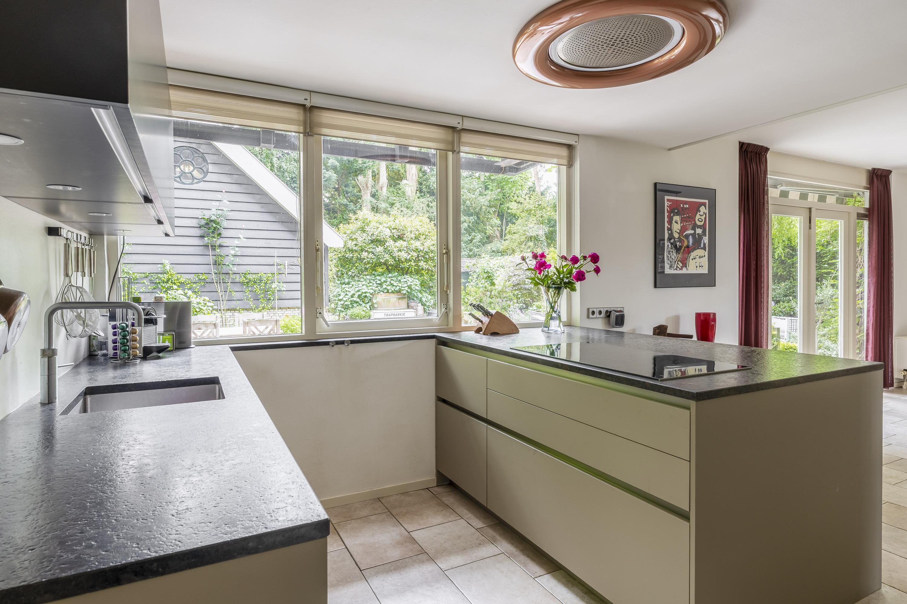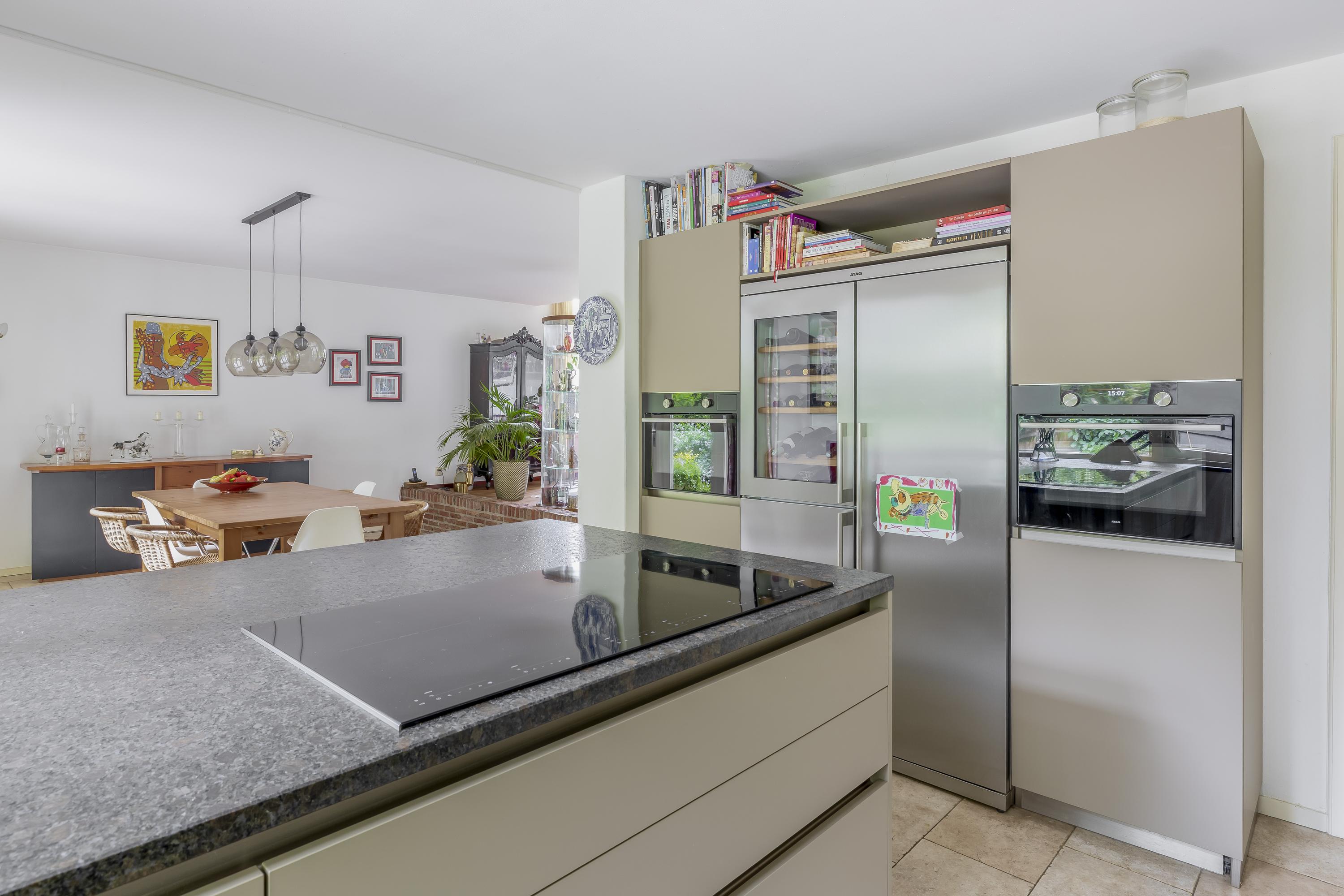 At the rear of the house lies the spacious kitchen, renovated about eight years ago. With a luxury layout and modern design—stone countertop, cooking island with induction hob and extractor, combi oven, steam oven, wine fridge, refrigerator, freezer, and dishwasher—it’s a dream for any cooking enthusiast. From the kitchen, you overlook the terrace and lush garden that surrounds the home.