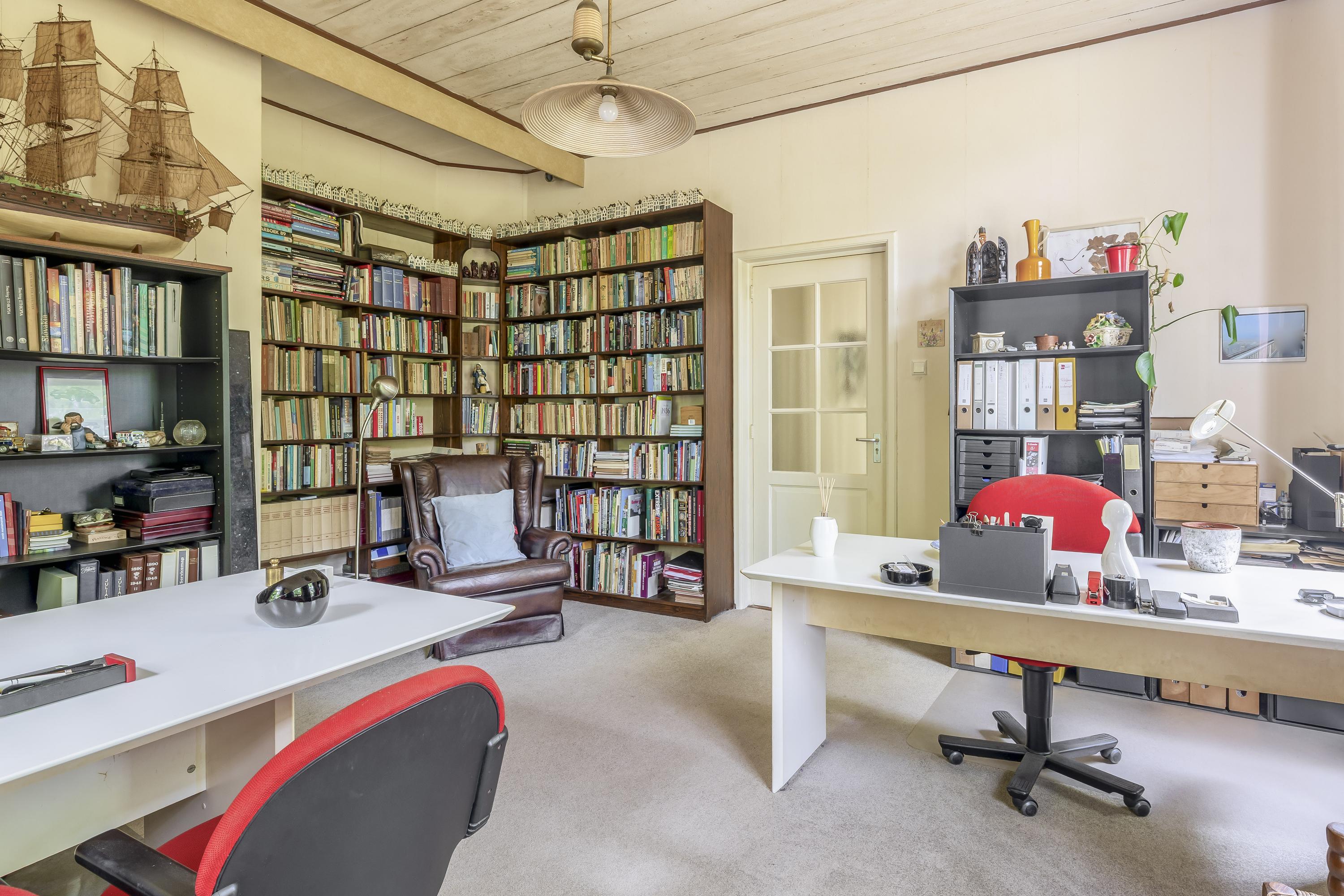 The house has a charming side entrance and an additional entrance at the front. From the hallway with cloakroom and toilet, you walk into the office—a bright and pleasant space with original sliding windows and carpeted flooring. The generous living room features a cozy open fireplace (a wood stove with a renewed flue) and seamlessly flows into the dining area, which has double French doors opening onto the sun-drenched garden.