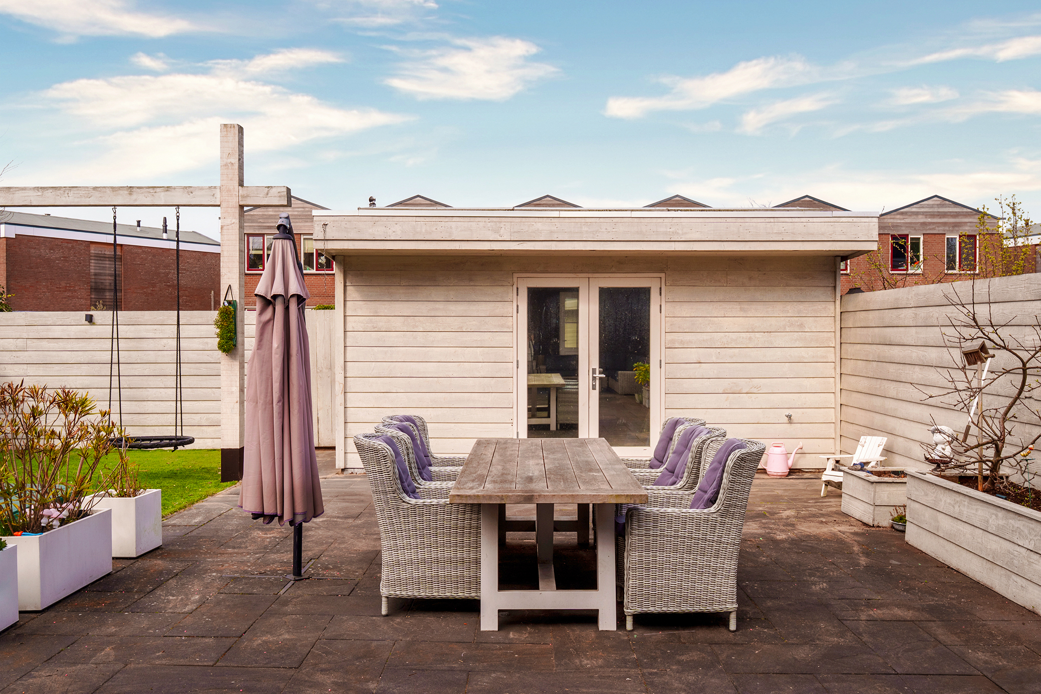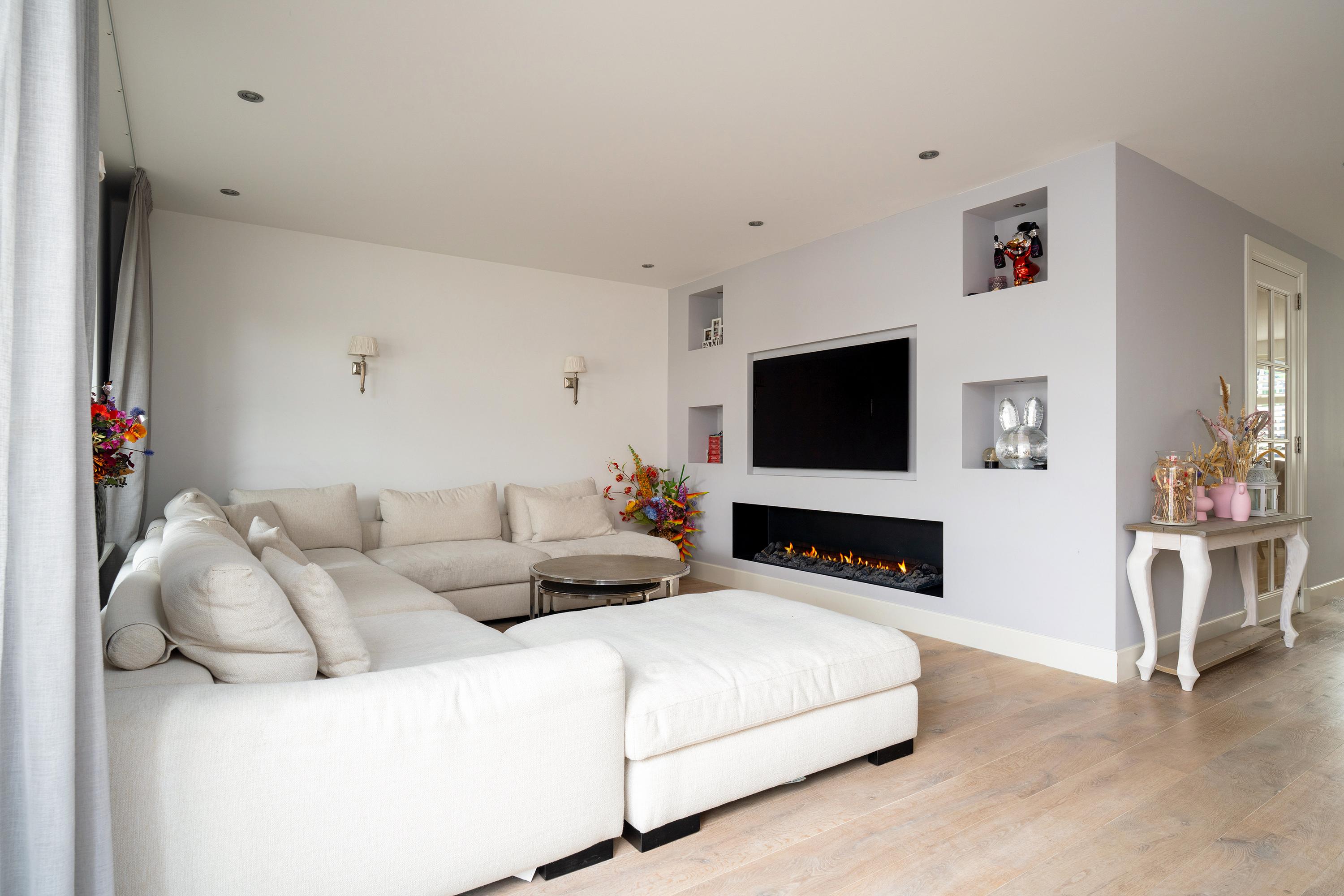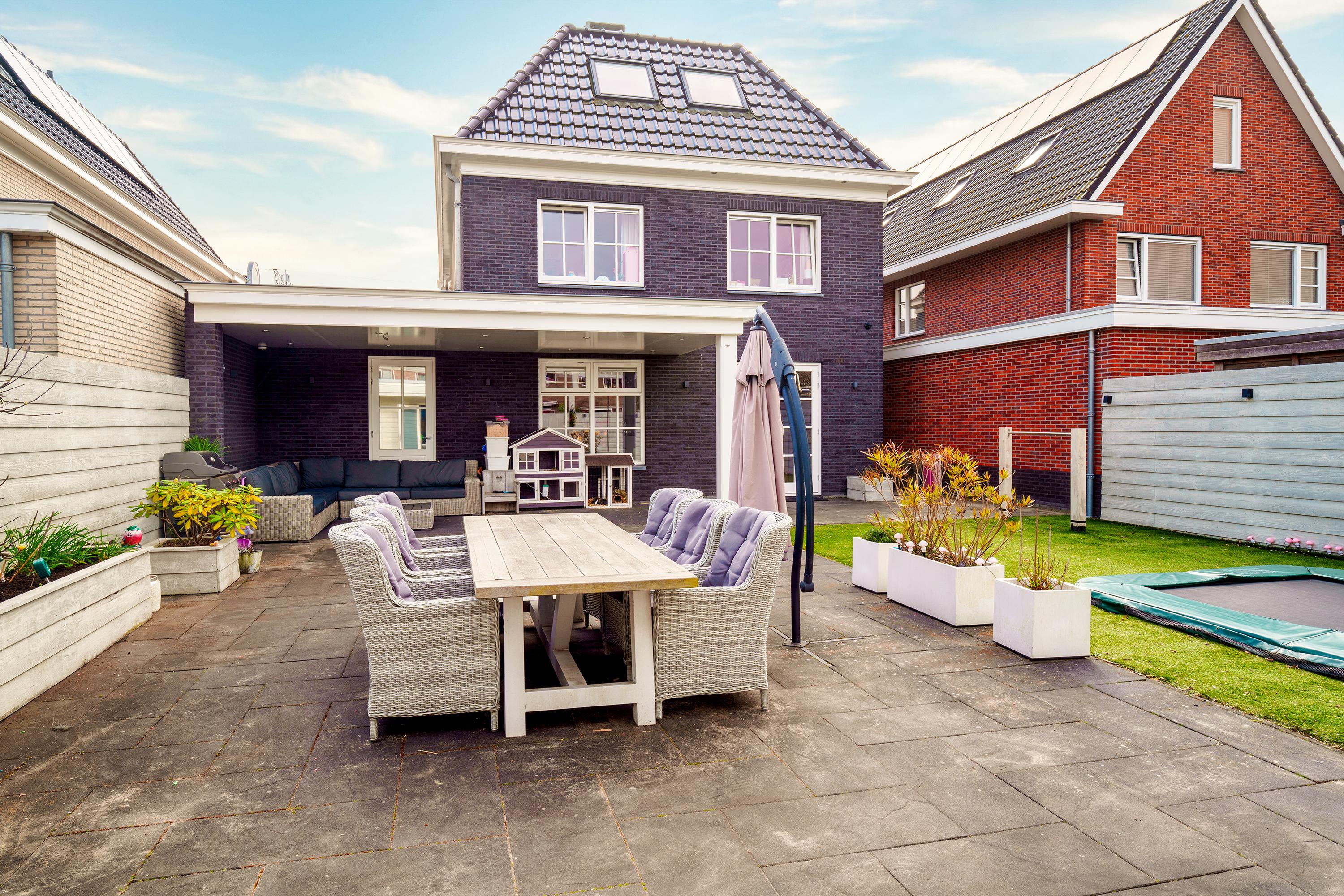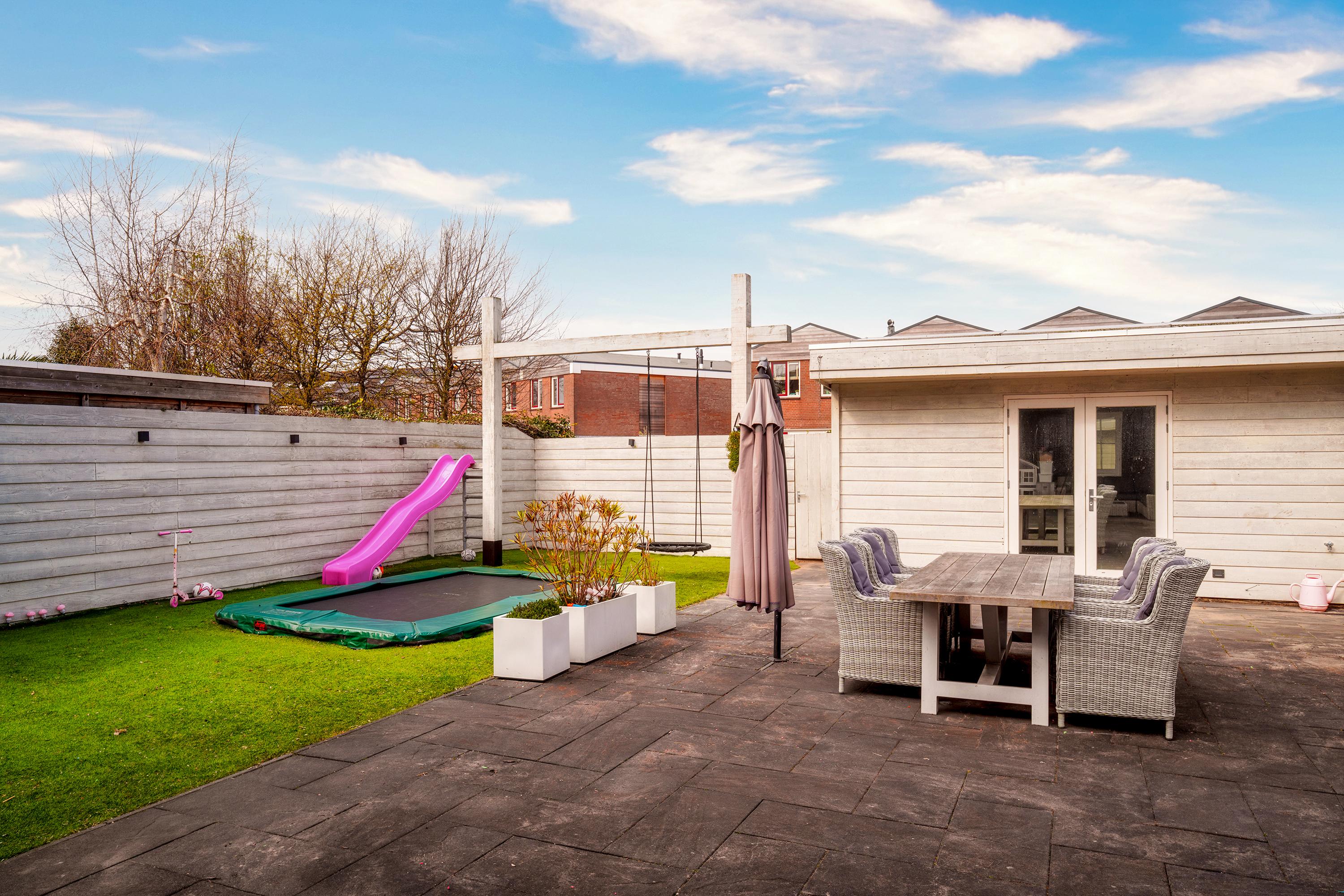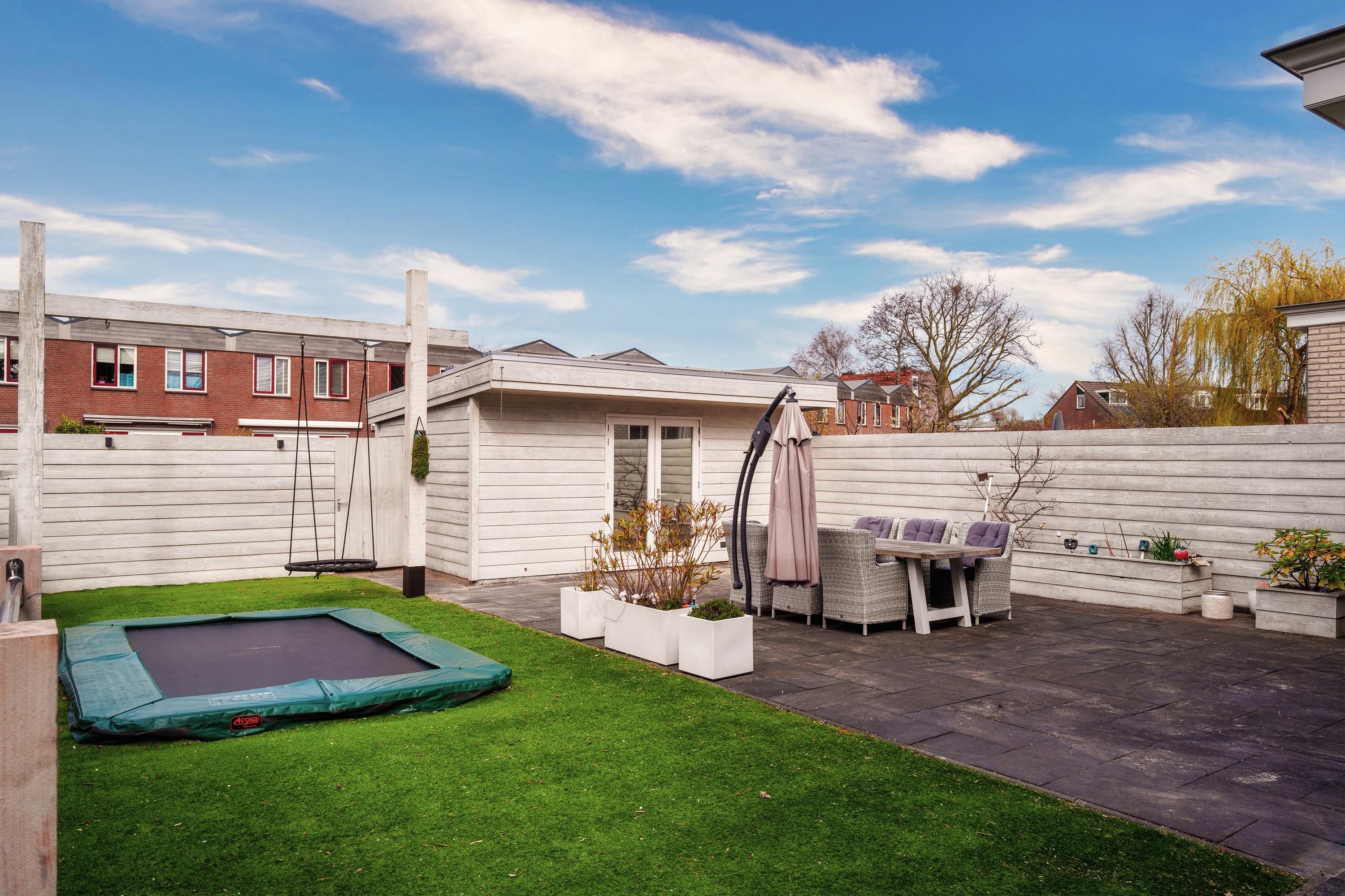 The living room at the garden side is cozy, with a striking cinewall and fireplace. From here, you walk through the double doors into the garden with a very large porch. Perfect for long evenings and outdoor gatherings on the terrace. Built-in trampoline and a swing for the kids. With a glass of wine in hand, you can keep a (small) eye on things. The garden cushions and those of your sloop can be neatly stored in the wooden shed. And that sloop? You simply moor it directly behind the house. On a beautiful summer day, you can sail straight to Amsterdam.