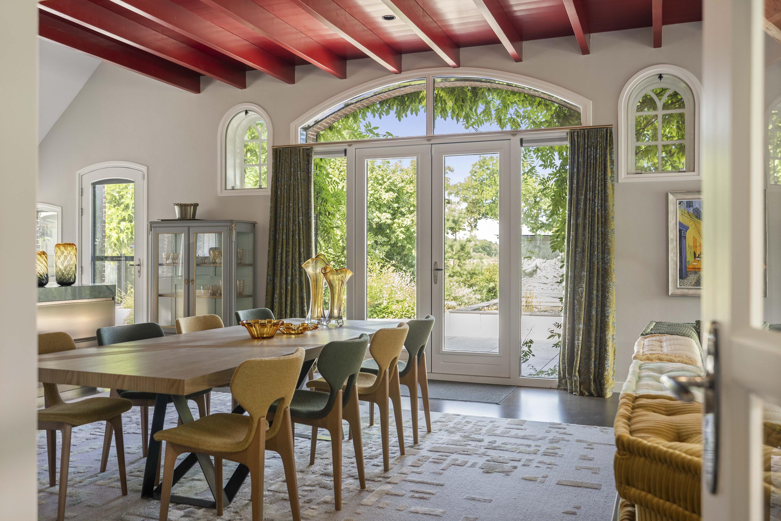 The kitchen-diner, located in the former barn, spans over 70 m² and, with the barn doors now filled with glass, offers a spectacular view of the garden.