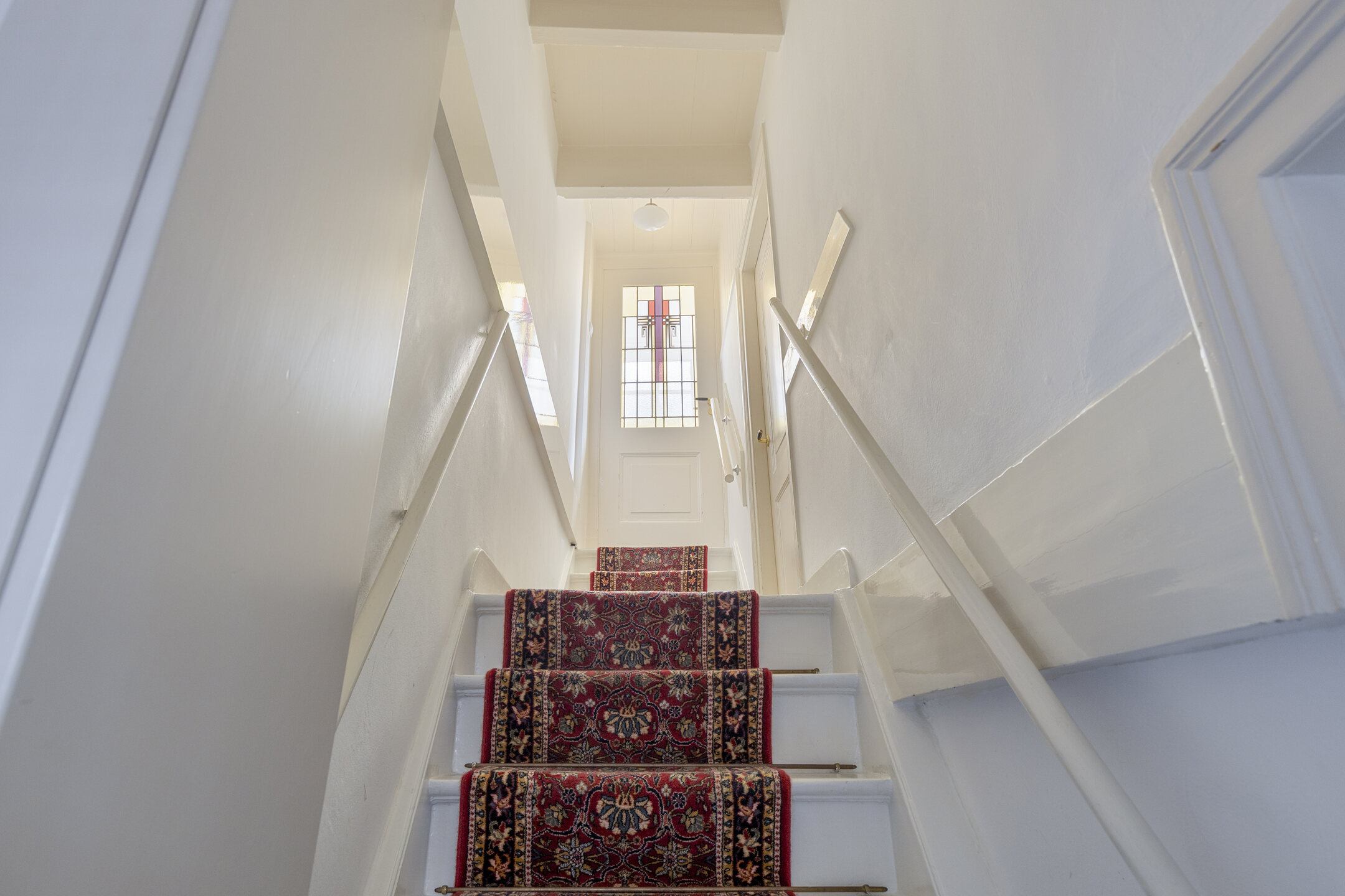 The layout is playful and spacious, spread over several levels. A private entrance at street level leads to the basement, which offers practical space and storage. The living floors contain the kitchen, several bedrooms, and bathrooms, connected by hallways and landings that create a pleasant flow throughout the home. On the top floor, there is a bedroom with direct access to the roof terrace, a wonderful spot offering privacy and views of the historic buildings. There is also a mezzanine that is ideal as a workspace, studio, or additional living space.