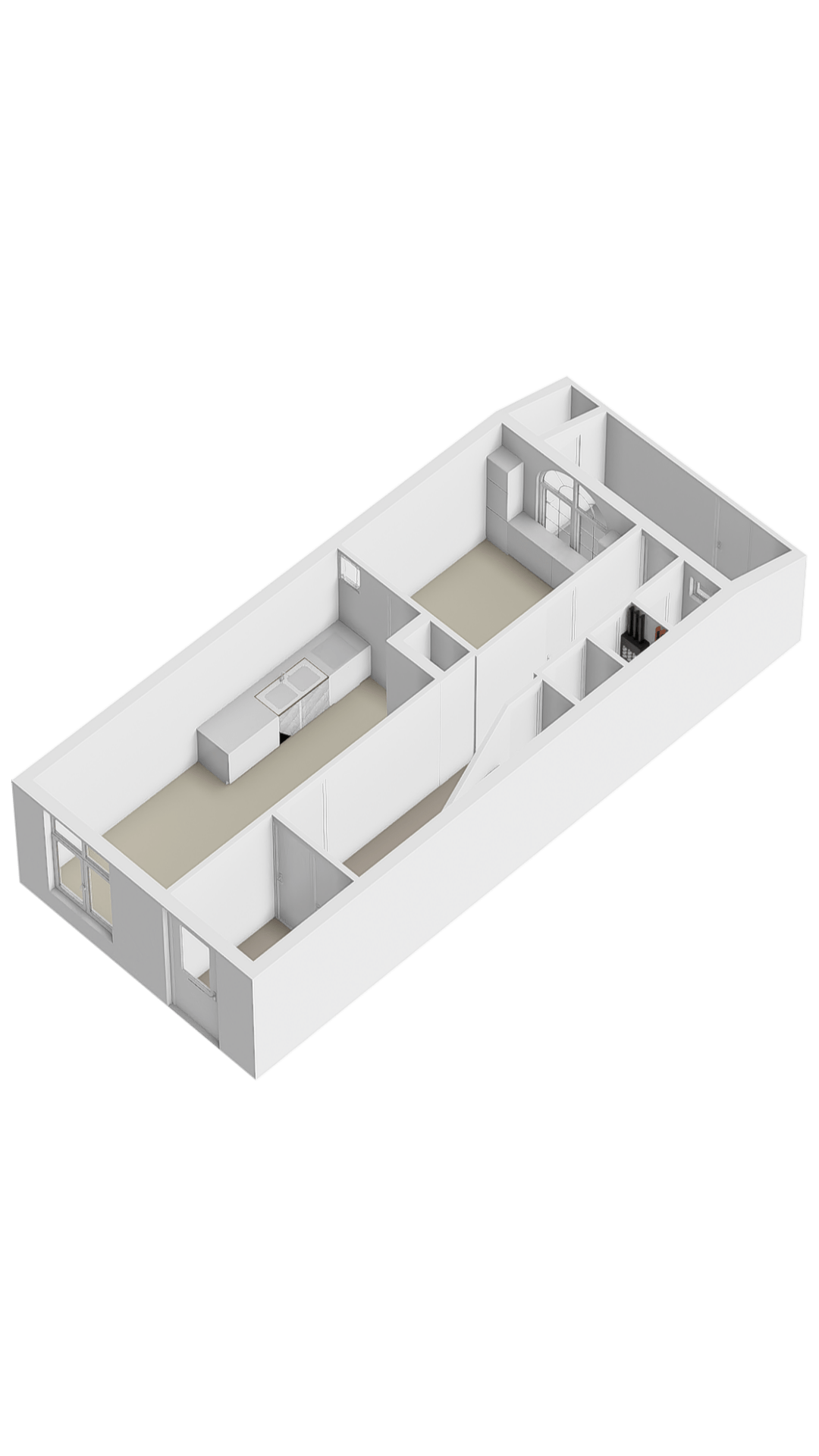 Landing with a bedroom at the front over the entire width with a storage space / walk-in closet in the middle. At the rear are a second bedroom and the second bathroom with shower, bath and toilet.