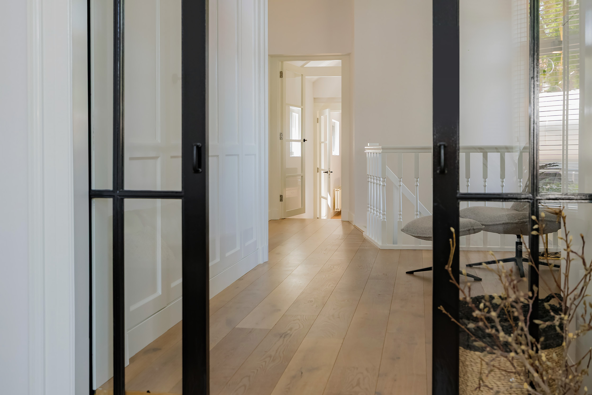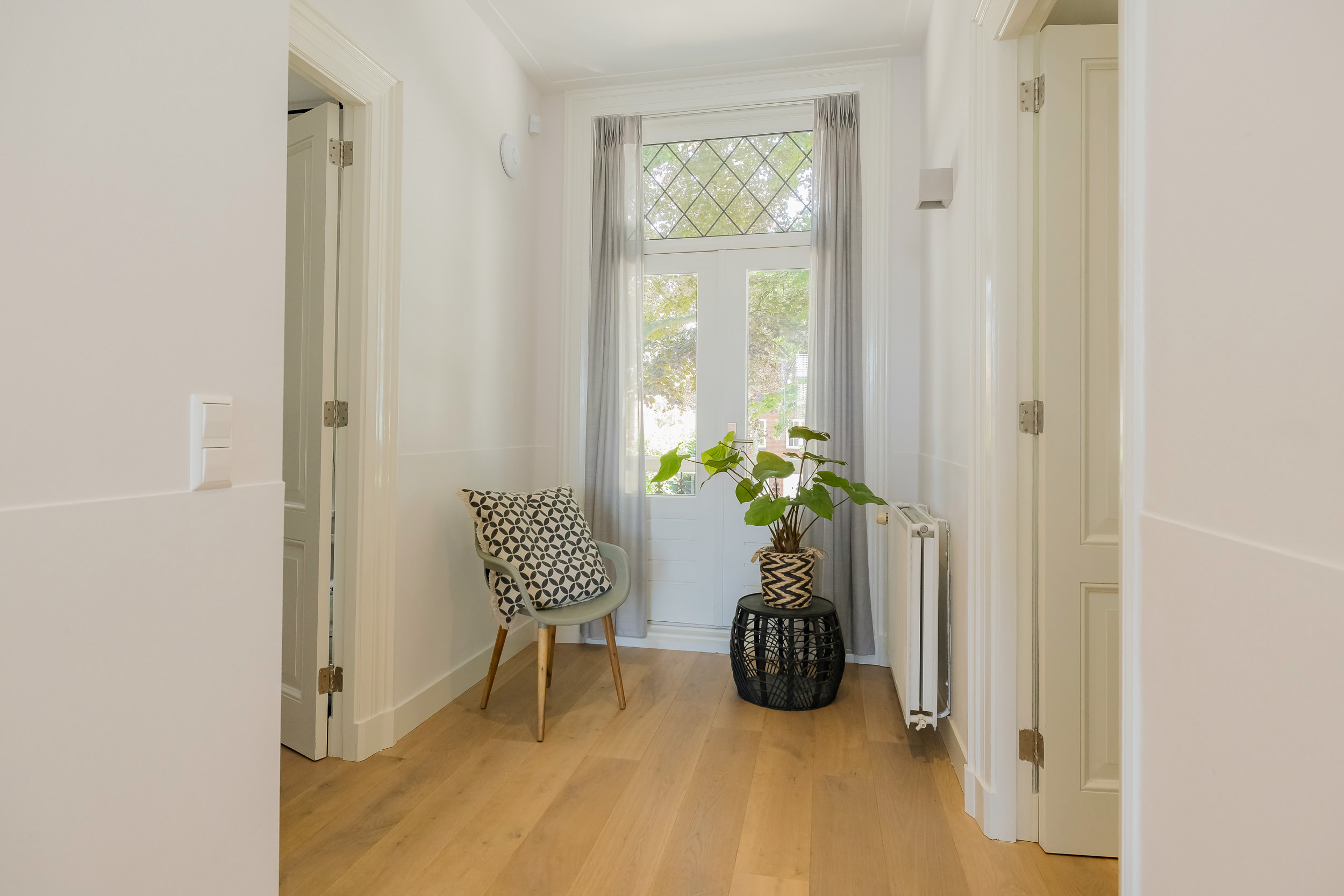 Beautiful porch in which the striking high front door, imposing long hall with the restored authentic granito floor, checkroom and toilet room and a door to the garden. To the left of the hall a very spacious living/living kitchen with luxury kitchen design in matte white, beautiful cooking and sink island with wooden breakfast bar and all appliances including a beautiful wine refrigerator. Also a cozy gas fireplace and the large rear facade with lots of glass and French doors to the garden are not lacking. To the right of the hall there is a TV/sitting room with a gas fireplace and double doors give access to the upstairs room. This upstairs room with a large custom-made closet wall is very suitable as a play/or work room and has a staircase to the large dry cellar with standing height. In the former cell complex is a beautiful study created, a storage room, a technical room and there is one cell preserved in its original state. The indoor garage is large and includes an electric segment door with wicket door and a fixed staircase to spacious storage attic.