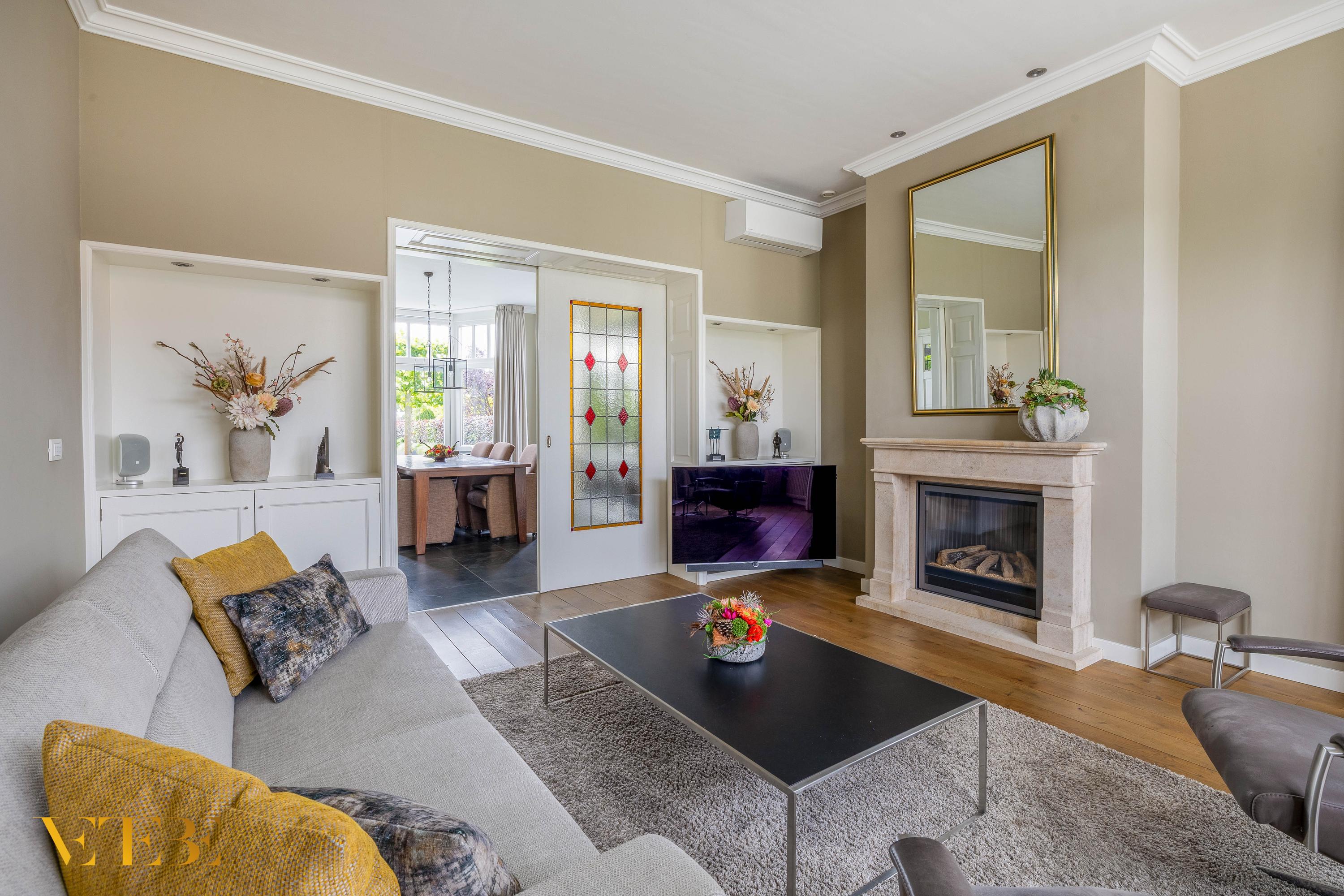 The light-filled living room features a wooden floor in the front section. The bay window provides a view of the front garden. This area also includes a beautiful gas fireplace, air conditioning, and two wall cupboards. The stunning en-suite doors with stained glass lead to the dining room, which has a tiled floor and an additional wall cupboard. French doors provide access to the garden. The living room measures approximately 53 m².