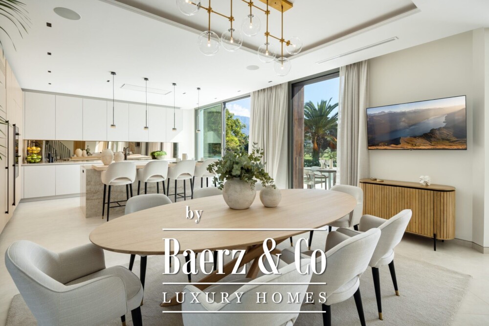 Inside, five en-suite bedrooms and an additional guest toilet ensure clarity of space and dignity for both daily living and entertaining. High ceilings, expansive windows, and premium finishes define the atmosphere, while warm LED lighting, wood accents, and carefully integrated stonework lend quiet character. The generous kitchen features high-end appliances, an oversized island, and extended views toward the infinity pool, jacuzzi, and fairways beyond. Each principal living area is positioned to maximize sunlight and frame panoramic perspectives of La Concha mountain, the golf course, and a tranquil lake.