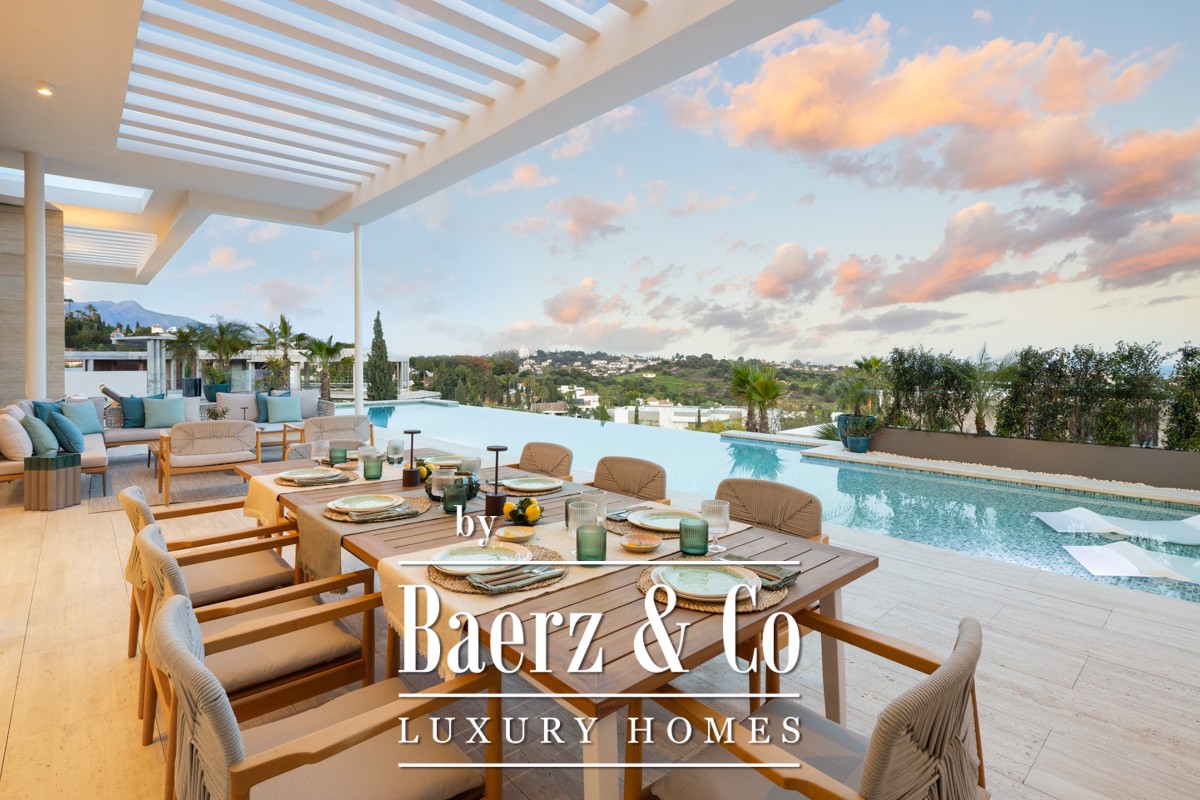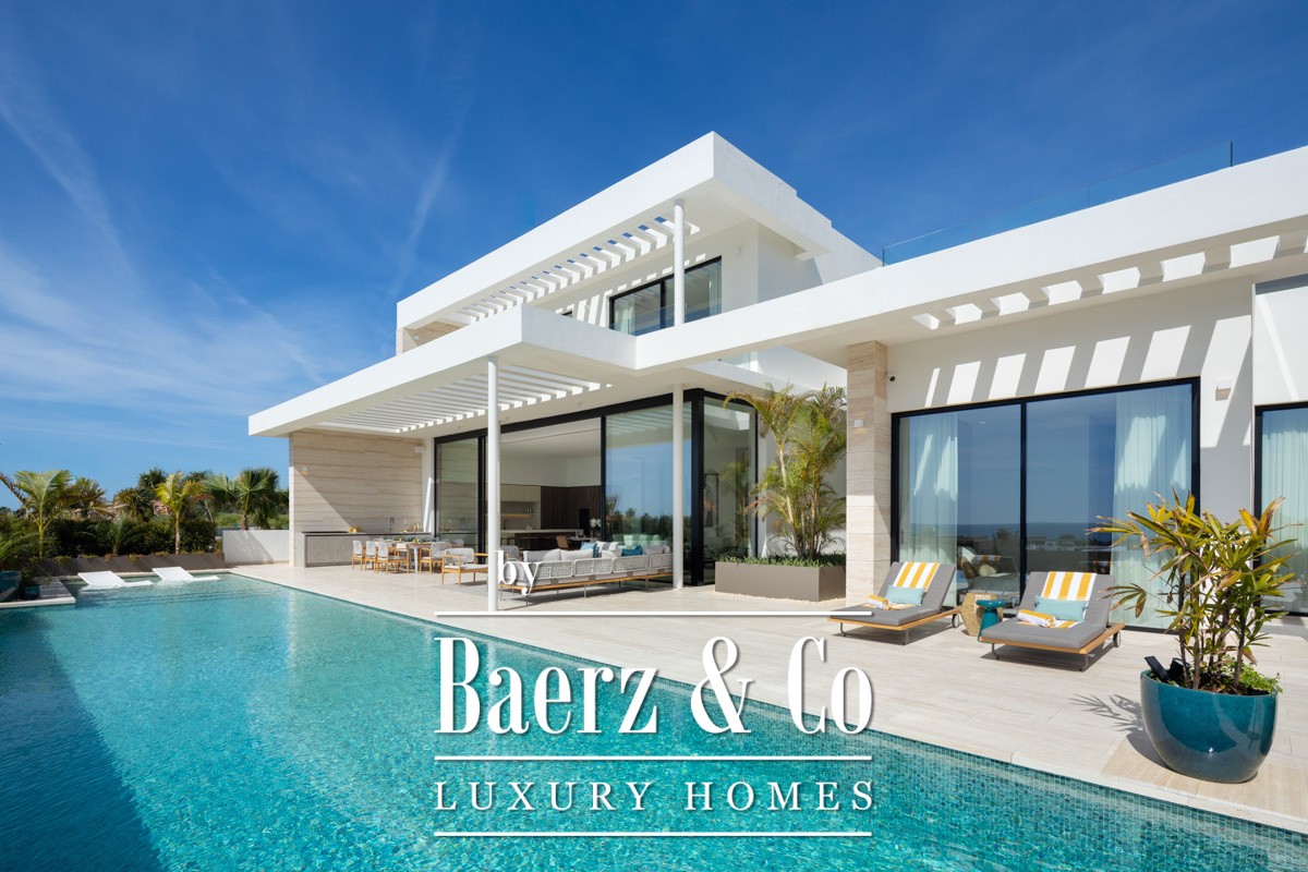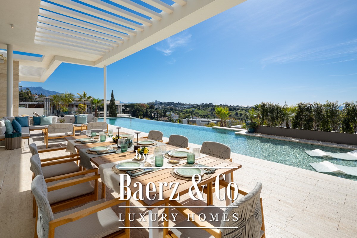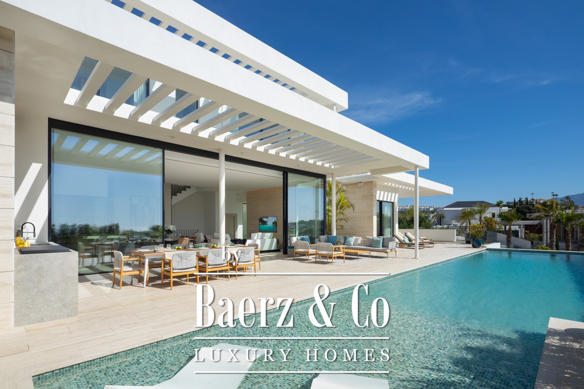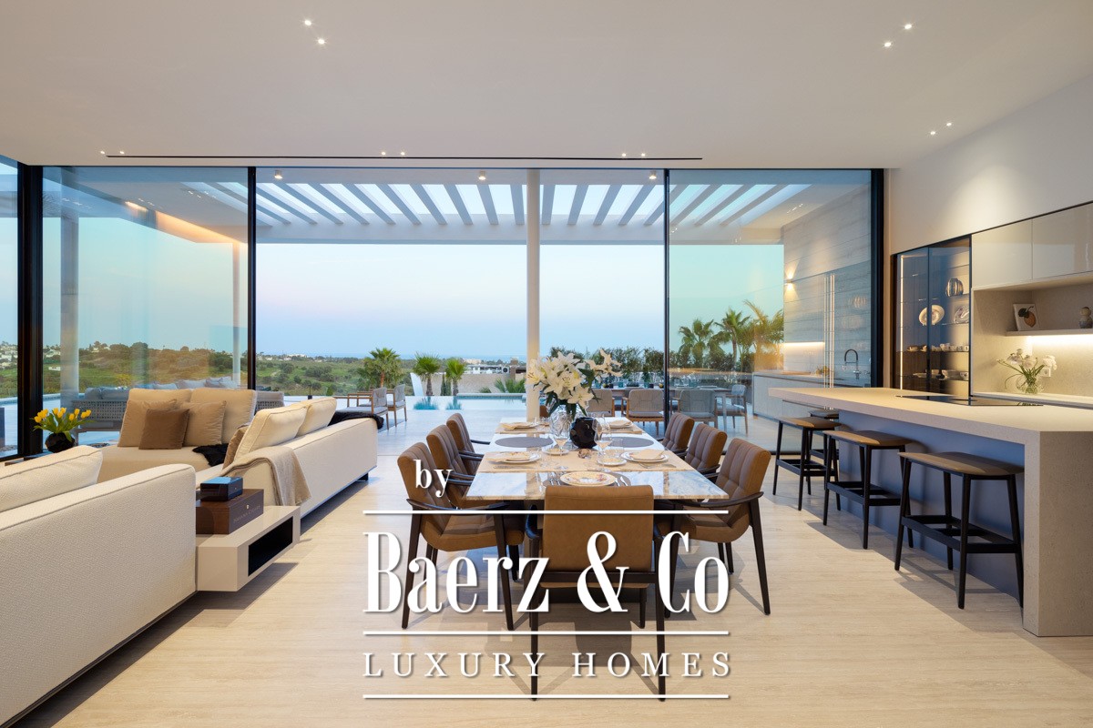 Introducing a brand-new modern villa located in the exclusive gated community of Los Flamingos, Benahavís. Set on an elevated plot, this home offers panoramic views and is part of a limited collection of four luxury properties. With its sleek geometric design and expansive terraces—partially covered for year-round enjoyment—this villa is built for stylish outdoor living. A striking zero-edge infinity pool adds to the home’s appeal, ideal for entertaining or relaxing under the sun.