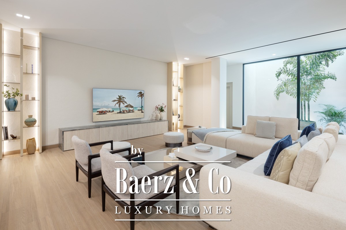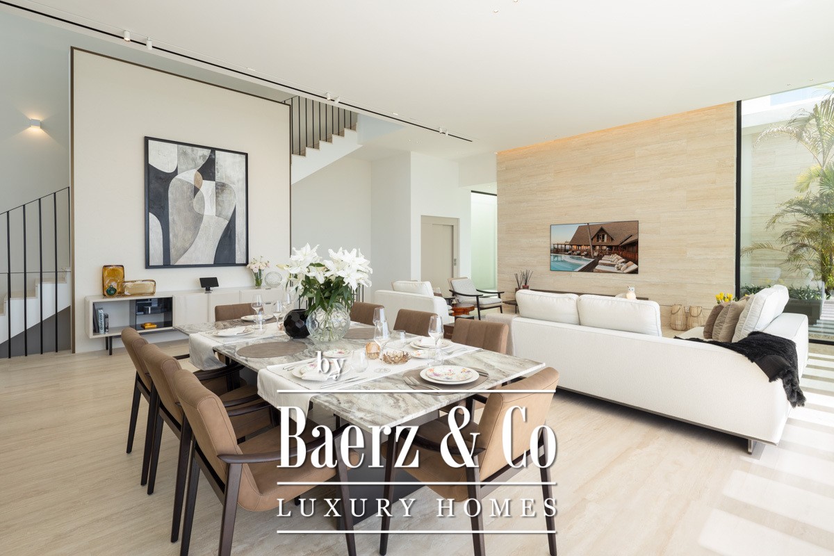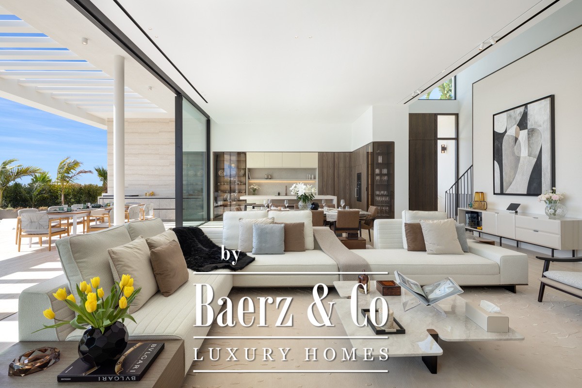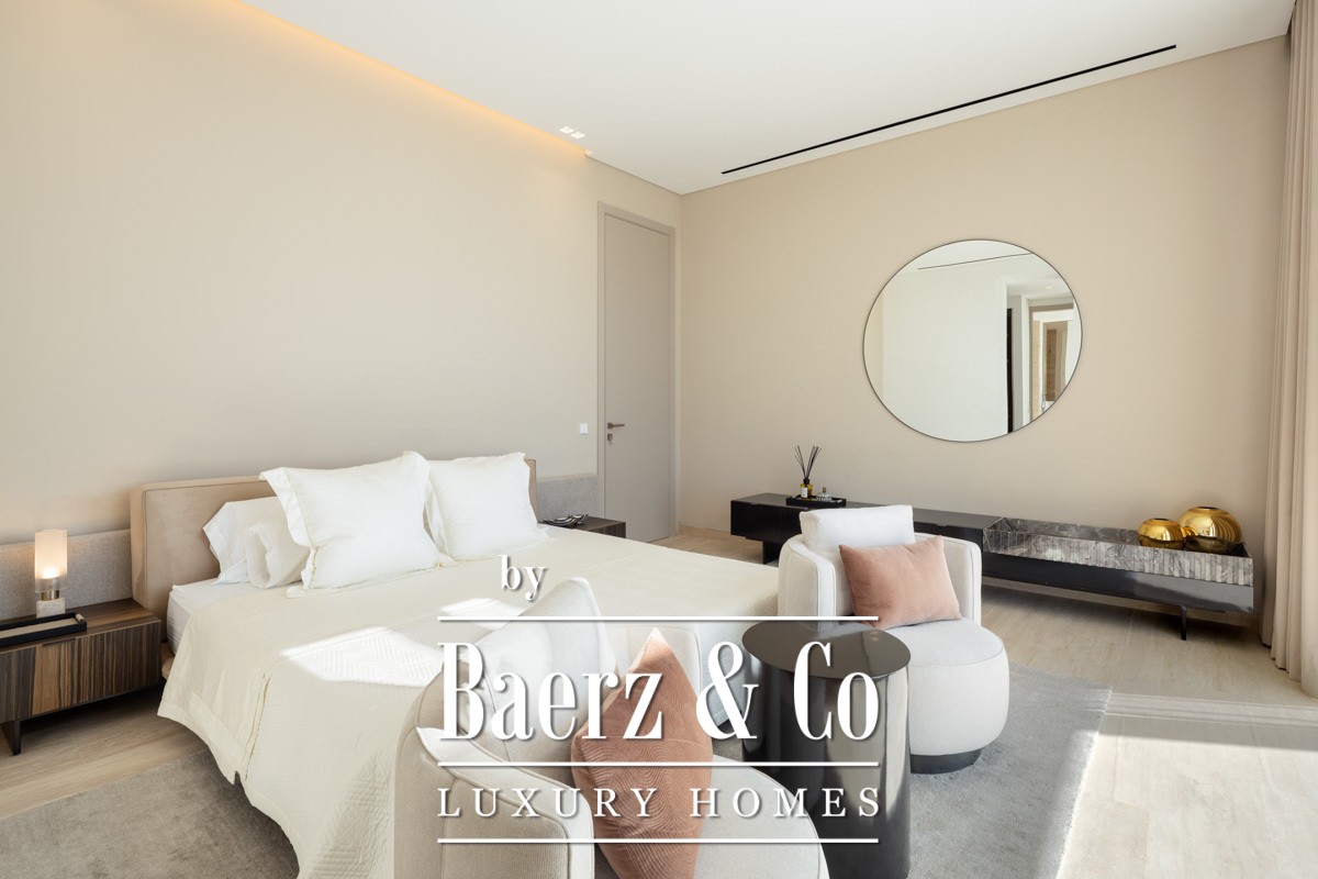 Inside, the open-plan layout flows seamlessly between the living, dining, and kitchen areas, enhanced by floor-to-ceiling sliding doors that connect the interior to the terraces. The design features a clean, neutral palette and high-end finishes throughout. With six spacious, elegantly designed bedrooms, the home combines comfort with contemporary style.