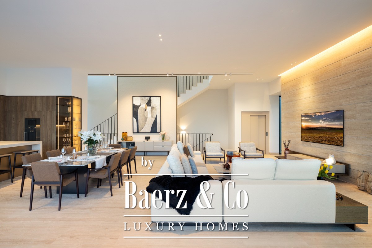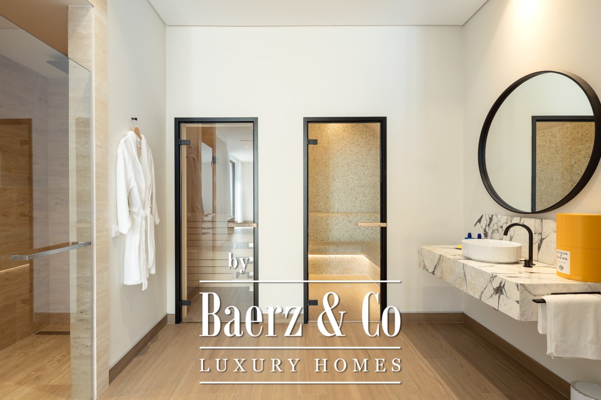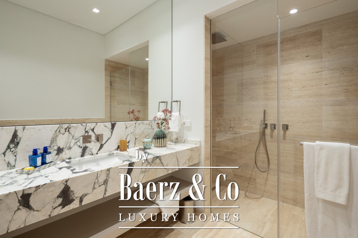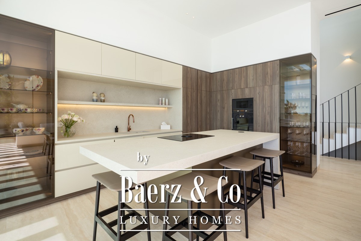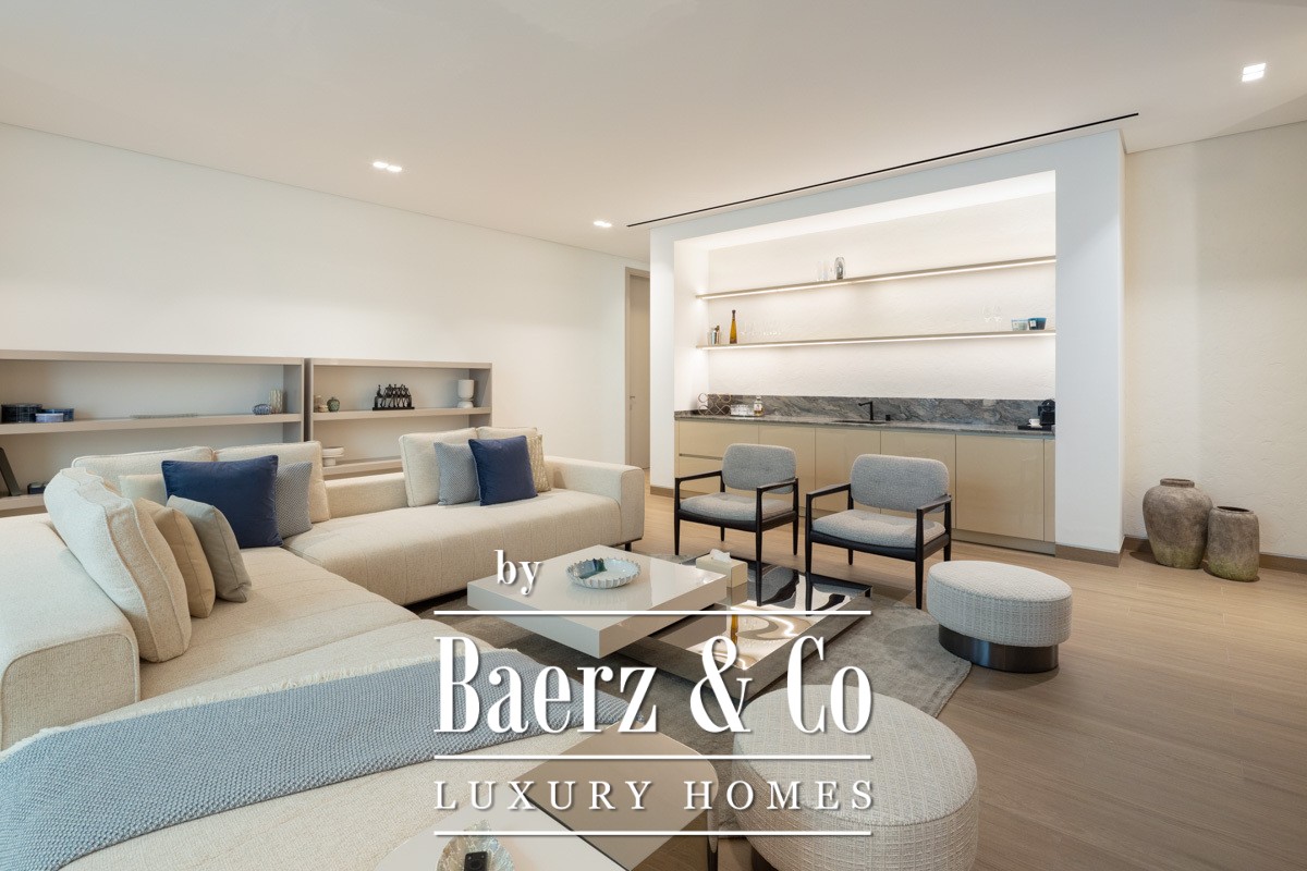 Inside, the open-plan layout flows seamlessly between the living, dining, and kitchen areas, enhanced by floor-to-ceiling sliding doors that connect the interior to the terraces. The design features a clean, neutral palette and high-end finishes throughout. With six spacious, elegantly designed bedrooms, the home combines comfort with contemporary style.