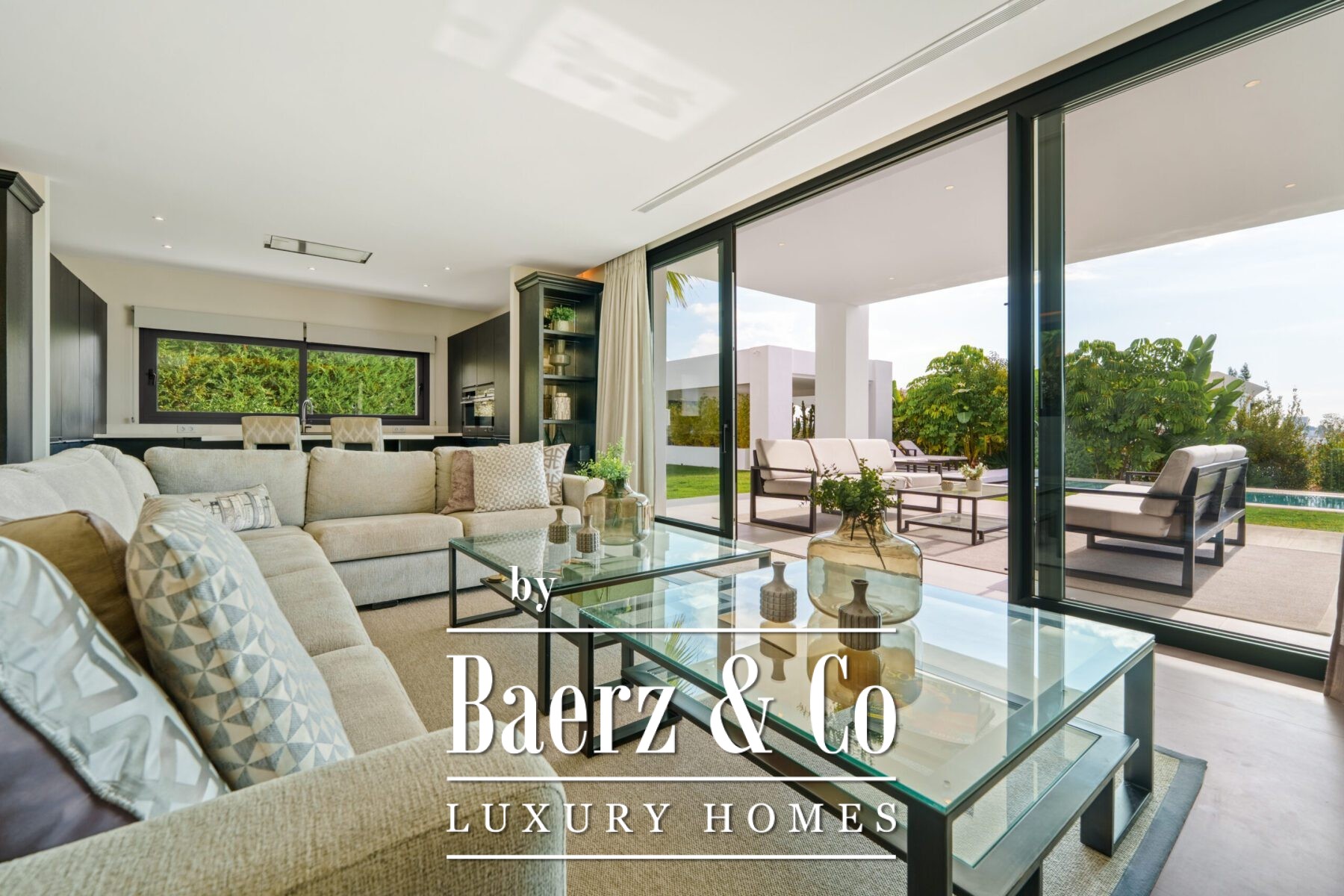 Contemporary villa Marbella defines a new standard for modern living in one of Marbella’s most coveted locations. This residence extends across 581 m² of living space, where a fluid open-plan design draws together the lounge, dining area, and fully equipped kitchen. Floor-to-ceiling glass doors connect the interior seamlessly to the outdoors, inviting natural light and offering views across the private plot of 1231 m².