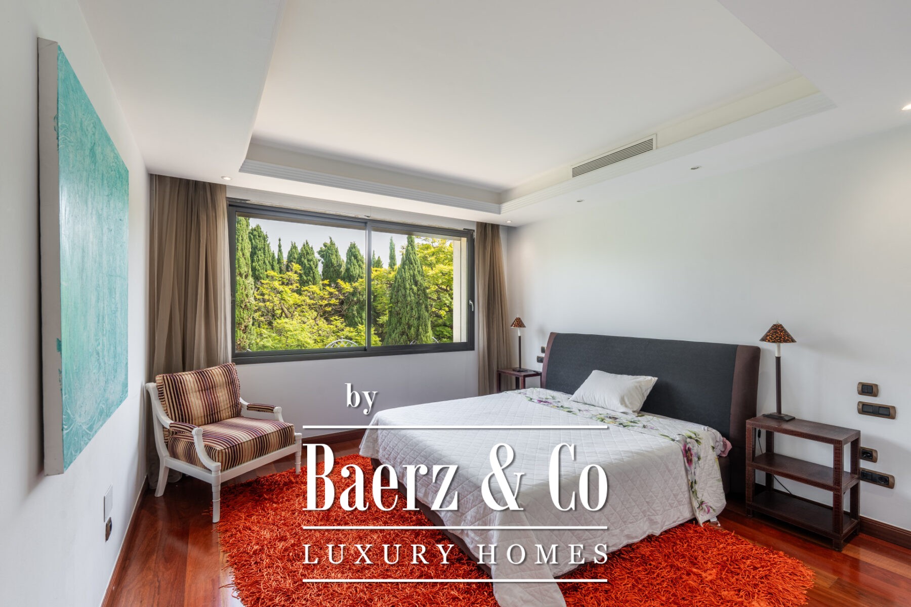The main living space is generous, inviting both quiet retreat and effortless entertaining. Wide sliding doors extend the living area onto covered and open terraces, allowing a seamless transition between interior comfort and the expansive outdoors. A fully fitted kitchen, paired with a secondary service entrance and potential for a discreet dirty kitchen, is designed for those who value both function and form.