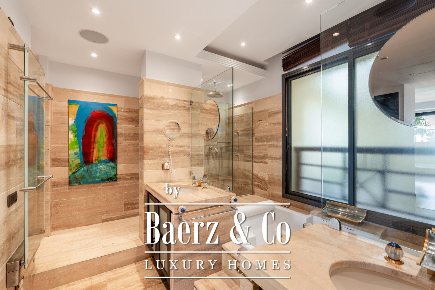 The apartment’s core comprises three bedrooms, each with en-suite bathroom. The primary suite combines a dedicated walk-in closet and a private terrace, offering breathtaking sea views. Two additional guest toilets provide further convenience for both residents and visitors.