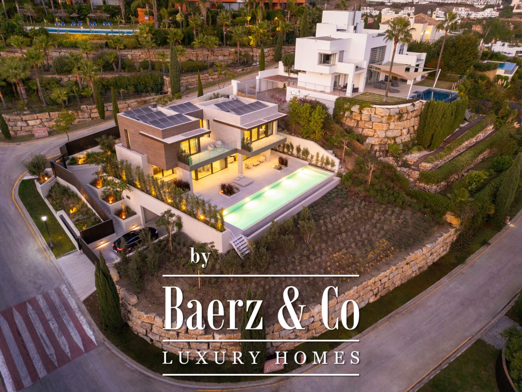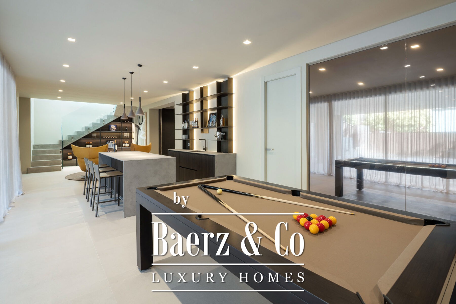 Villa Marbella in Los Flamingos is an architectural sanctuary set within a coveted gated community, embracing 540 m² of refined living space on a 1,330 m² plot. This villa Marbella in Los Flamingos welcomes you with five spacious bedrooms and five bathrooms, balancing sophisticated comfort with a sense of ease. Clean modern lines echo throughout, from the Modulnova kitchen to the polished concrete staircase and expansive Schüco windows, opening interiors to the Andalusian light.