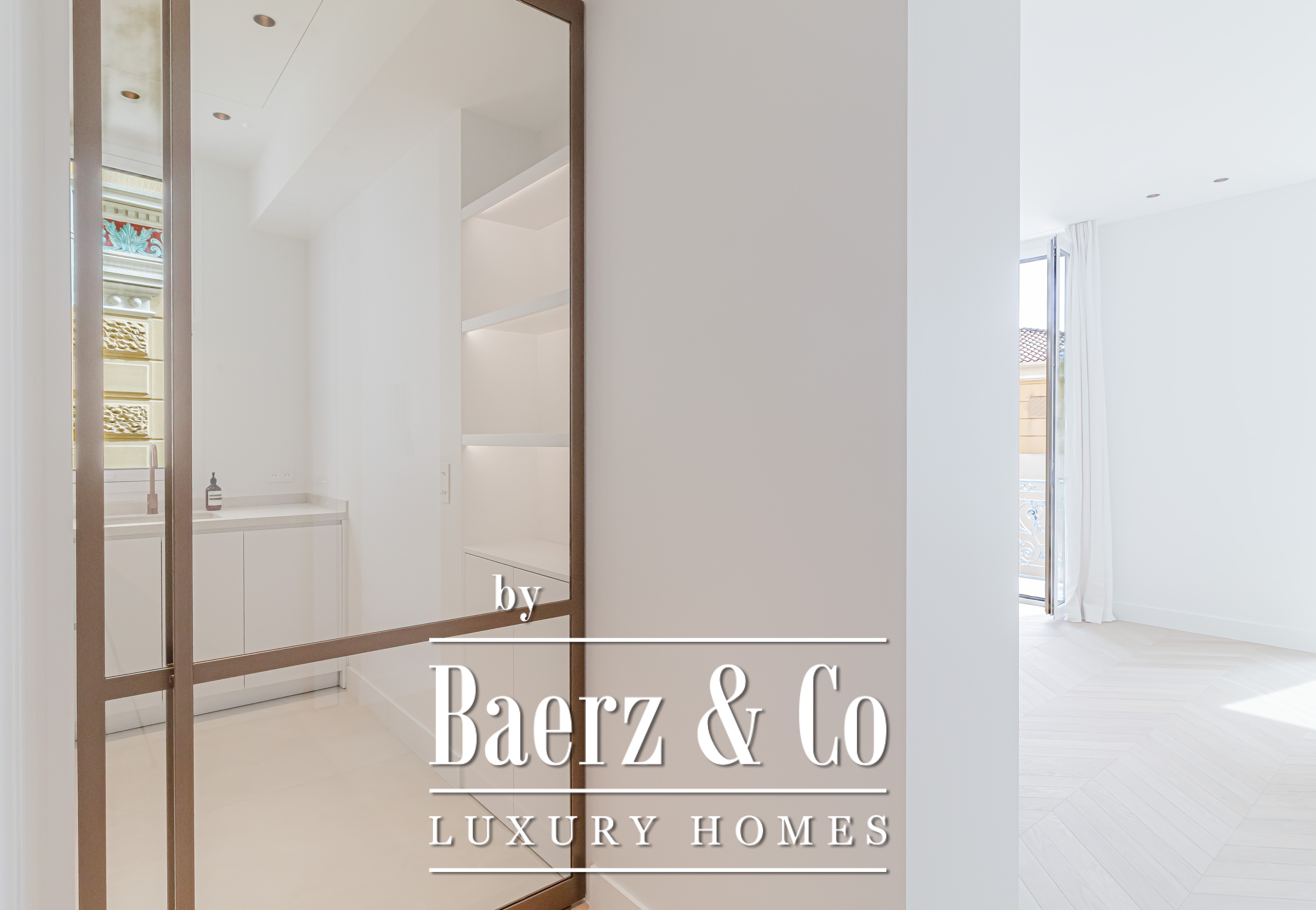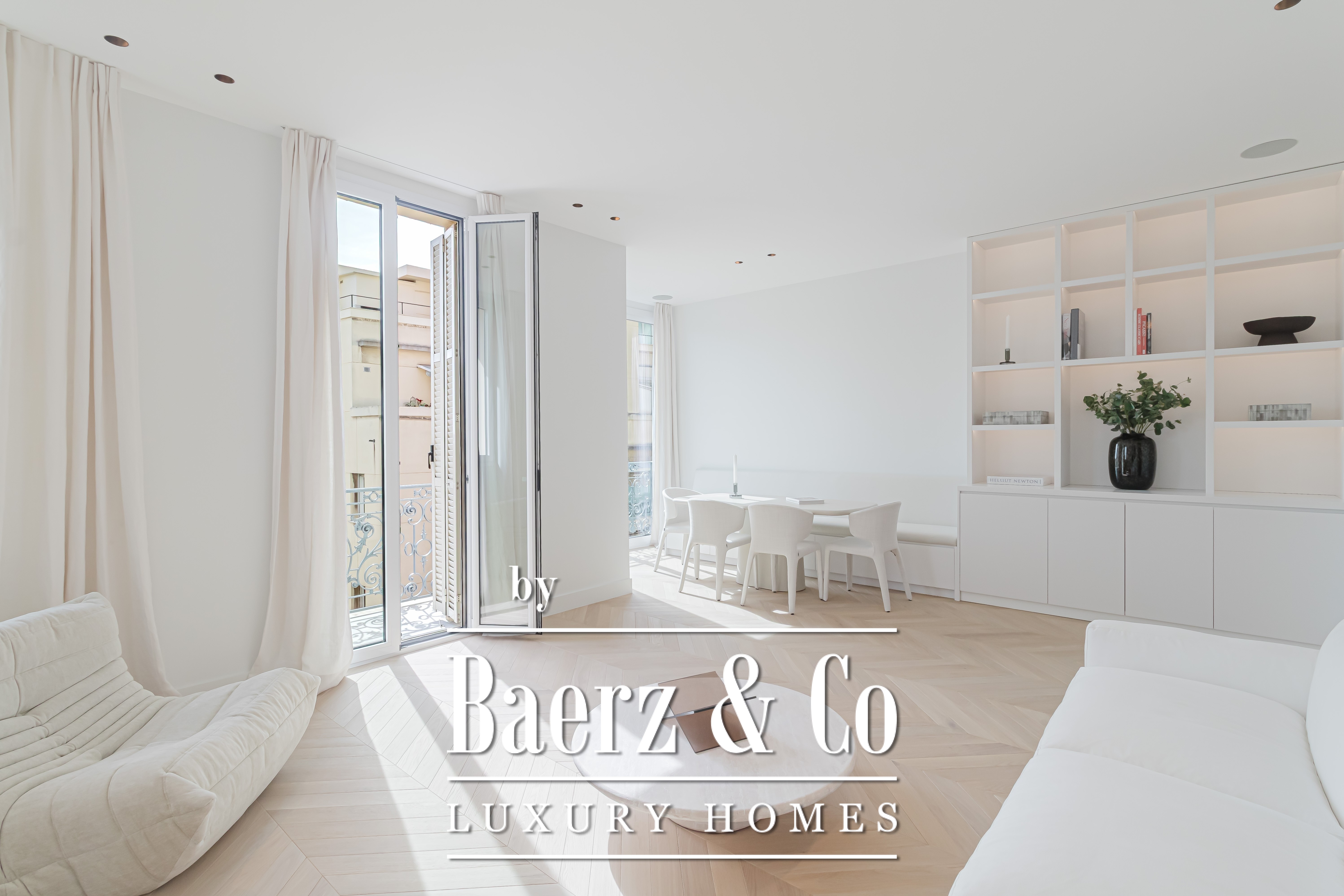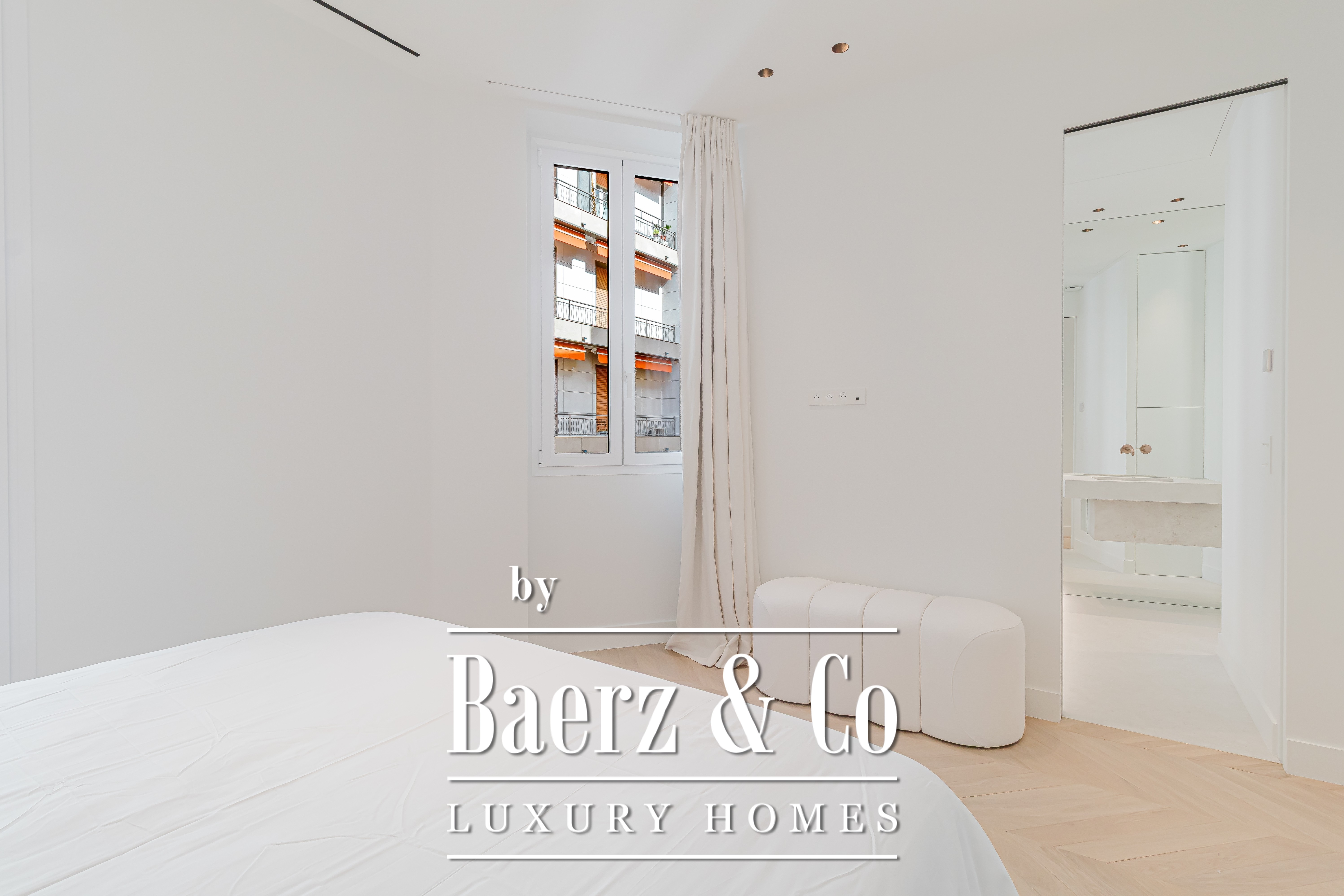 The property has been thoughtfully renovated and currently features two bedrooms and two bathrooms. The generous double living room opens to a private balcony, while a separate kitchen provides both privacy and functionality. Throughout the apartment, contemporary interiors are complemented by luxurious finishes such as a Corian bathtub, fitted wardrobes, new aluminium window frames, and dimmable LED lighting.