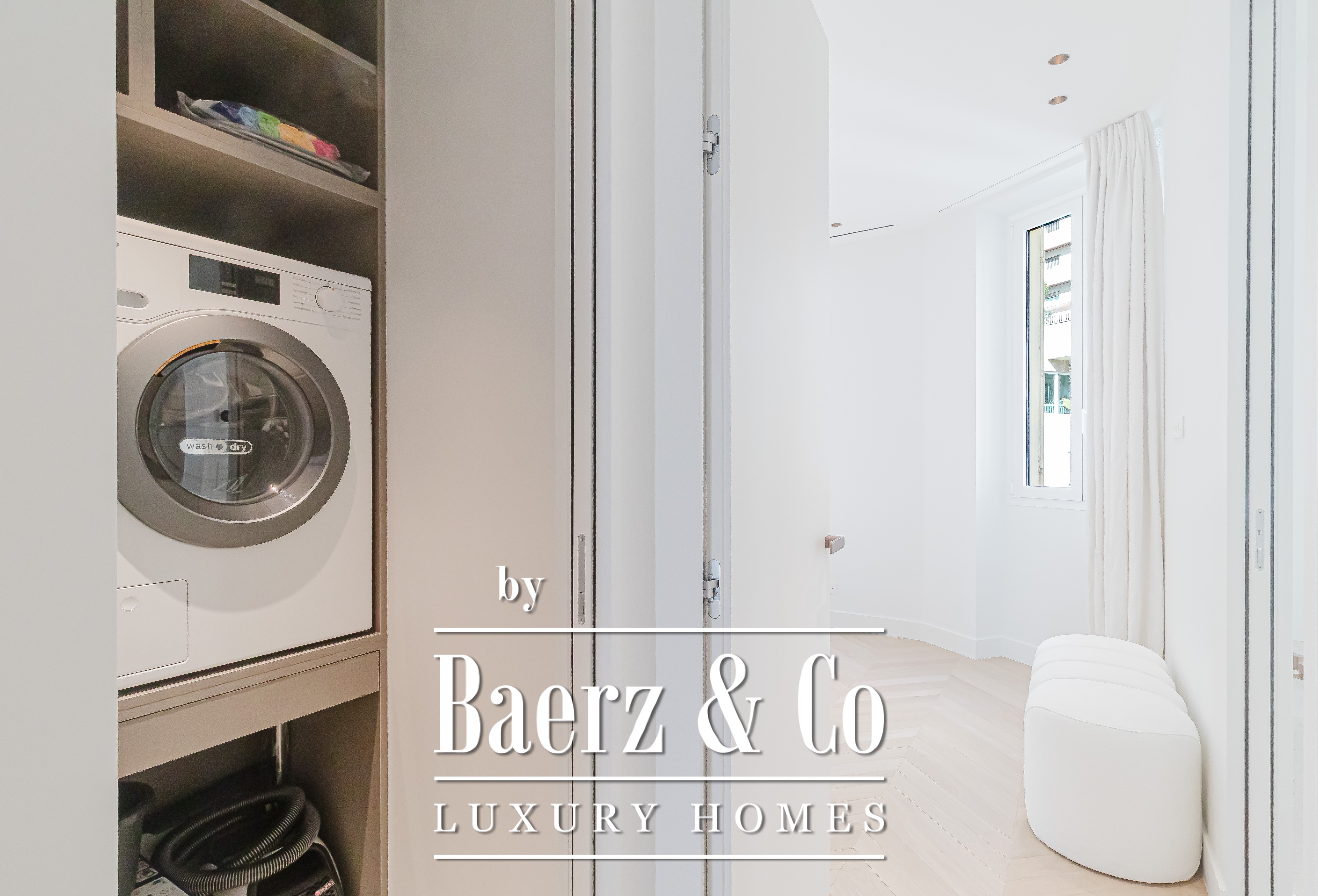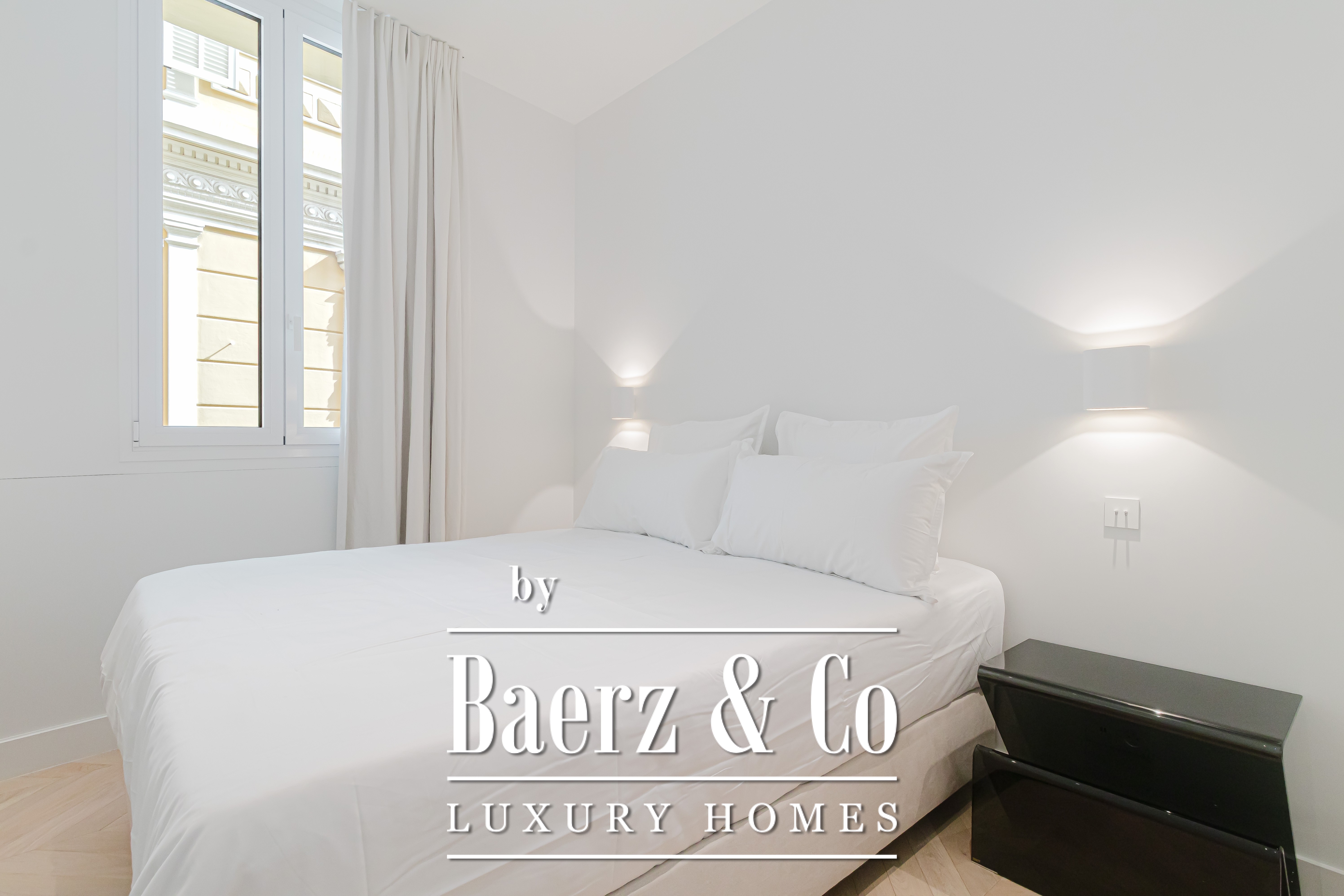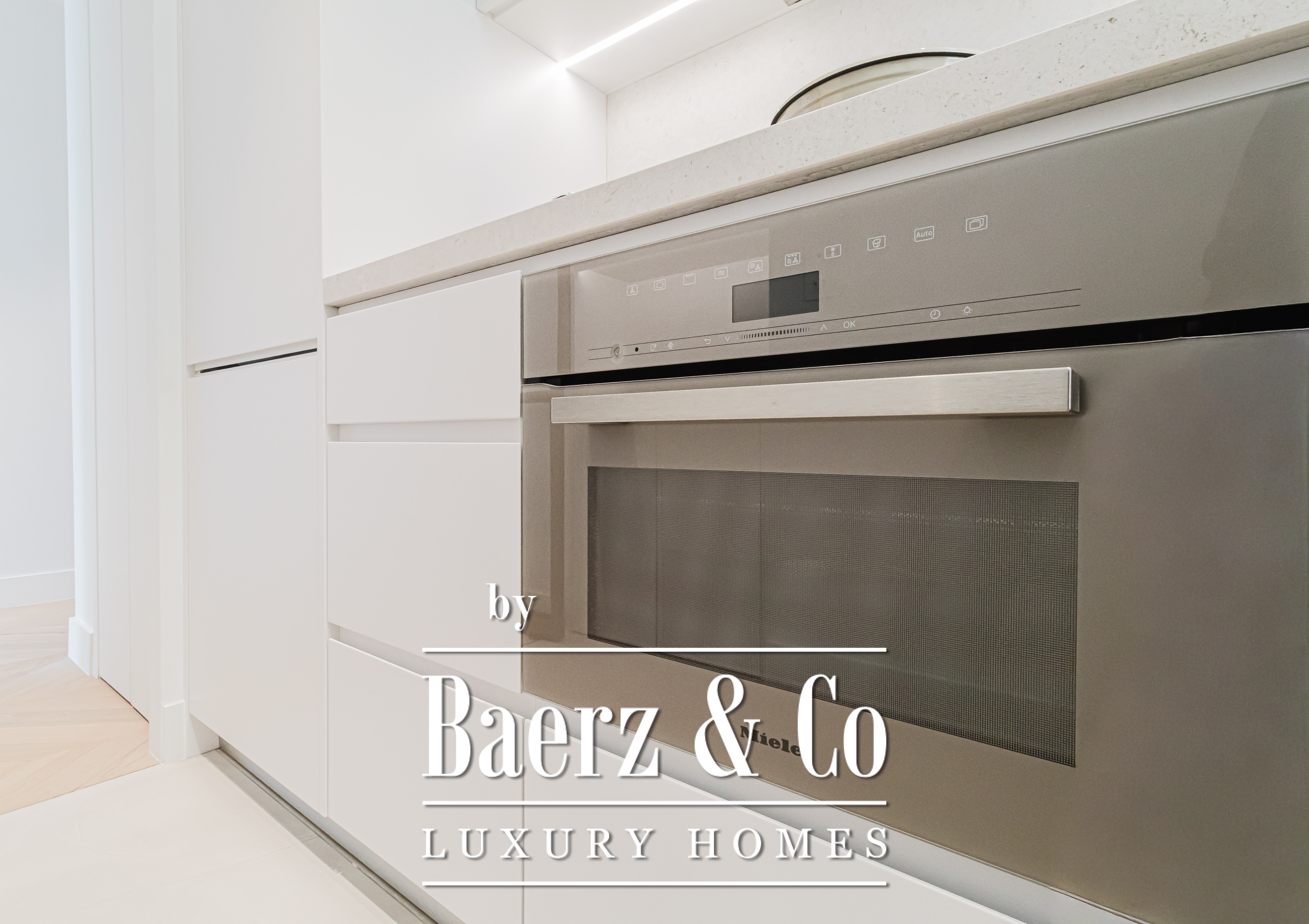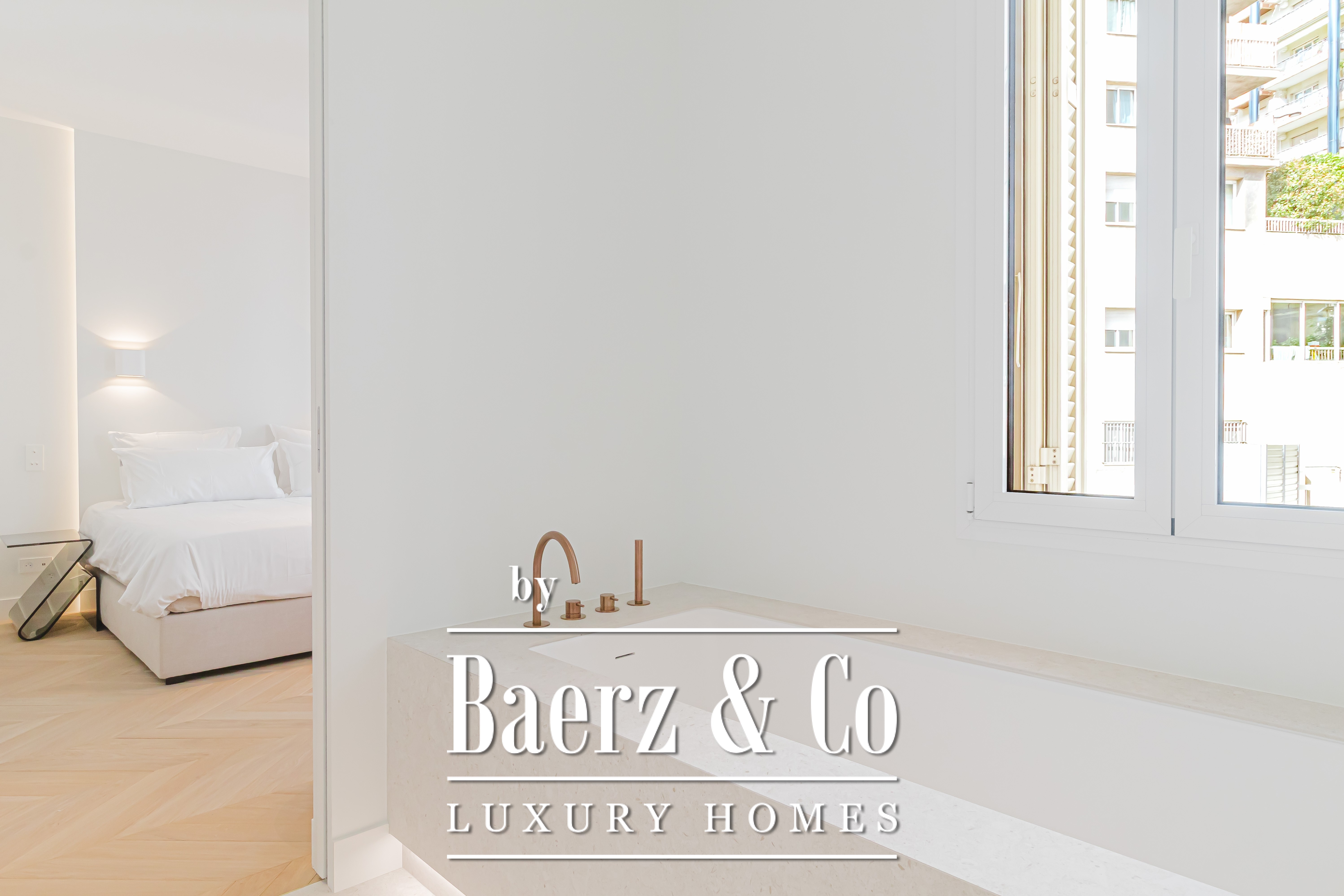 The property has been thoughtfully renovated and currently features two bedrooms and two bathrooms. The generous double living room opens to a private balcony, while a separate kitchen provides both privacy and functionality. Throughout the apartment, contemporary interiors are complemented by luxurious finishes such as a Corian bathtub, fitted wardrobes, new aluminium window frames, and dimmable LED lighting.