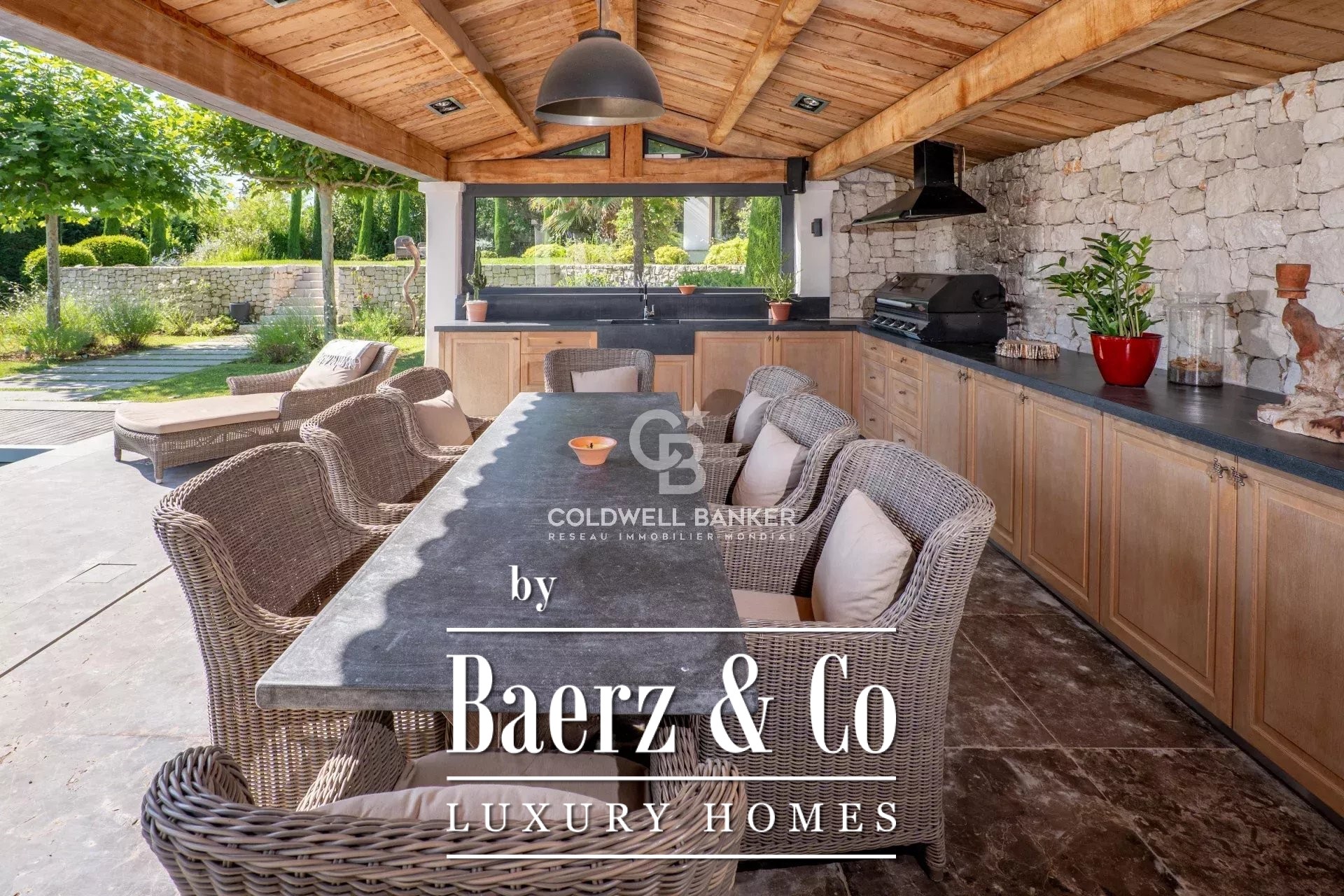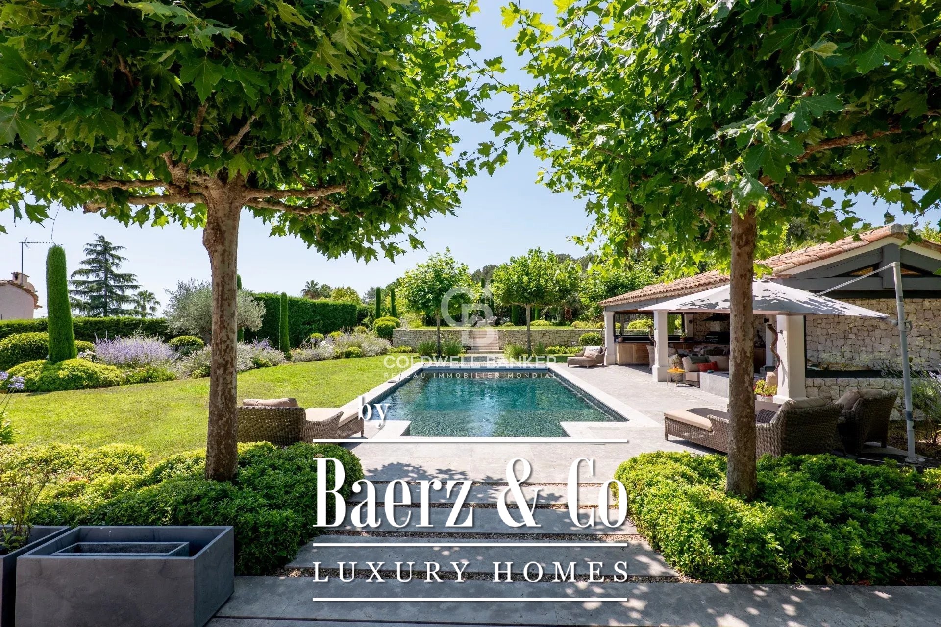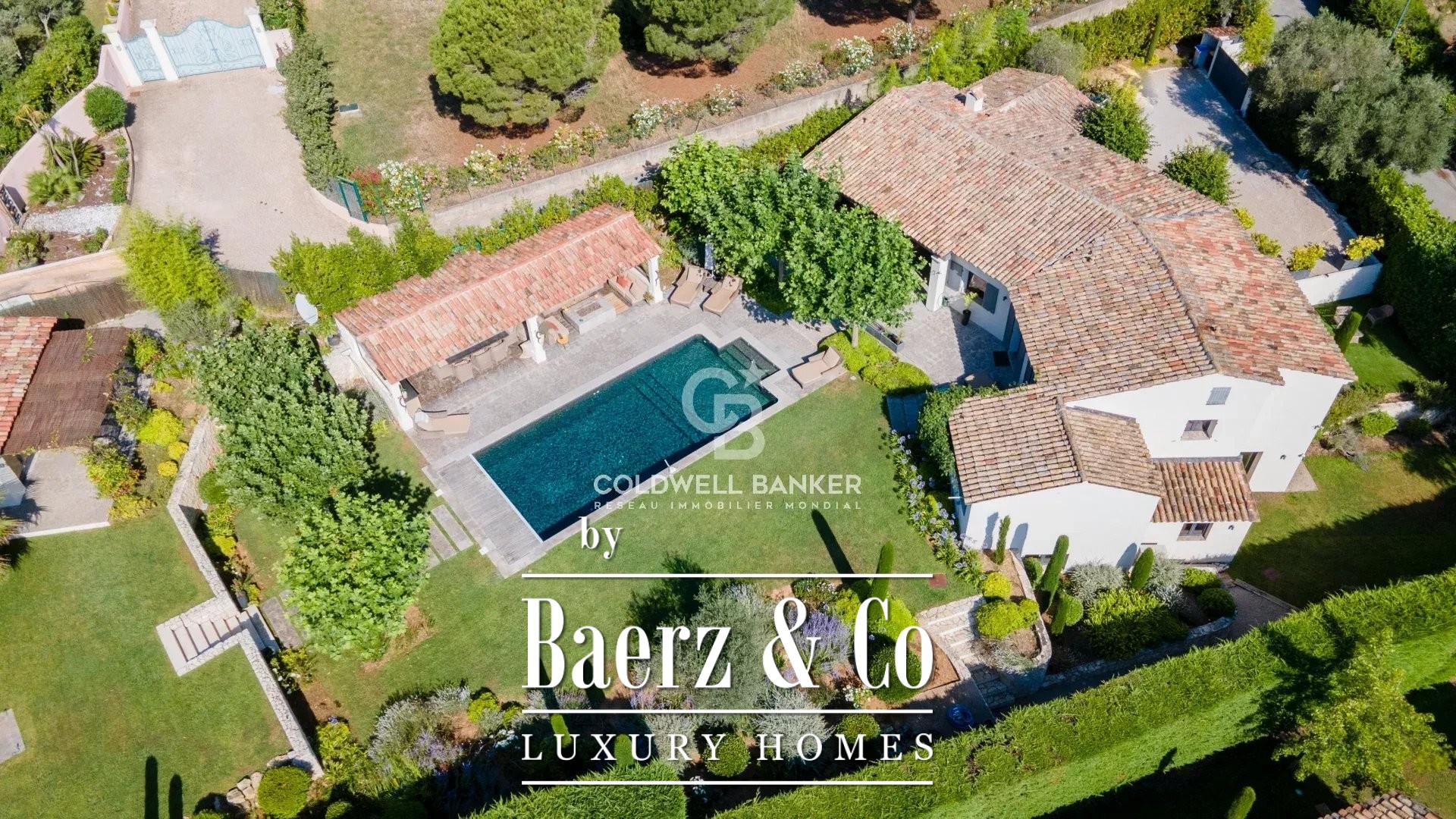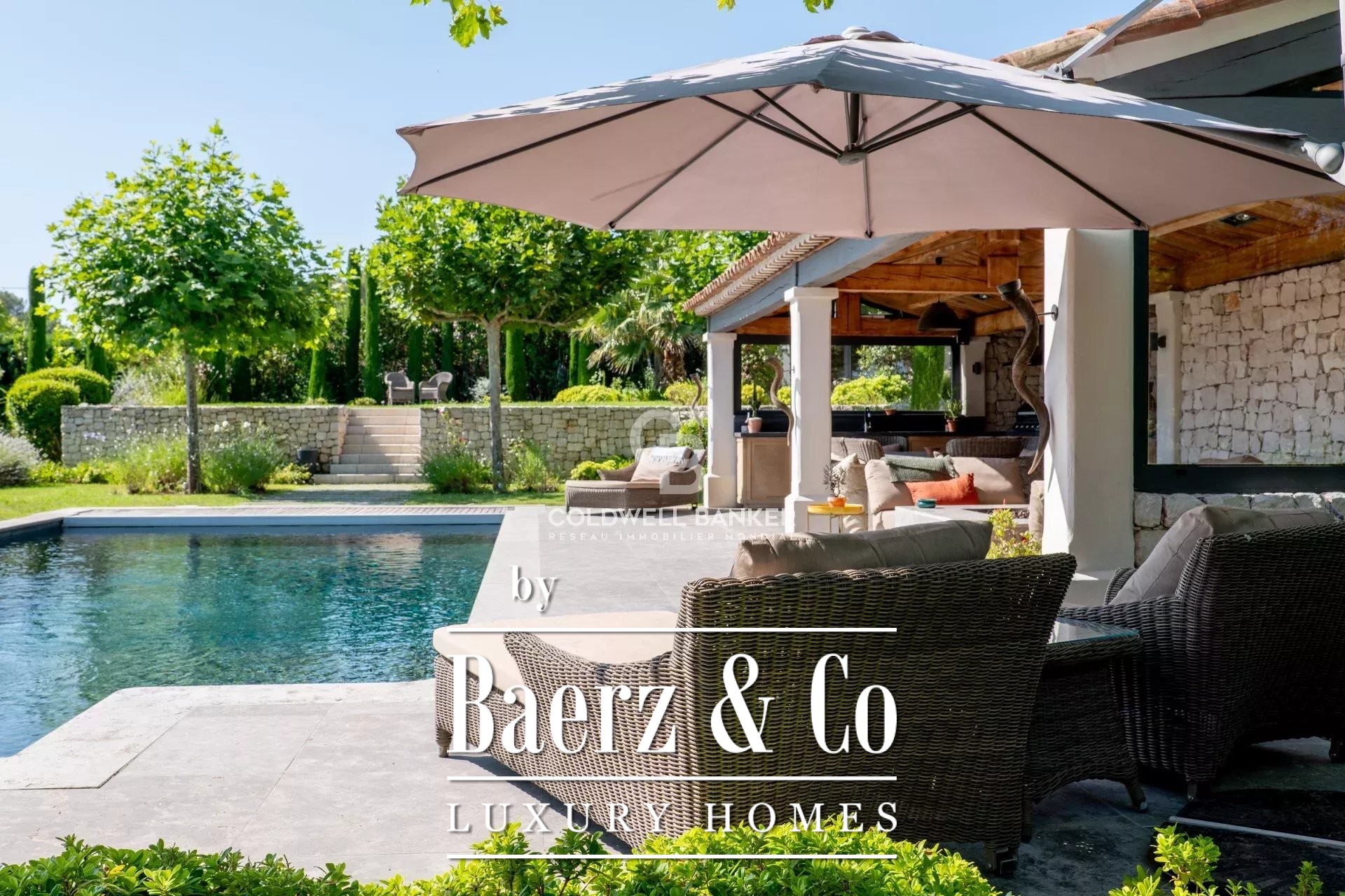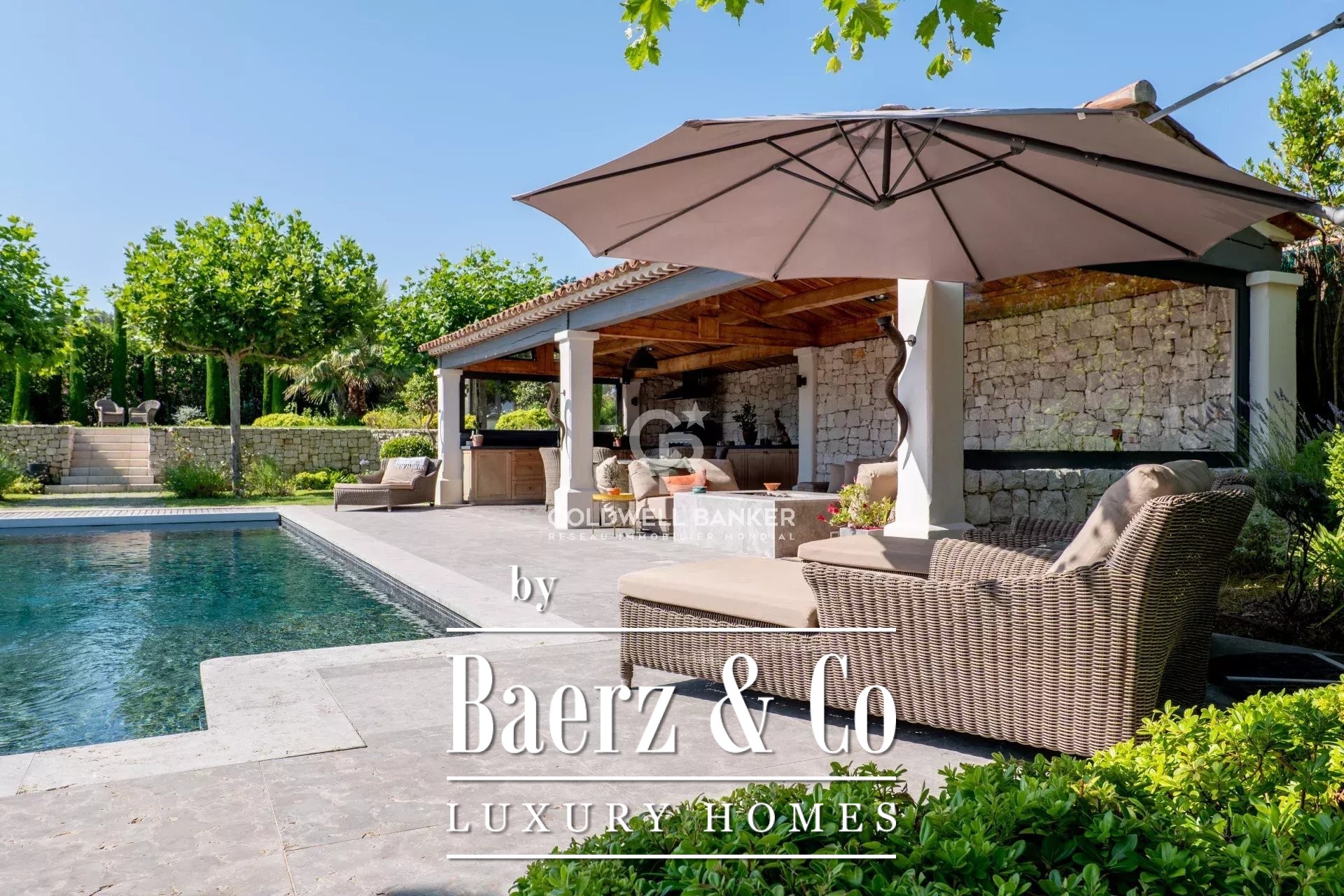 Outdoors, the atmosphere evokes calm social gatherings: a striking swimming pool, 130 m² pool house with brazier and summer kitchen, framed by mature gardens. Facilities including air-conditioning, fireplace, carport for two cars, and enhanced security. This villa for sale in Mougins invites a life at ease, in discreet proximity to local culture and global connectivity.