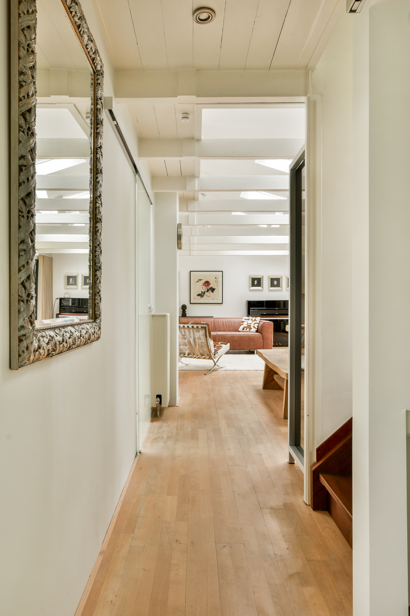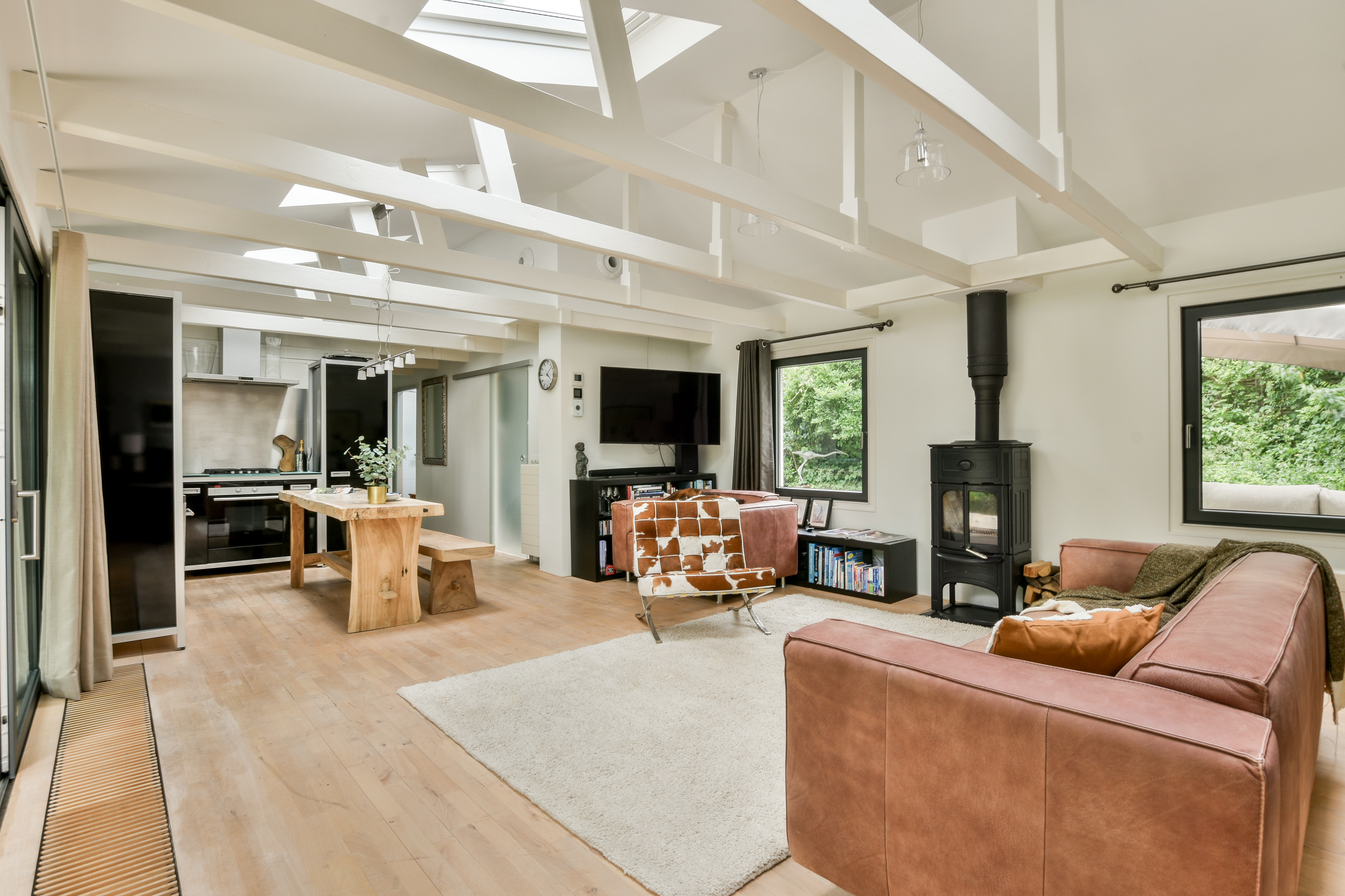 The living room forms the heart of the home and features a solid beechwood floor, a fireplace and large sliding glass doors leading to the floating terrace. Here indoor and outdoor living blend seamlessly, allowing you to enjoy the calm of the water all year round.