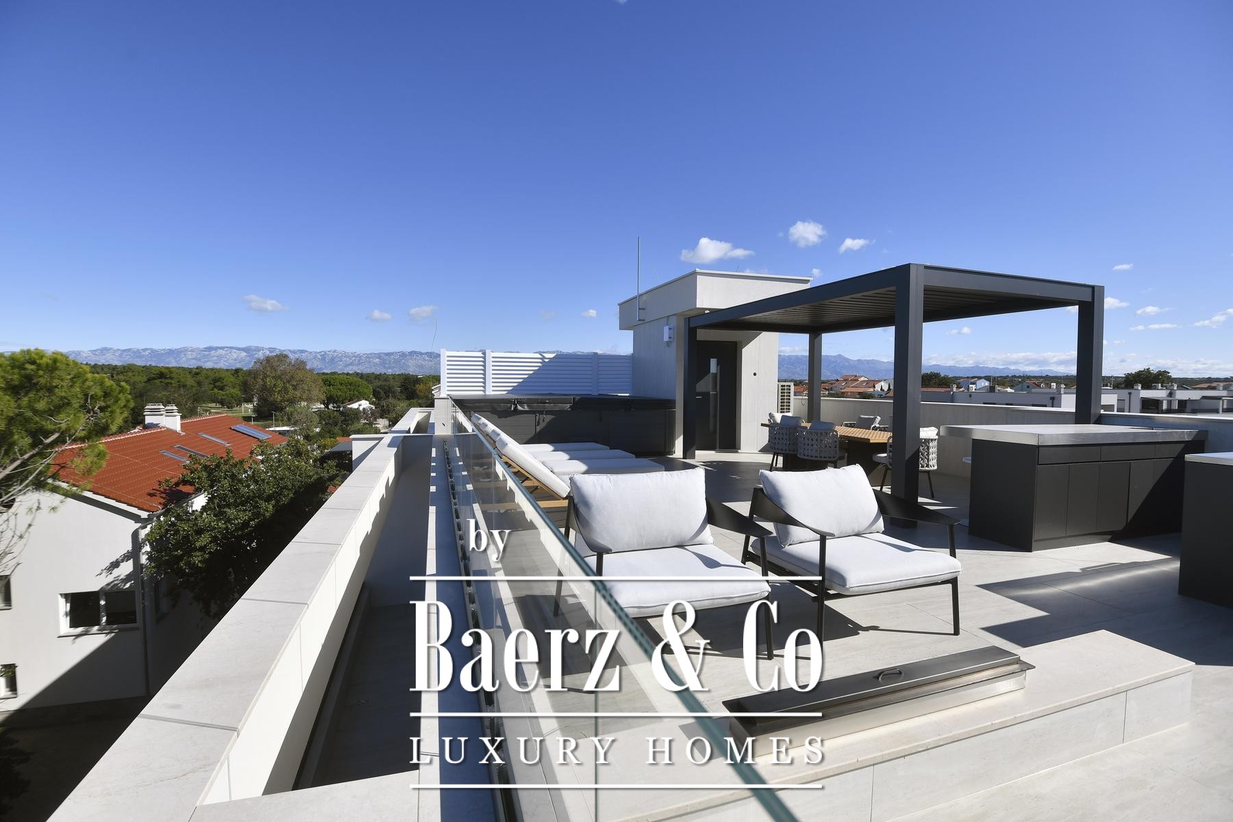 Zadar, Zaton, just fifty meters from the azure Adriatic Sea, presents this exceptional penthouse - a masterpiece of contemporary architecture and design in one of the most exclusive locations. With a total area of an impressive 231.84 m², enriched with spacious terraces and a private garage, this residence offers an unparalleled level of comfort and luxurious living.When you step into this penthouse, you will be greeted by a spacious living room illuminated by natural light through large glass walls that open to the sea and terrace, creating a seamless transition between indoor and outdoor space. Discreet luxury is visible in every detail: a steam fireplace with changing flame colors, a top-notch Sonos sound system and ambient lighting create an atmosphere of peace and elegance. Handcrafted furniture perfectly complements the refined interior, while carefully selected materials promise top quality and longevity. The kitchen, equipped with state-of-the-art Miele appliances, features an elegant waterfall island with LED lighting and granite countertops - the ideal place for culinary delights and socializing.Three luxurious bedrooms are designed with an emphasis on comfort, style and complete privacy, each with a sea view. The master bedroom offers additional luxury with its own bathroom and built-in wardrobes. All bathrooms are equipped with modern Hansgrohe faucets, walk-in showers, underfloor heating and impeccable finishes, guaranteeing a spa-like experience within your own home. An additional guest toilet, a fully equipped laundry room and a functional storage room ensure maximum practicality in everyday life, making this