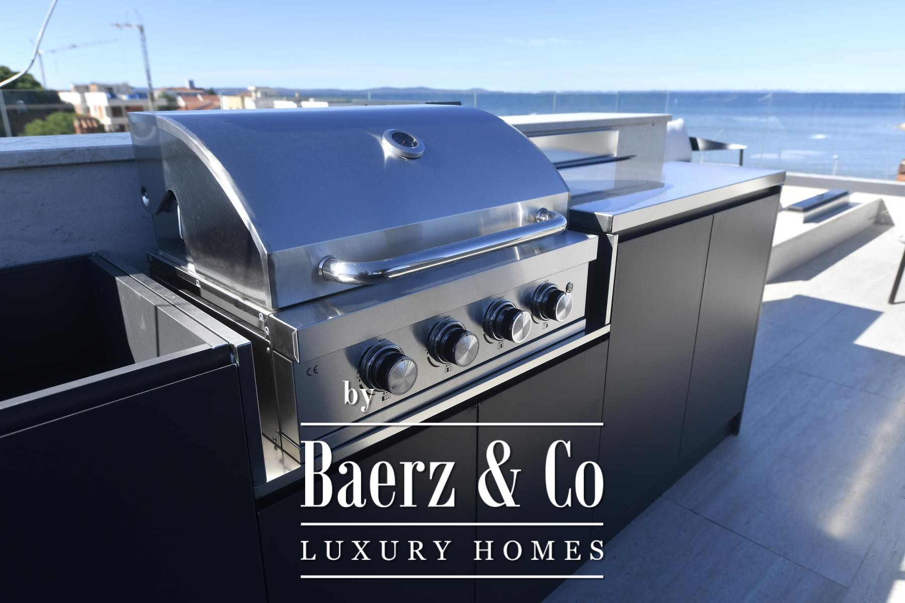 property perfectly thought out for modern needs.This penthouse also offers unique features that set it apart. A private elevator leads directly to the apartment, ensuring exclusive access and complete privacy. Every detail exudes top-notch workmanship - from decorative lighting and wooden panels to the intelligent control system (Smart Home KNX - Siemens/ABB) that controls the blinds, lighting, heating and air conditioning in all rooms. The apartment is fully air-conditioned, equipped with Sonos sound system and Samsung smart TVs, with the option of installing Starlink connection for seamless connectivity with the world.The crowning glory of this property is the spectacular roof terrace. Here is a private 9 m² jacuzzi and an elegant lounge area with multiple terraces, ideal for morning relaxation with coffee, afternoon rest with a book or evening enjoyment of enchanting sunsets over the Adriatic. Practicality is ensured with three parking spaces, one of which is closed and equipped with an EV charger, further confirming the thoughtfulness and exclusivity of this offer.This penthouse is ready to move into immediately and is the ideal choice for those looking for the perfect balance between luxury, privacy and the Mediterranean lifestyle. Whether it is a family residence, a prestigious second home by the sea or a profitable investment for exclusive rental, it is a unique opportunity that combines design, state-of-the-art technology and a unique location. A home that exceeds all expectations and turns luxury into everyday life, without the need for additional investments.Feel free to contact us for any additional questions.