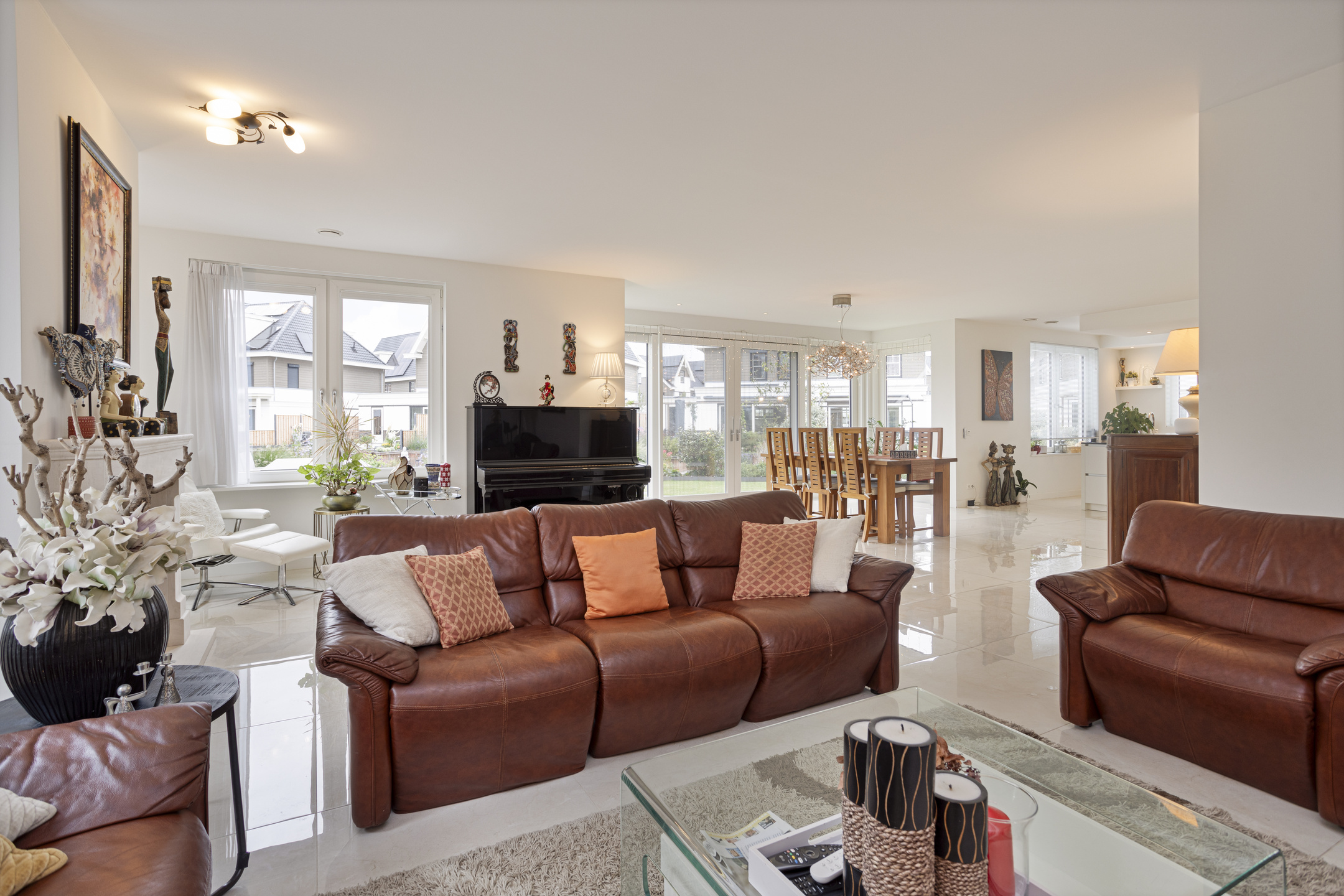 Upstairs, four large bedrooms accompany three elegant bathrooms. The principal suite features an extensive dressing room with crafted storage and a full ensuite. Additional features include a separate laundry, technical room, and a spacious attic. Located near Landskroonpark, with schools, shops, and key amenities easily reached, this luxury villa for sale in Oegstgeest merges a rare waterside setting with true contemporary ease.
